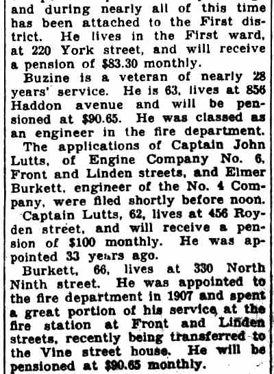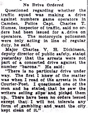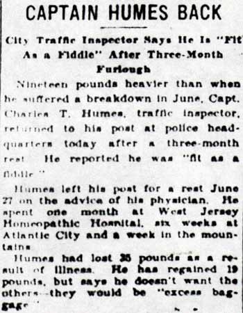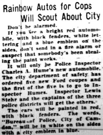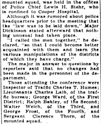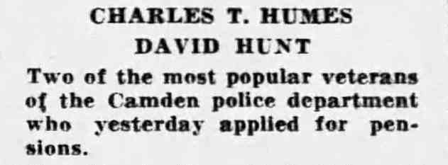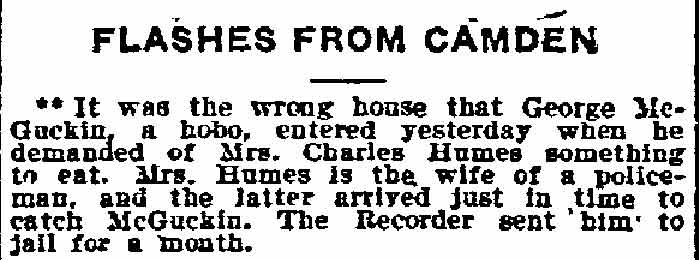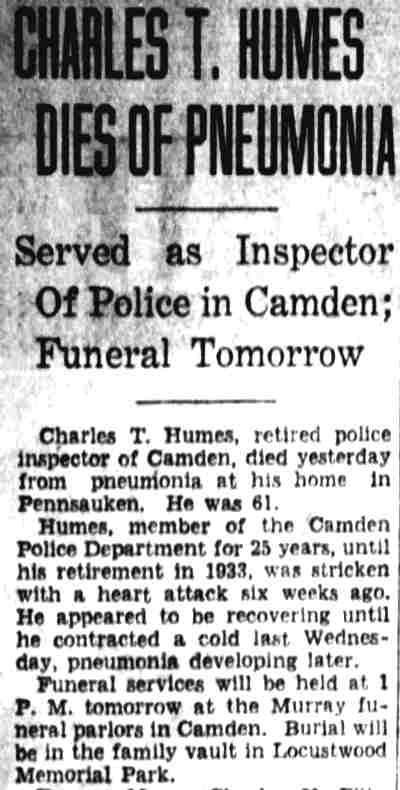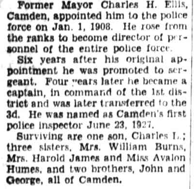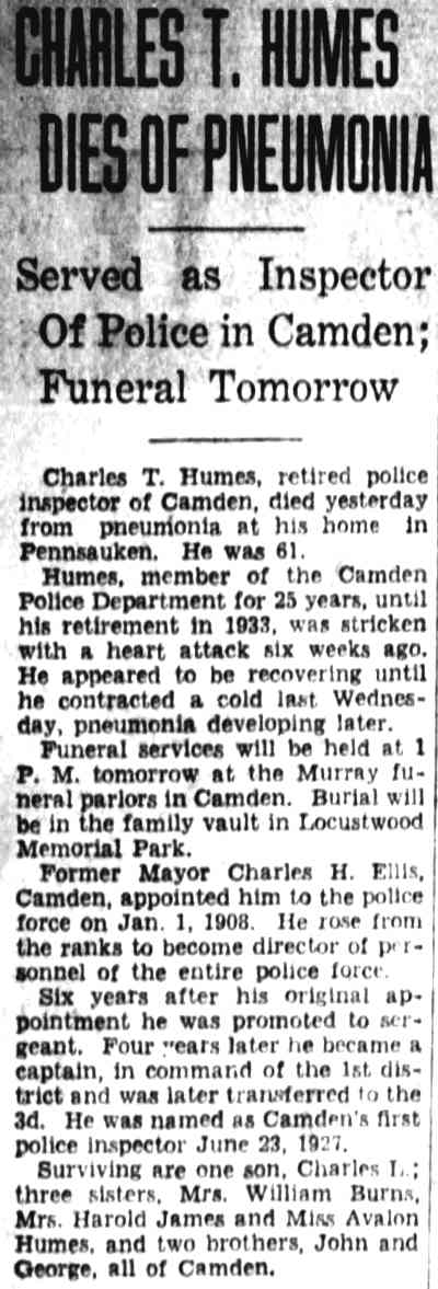 CHARLES TAYLOR HUMES JR. was born in Camden NJ to Charles T. and Mary Humes. Four years of age at the time of the 1880 Census, he was the oldest child, his brother George having been born in 1879. The elder Humes worked as a spar maker, lumber and shipbuilding both being major sources of employment in Camden at the time. The Humes family lived at 907 Front Street at the time, and would through at least 1889. During the late 1880s the elder Humes worked as a ship's carpenter for Rufus G. Wilkins, a Philadelphian who ran a boats for hire business at the foot of York Street, a stone's throw from the Humes residence. The 1890-1891 Camden City Directory shows that Charles T. Humes Sr. had become a ship's pilot, and that the family had moved to 90 Erie Street. Charles T. Humes Jr. joined the Camden police force, and by 1920 had risen to the rank of Captain. At the time of the 1920 Census he lived with his wife Lydia and son Charles L. Humes at 907 North 3rd Street, in the same North Camden neighborhood in which he had grown up. His brother George lived around the corner at 908 North 2nd Street with his wife Ivy and their 10 children. It is likely that the brothers could walk to each others homes by going out their back doors. In the 1920s, Captain Humes worked in the Camden Police Department's traffic bureau. In the spring of 1928 he took ill. He spent a month at West Jersey Hospital, and after a two month recuperation he returned to the police force. When the census was taken in April of 1930, Captain Charles T. Humes wad become a widower. His son, Charles L. Humes had married, was working as a reporter, and then lived with his in-laws at 203 Byron Street. Captain Humes, then 54, was still working as an inspector with the traffic bureau. Brother George, now the father of thirteen children, still lived at 918 North 2nd Street. By May of 1934, he had retired from the police force. Captain Charles T. Humes died on November 4, 1937. He had been living at 4115 Myrtle Avenue in East Camden. When the 1947 Camden City Directory was compiled his son Charles L. Humes, a journalist, was living at 2924 North Constitution Road in the Yorkship Square neighborhood of Camden. Daughter-in-law Nina Humes was then the secretary to Camden's Chief of Police. George and Ivy Humes were still at 908 North 2nd Street, a block away from where the Humes brothers were born in the 1870s. Charles L. Humes had a long and distinguished career as a reporter and columnist for the Camden Courier-Post. |