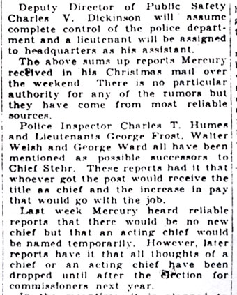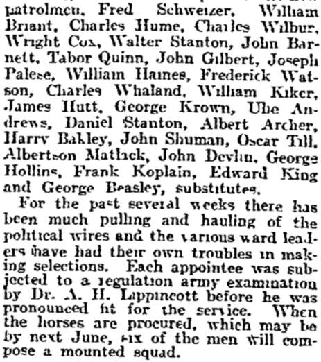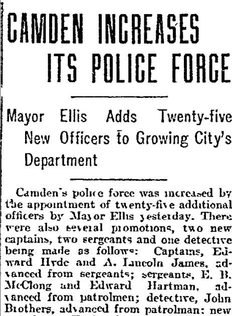 POLICE ESCORT FUNERAL OF FORMER CHIEF HYDE A police motorcycle squad under the command of Inspector Humes acted as escort today at the funeral service of Edward S. Hyde, former police chief and a. member of the board of freeholders, who died Sunday. Services took place at the home, 832 Haddon Avenue, and burial was in Harleigh Cemetery. Members of the police detail were Sergeant jefferson kay, patrolmen Thomas Kauffman, William Moll, John Stanton, Thomas Welch and James Wilson. Hyde was appointed to the police force in April, 1894, and pensioned July, 1923. He succeeded Chief Gravenor when the latter resigned in 1922. Long interested in politics, he was elected freeholder two years ago. He is survived by his widow, Mina B. Hyde, and three daughters, Mrs. Marion Garlan, Mrs. Mary Van Hart and Emma Hyde.. |