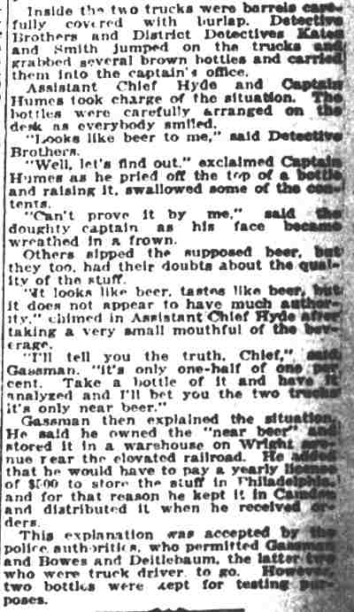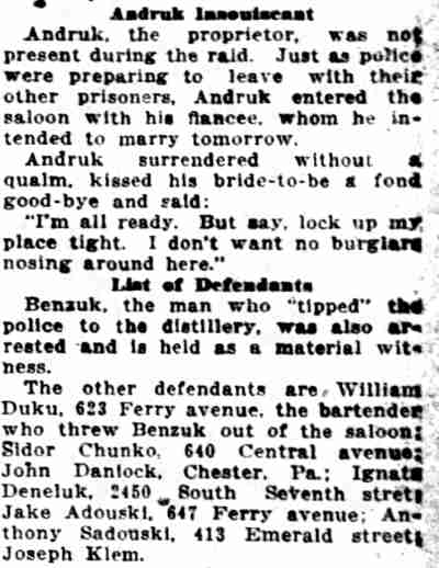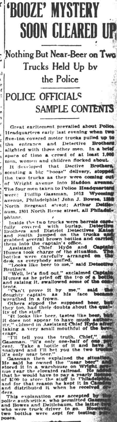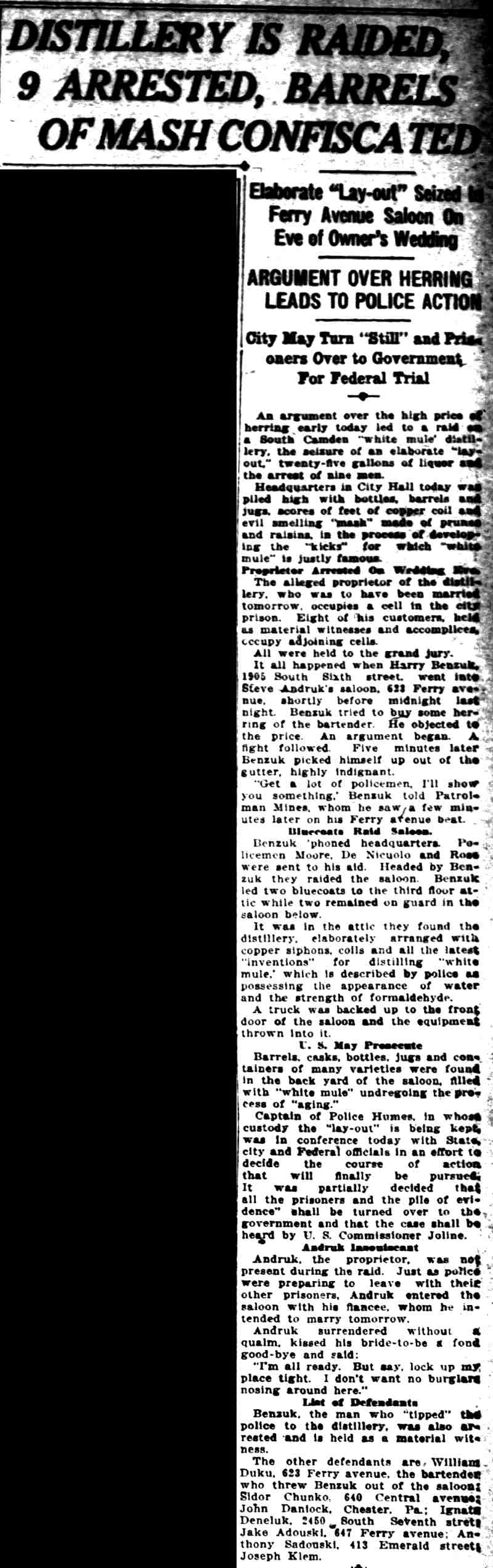 Murdering one jailor and wounding another with a revolver that had been smuggled into them by outside confederates, Wilson T. Ashbridge, slayer of Mrs. Elizabeth Dunbar, and Francis Murphy, alias George E. Thompson, a check forger, made their escape from the county jail a few minutes before seven o'clock last night. Ashbridge with his wife was caught at noon in the Keystone Hotel in Chester PA where they registered at one o'clock this morning. Thompson is still at liberty but from the confident manner of Prosecutor Kraft his early arrest seems assured. The murdered jailor was Isaac Hibbs, aged 65 years of 913 South 8th Street. The wounded keeper is Joseph Ellis, aged 45 years, of 416 Carteret Street. Shot twice, he is in Cooper Hospital. His condition today is very satisfactory. Thompson, who is 41 years old, forged a check for $650 which he gave to V.M. Fulton as part of the purchase price of an automobile. The forgery was discovered before the deal was completed and his arrest followed on June 8. he also passed a forged check for $15 on State Motor Vehicle Agent Kraft. He, too, was awaiting trial. In spite of the positive evidence against him Thompson had spurned all efforts to have him plead guilty and it is now believed that he was sparring for time while hatching a plan to escape. He s no doubt the master mind. R.L. Hunter, a farmer of Bensalem Township, Bucks County PA, about four miles above Torres dale, reported to the Philadelphia police the morning that he had seen a man answering Ashbridge's description on the Bucks Road at daylight. The man asked the way to Riegelsville. According to Hunter, the man was dressed in a dark suit, and had no hat. His clothing was wet. Hunter did not see anything suspicious in his actions, and after giving him directions, they parted. Upon seeing the paper with a picture of Ashbridge, the farmer was struck by its resemblance to the man with whom he had talked. He hurried to Tacony and notified the police. The State police, who patrol that section of the county, and who have an office at Langhorne, were immediately notified as were the surrounding towns. The shootings took place in different parts of the jail. Hibbs was murdered in the exercise room just outside the cell room on the Sixth and Arch corner of the building. Ellis was shot down in the corridor just outside the Market Street end of the building when he heroically grappled with Ashbridge after the latter had pointed a gun at his head. In spite of his wounds Ellis dragged himself to a telephone and after notifying Police Headquarters of what had happened he collapsed. Only one of the two bullets is still in Ellis. It entered the groin on the right side and is buried in the muscles of the leg, having taken a downward course for seven or eight inches. The other bullet struck Ellis in the right breast and came out in the left breast, traversing the upper fleshy parts of the body. Hibbs was almost instantaneously killed by a bullet that went within an inch of his heart, producing a hemorrhage. The bullet was extracted this morning from the body early this morning in an autopsy performed at the morgue by County Physician Stem. In spite of the fact that it is pretty well established that three shots were fires in the attack on Hibbs, only one of the bullets took effect. "But it makes little difference which of the two men handled the gun" said Prosecutor Kraft this morning. "Both are equally guilty of this murder and what we are concerned about now is the recapture of the gunmen." Mr. Kraft added that it his purpose to examine all of the prisoners in that part of the jail where Hibbs was murdered to determine fully who fired the fatal shot. The escape had been carefully planned and timed to the minute. Of course the desperate prisoners were aided by confederates on the outside and it is the general belief that a high powered motor car was in waiting for them not far from the jail. They are known to have been in possession of money and openly boasted yesterday that it was their intention to leave the prison last night. These boasts were made to two young ladies connected with a religious organization who called on the tom men yesterday to offer spiritual reconciliation. The girls are frequent visitors to the jail and naturally their efforts at evangelization were directed in the main toward Ashbridge, because of the fact that he was accused of murder. These girls, whose identity officials will not disclose, were closeted with Prosecutor Kraft until one o'clock this morning. Both declared that on their visit yesterday they were told by Ashbridge and Thompson that it was the last day they expected to spend in jail. "We are going to get away from here tonight and we've got money to help us after we are out " said Ashbridge, who further told the girls he had considerable cash sewed up in the waistband of his trousers. The girls begged the prisoners not to do anything that would cause them more trouble and they told the Prosecutor that Ashbridge and Thompson promised them that they would not make any effort to escape. In their talks with the girls neither of the prisoners said a word that would indicate that they would kill if necessary to escape. The full force of their boast did not dawn on the religious workers and for this reason it never occurred tot hem to inform the Sheriff of what the prisoners had in said. A general jail delivery of at least all the men confined in hat is known as the untried department, where the two were held, was only averted by the prompt arrival of the police on their beat, which was made easy by means of the keys taken from the prostrate body of Hibbs. Ashbridge and Thompson left all of the doors open and the vanguard of the inrushing police found the prisoners swarming all over the corridors on the east side of the prison. In the wild excitement following the double shooting and escape none else thought of freedom and a checking up of the inmates after they had been h