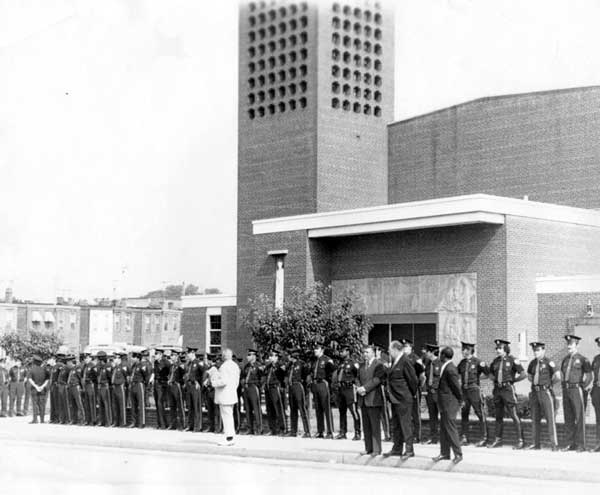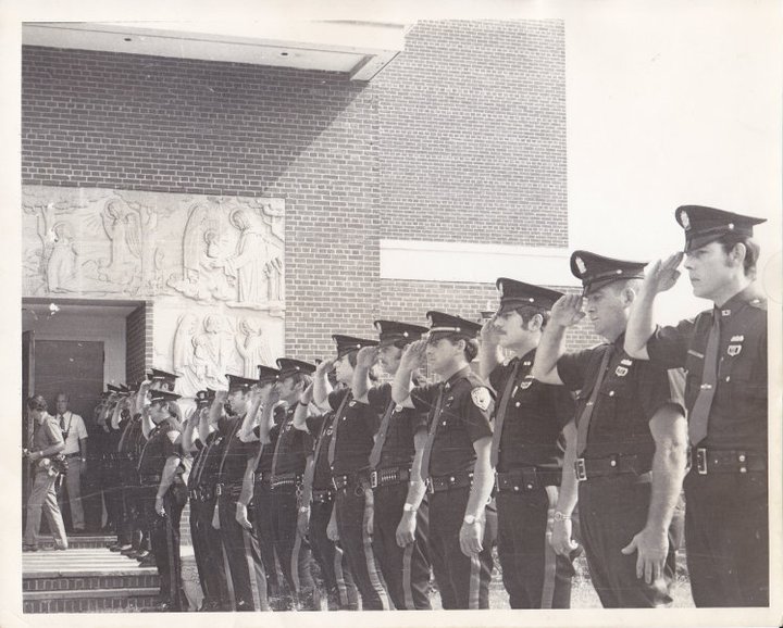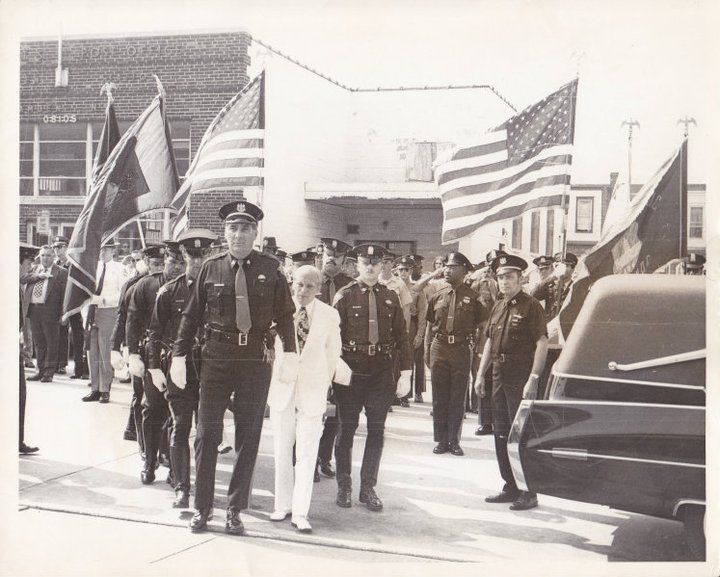 Camden Police at Officer Elwood Ridge's funeral service, St. Joseph's Pro-Cathedral on Federal Street in East Camden. The Esst CAmden Post Office, directly across the street from the church, is in the background. This is Sgt. Al Randazzo and members of Elwood's Platoon and Partner. |