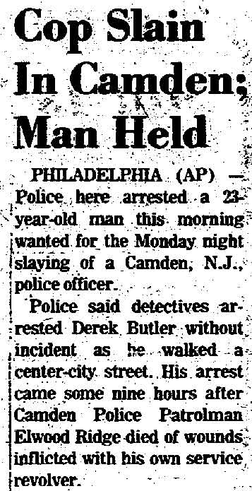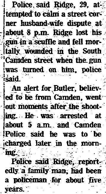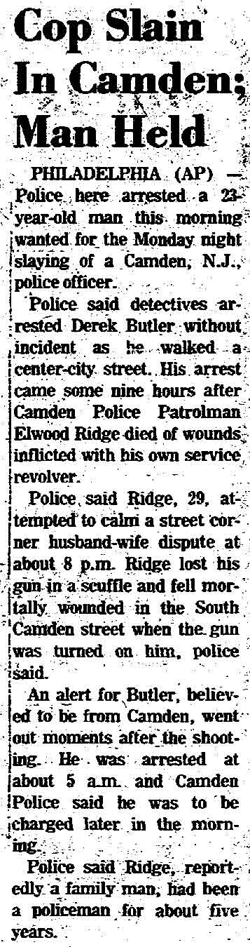 ELWOOD RIDGE was born on May 21, 1944. He grew up in the the lower end of Camden County. His father owned the White Horse Motel on the White Horse Pike, and "Woody" Ridge lived there as a boy. He joined the Camden Police Department August 9, 1968. On July 2, 1973 he died in the line of duty. Officer Ridge, known to his brother officers as "Woody", was killed by gunshot wound from his own weapon which was taken from him while answering to a domestic dispute assignment. While attempting to separate the two offenders Officer Ridge's handgun was taken from his holster and he was shot. Officer Montell Williams was the first officer on the scene after was shot. He related in November of 2002: "Woody was never dispatched to the domestic but drove up on it at the corner of broadway and Van Hook Street. After being shot he walked across the street to Rudolph's Original Liquors and asked for help. The man inside helped him lay down and loosened his clothes to aid his breathing then called the police. Three of us arrived almost simultaneously at the scene, there was me and my partner Bill Athey and Woody's normal partner Chet DeShields. Chet and Woody were more than just regular partners, they were very close friends even off duty." A large funeral was held for officer Ridge. The Philadelphia Police Department provided manpower for traffic duty to free up Camden officers so they could attend the funeral The shooter, Derrick Butler, was arrested by Philadelphia police for throwing bottles at cars and then bragged to them that he had just killed a Camden police officer. Derrick Butler was sentenced to life in prison. Officer Ridge was married, with no children. His wife was about four months pregnant at the time of his death. |