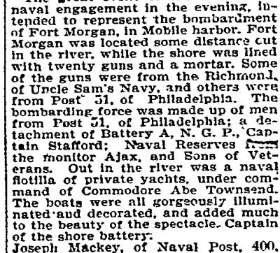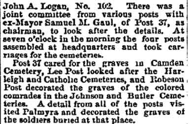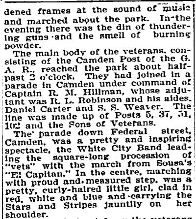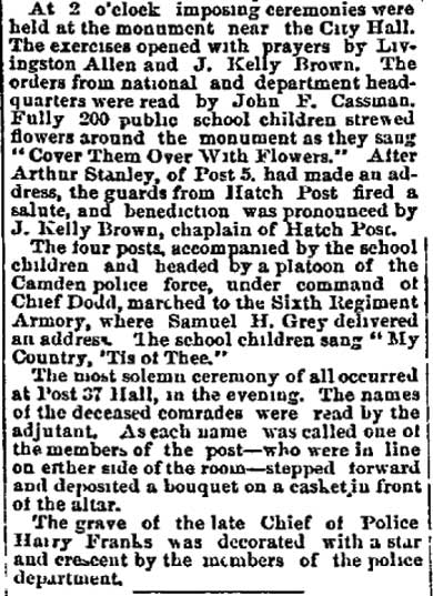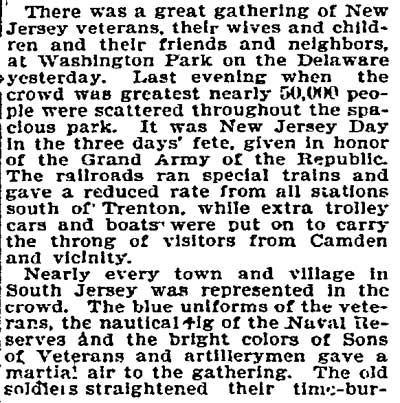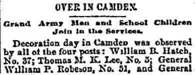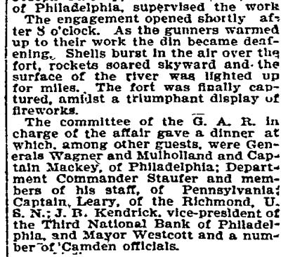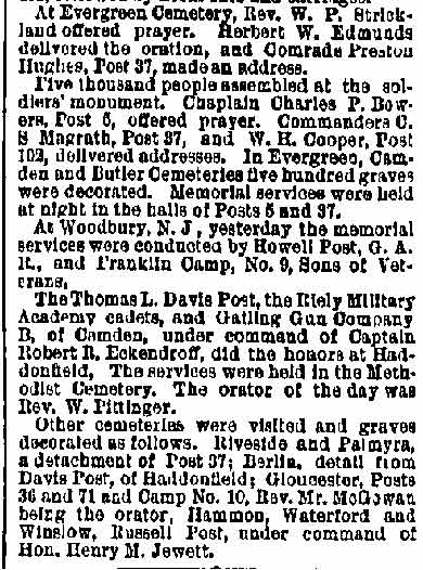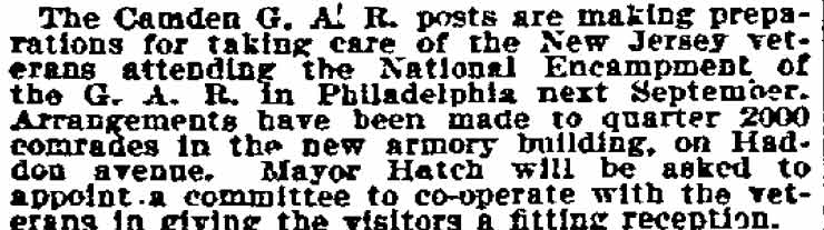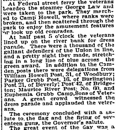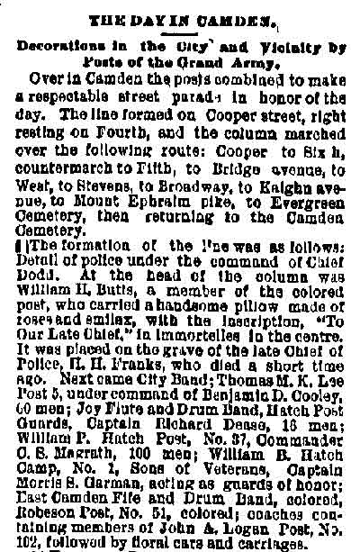 B. Hatch Post No. 37, G.A.R. William B. Hatch Camp No. 1, Sons of Veterans - William P. Robeson Post No. 51, G.A.R. General John A. Logan Post 101, G.A.R. Samuel Dodd - Benjamin D. Coley - Amos Dease - C.S. Magrath - Charles P. Bowers - Preston Hughes H.H. Franks - william h. butts - Rev. W.P. Strickland - Morris S. Garman Gatling Gun Company B - Captain Robert Eckendorff - East Camden Fife & Drum Band |