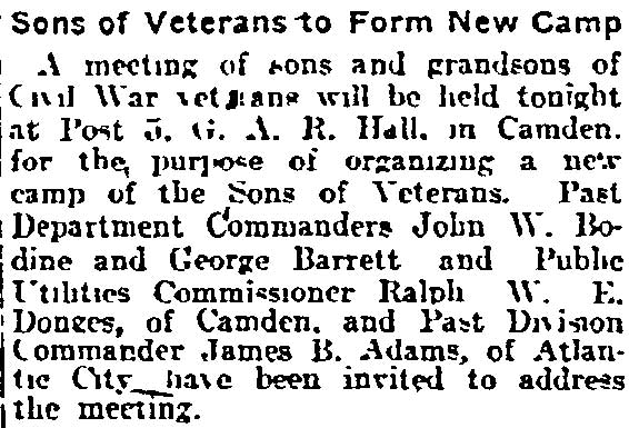 B. Hatch Post No. 37, G.A.R. William B. Hatch Camp No. 1, Sons of Veterans William P. Robeson Post No. 51, G.A.R. General John A. Logan Post 101, G.A.R. Samuel Dodd - Benjamin D. Coley - Amos Dease - C.S. Magrath Charles P. Bowers - Preston Hughes - h.h. franks - william h. butts Rev. W.P. Strickland - Morris S. Garman - Gatling Gun Company B Captain Robert Eckendorff - East Camden Fife & Drum Band |