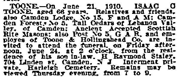 Lodge No. 15, F.&.A.M. Camden Forest No. 5, Tall Cedars of Lebanon Valley Thomas M.K. Lee Post No. 5, G.A.R. Linden Street - H. Raymond Staley - Isaac C. Toone |
