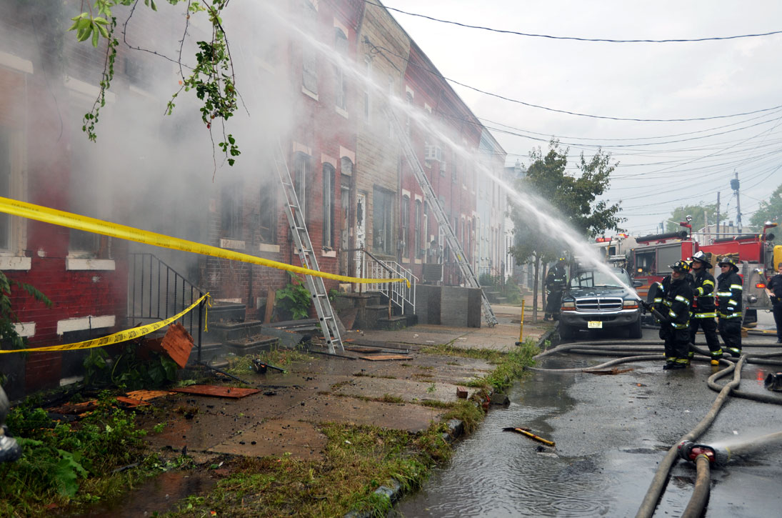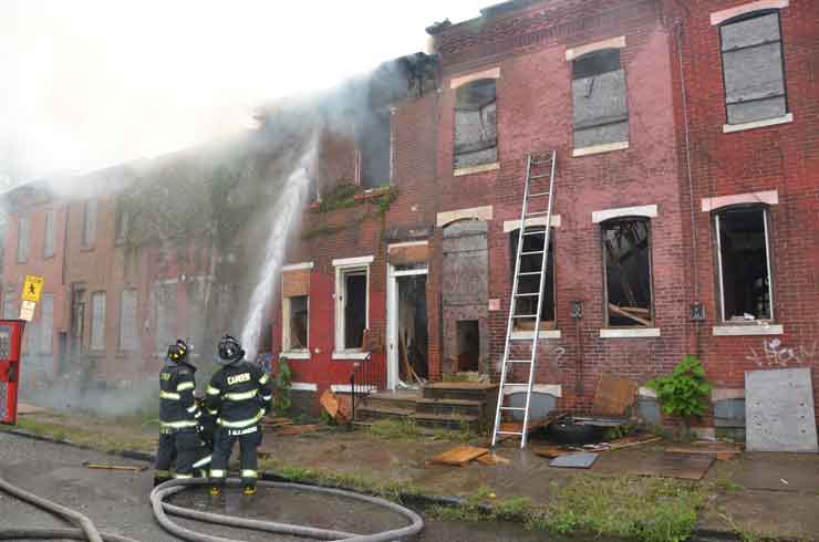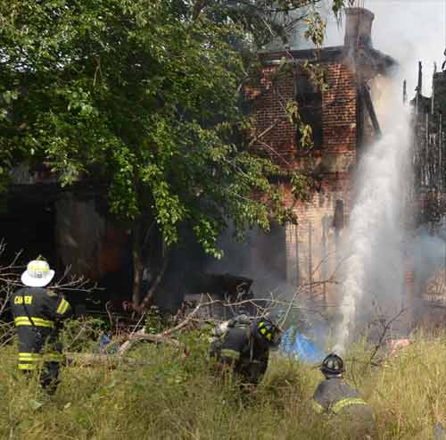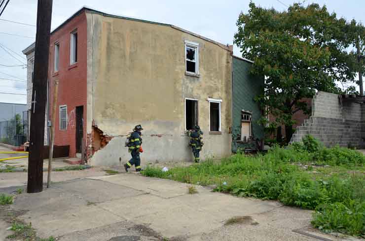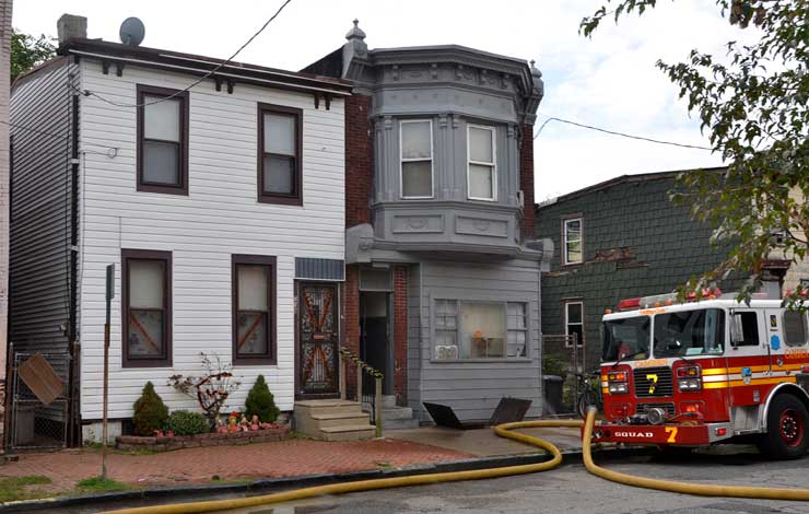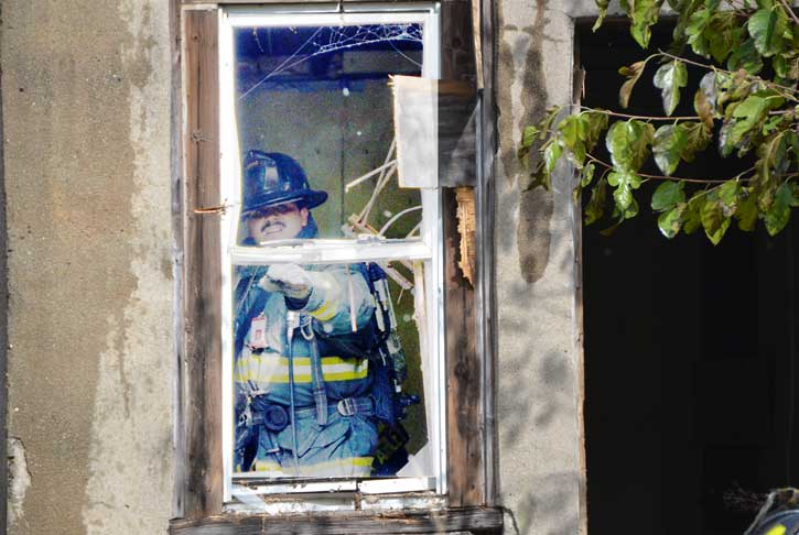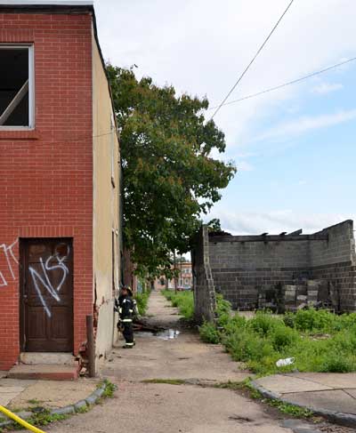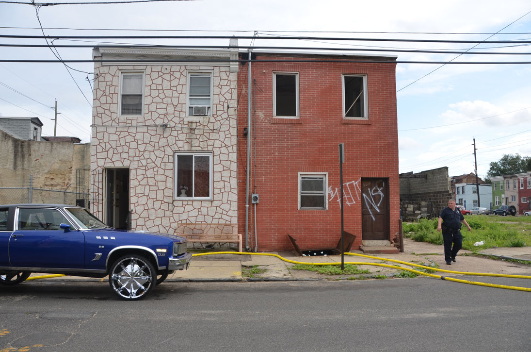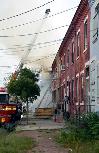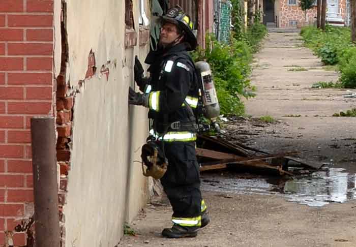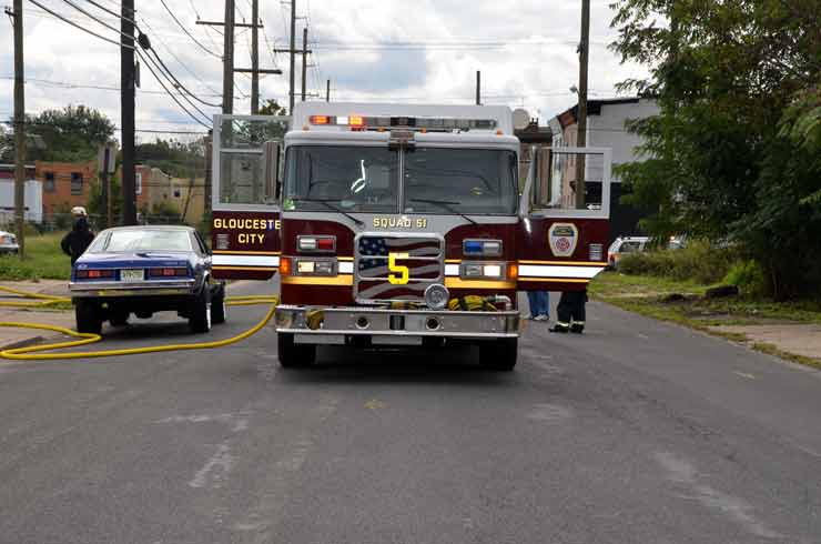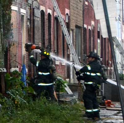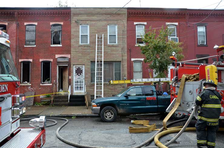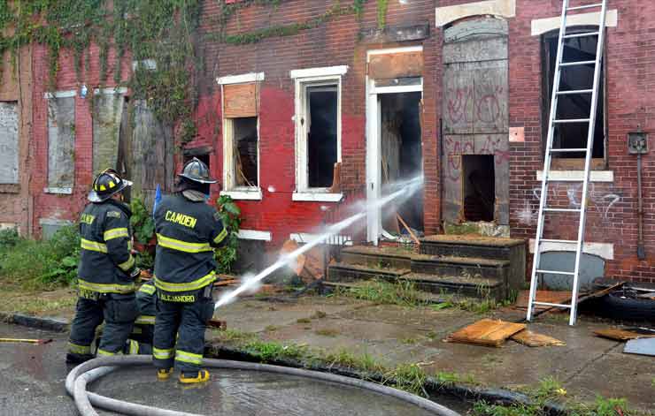 At approximately 11:54 AM Captain Frank Sandrock of the Camden Fire Department informed me that there was another fire being taken care of a few blocks away, at 908 South 3rd Street, the corner of South 3rd Street and Joint Alley. I drove over there, and found Gloucester City's Squad 51 on scene, accompanied by Camden Police Department officer Steven Fritz. A small trash fire in the basement of an abandoned end of row property had been extinguished. Collingswood's Ladder Company 16 arrived moments later. I took a few pictures, then returned to the 700 block of Walnut Street. |
