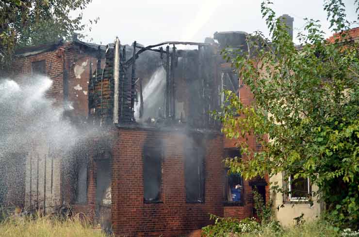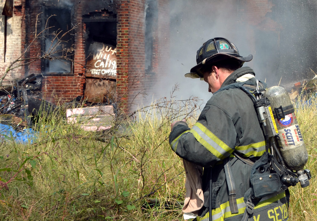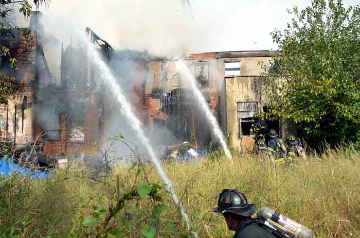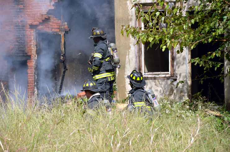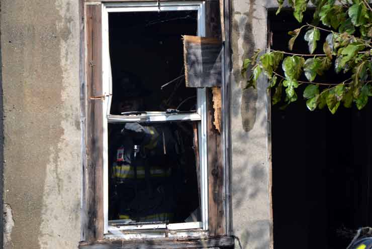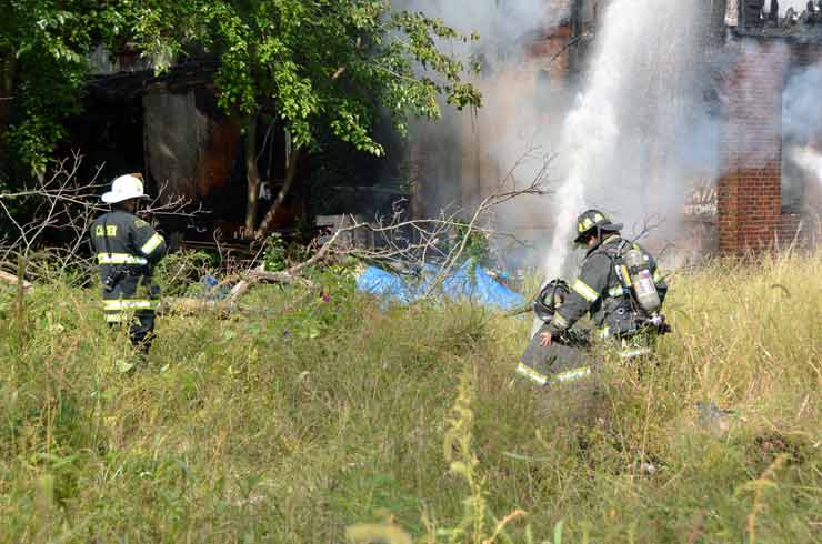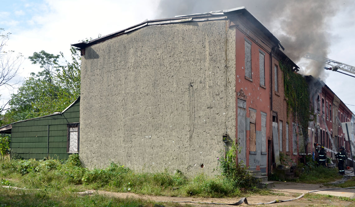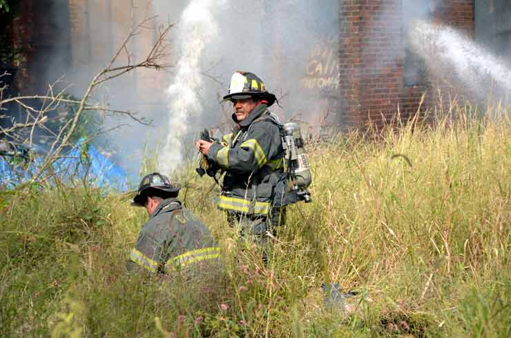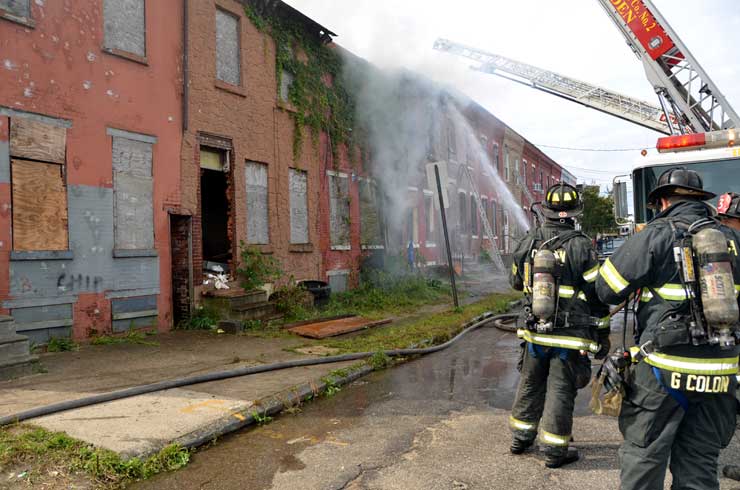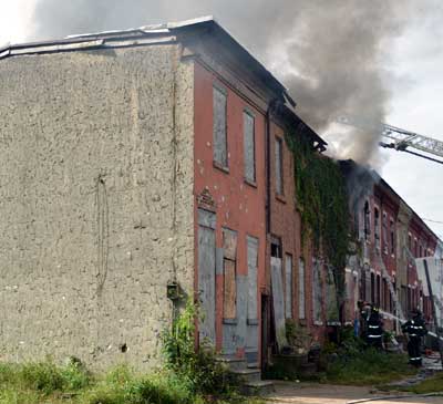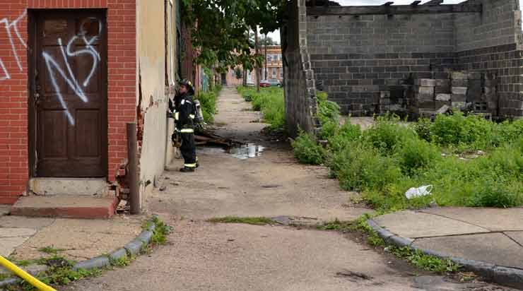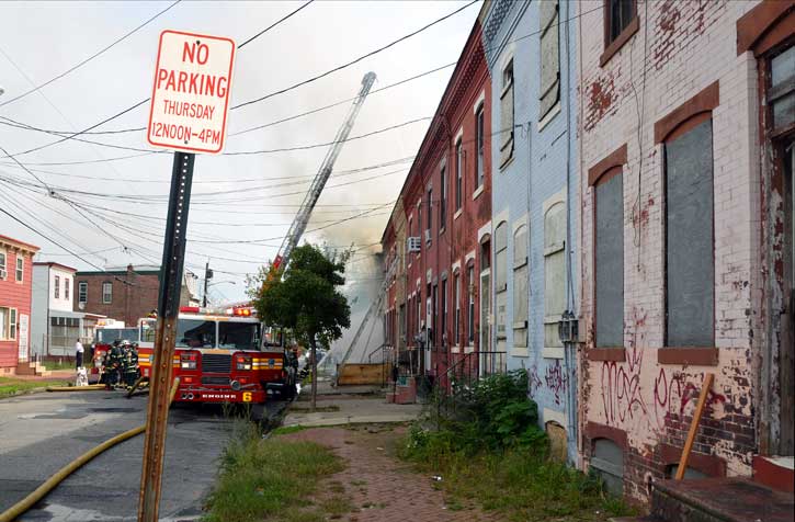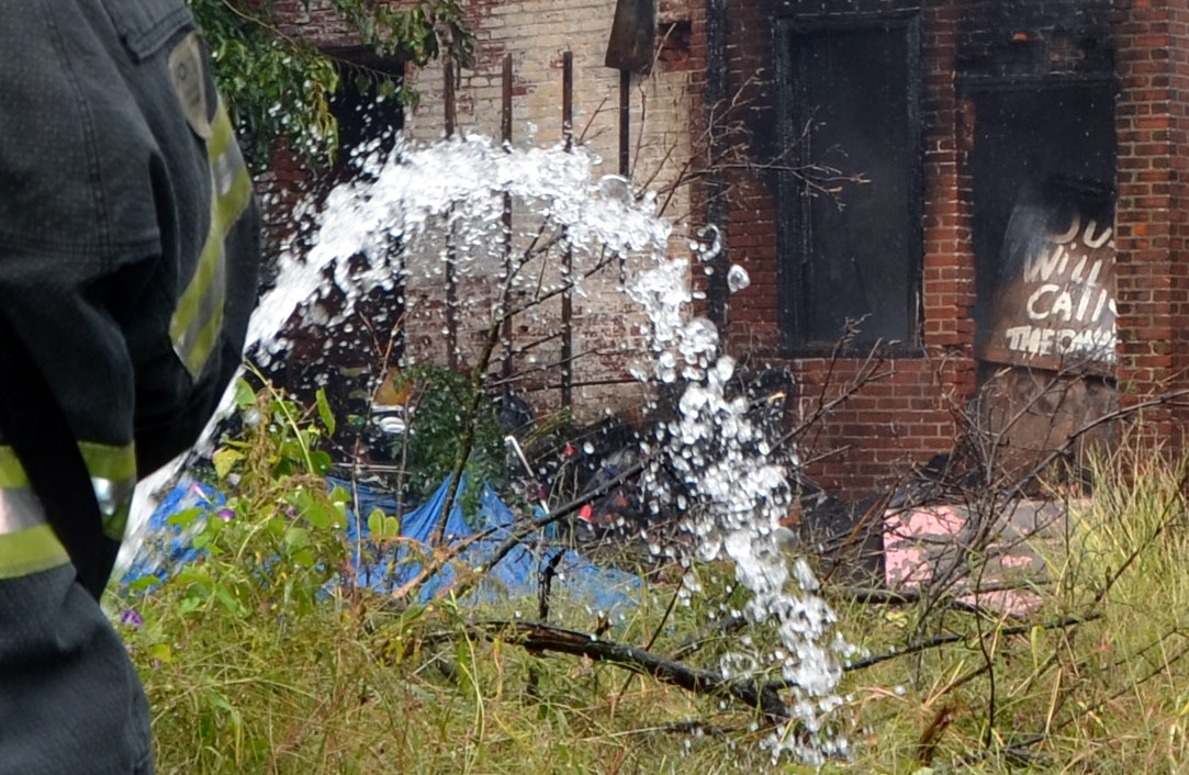 At approximately 11:54 AM Captain Frank Sandrock of the Camden Fire Department informed me that there was another fire being taken care of a few blocks away, at 908 South 3rd Street, the corner of South 3rd Street and Joint Alley. I drove over there, and found Gloucester City's Squad 51 on scene, accompanied by Camden Police Department officer Steven Fritz. A small trash fire in the basement of an abandoned end of row property had been extinguished. Collingswood's Ladder Company 16 arrived moments later. I took a few pictures, then returned to the 700 block of Walnut Street. |