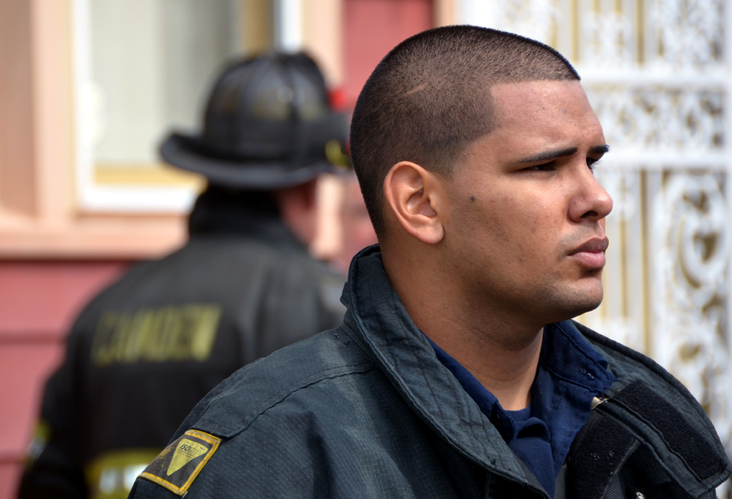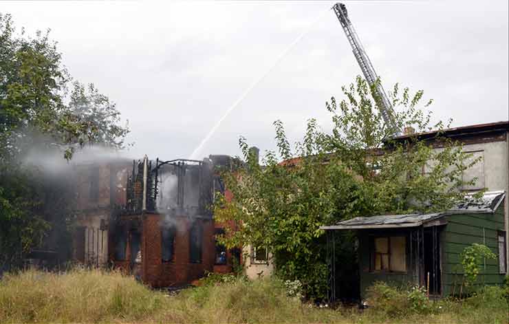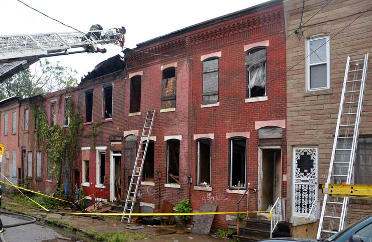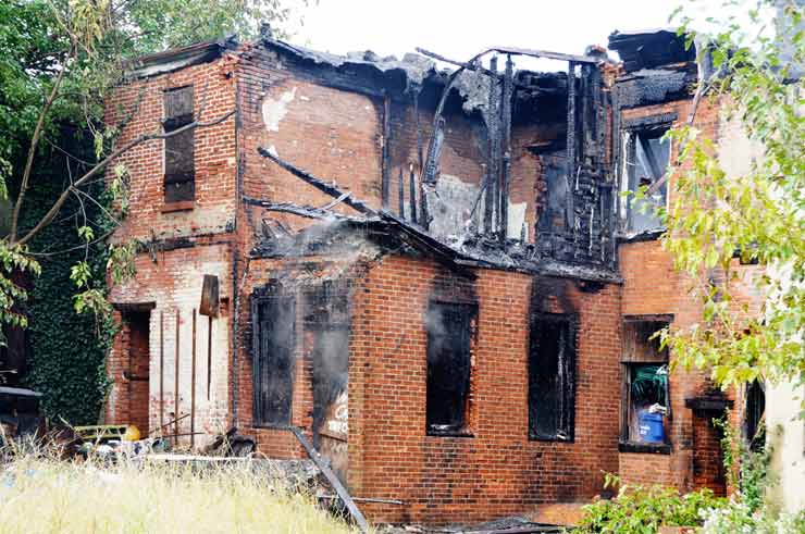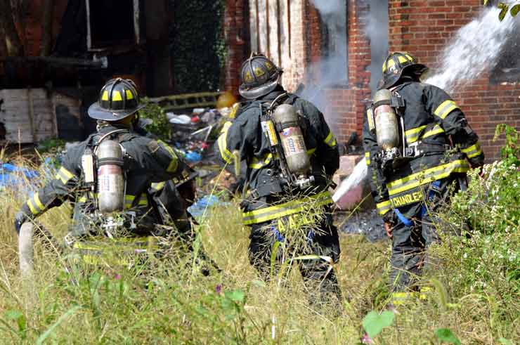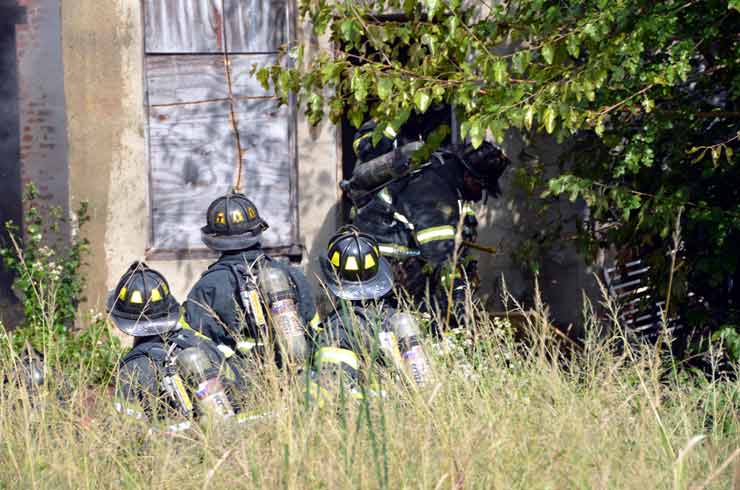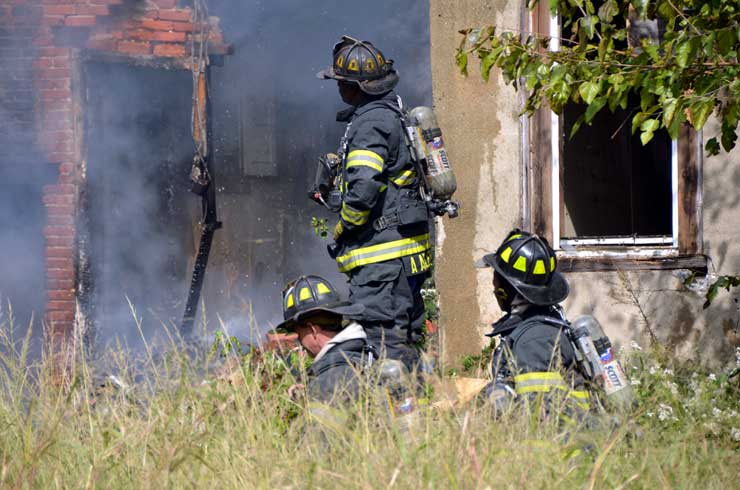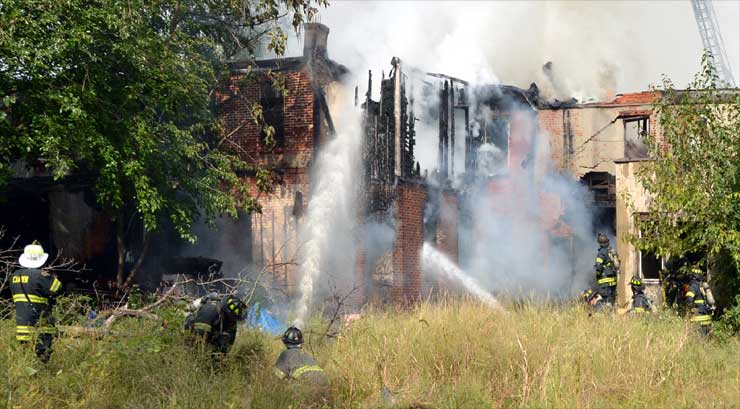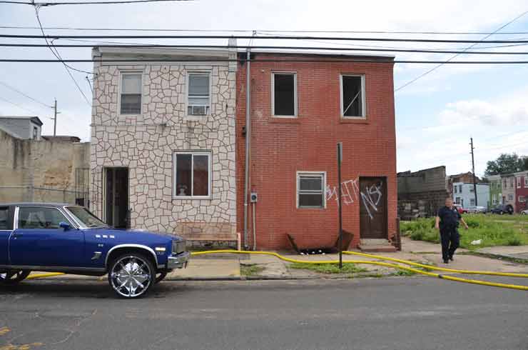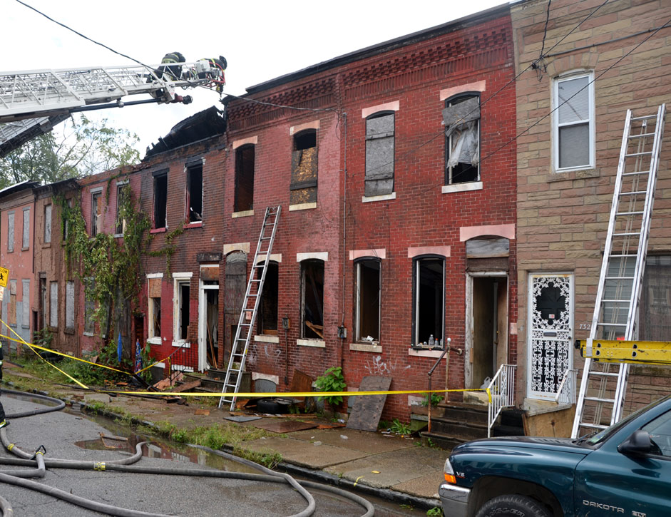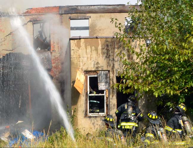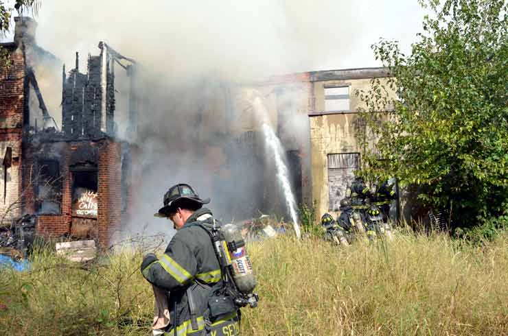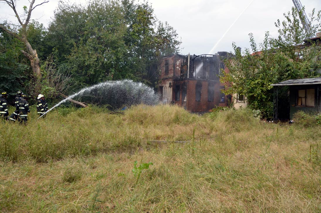 At approximately 11:54 AM Captain Frank Sandrock of the Camden Fire Department informed me that there was another fire being taken care of a few blocks away, at 908 South 3rd Street, the corner of South 3rd Street and Joint Alley. I drove over there, and found Gloucester City's Squad 51 on scene, accompanied by Camden Police Department officer Steven Fritz. A small trash fire in the basement of an abandoned end of row property had been extinguished. Collingswood's Ladder Company 16 arrived moments later. I took a few pictures, then returned to the 700 block of Walnut Street. |