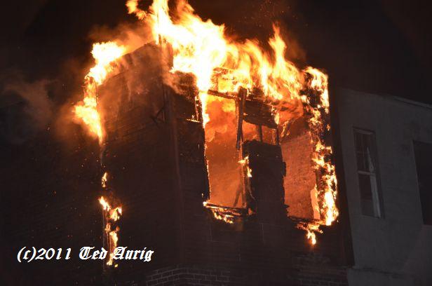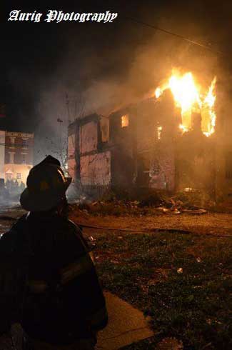 This page and the other pages in this series are the successors to the series of web-page about the Camden Fire Department called Camden Fire Department: The Fires of the Summer of 2011. On this and other pages in the series you will find pictures and information regarding different events and aspects of the fire service in Camden, New Jersey. At approximately 2:15 AM on November 11, 2011 a vacant two-story end of the row house at 915 North 5th Street in North Camden was reported to be on fire. This building and the adjacent houses at 907, 909, 911, and 913 had long been abandoned and had already been slated for demolition. Engine Company 1 arrived to find the fire had spread through the roof. Battalion 2 (BC Frank Saia) used all hands. Crews placed 2-1/2" hand lines and the Ladder Pipe in operation. The fire was placed at the 50 minute mark. Many thanks to Ted Aurig, who was the only photographer on scene and has made some pictures available. I had photographed these vacant homes that were involved in this fire on November 4, 2011, and these pictures are also on this page. As with the web page covering other Camden Fire Department events, if you can identify anyone that I've missed, please comment at the bottom of the page. (I'm terrible at at names and faces). October 28, 2011 |