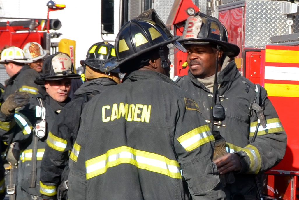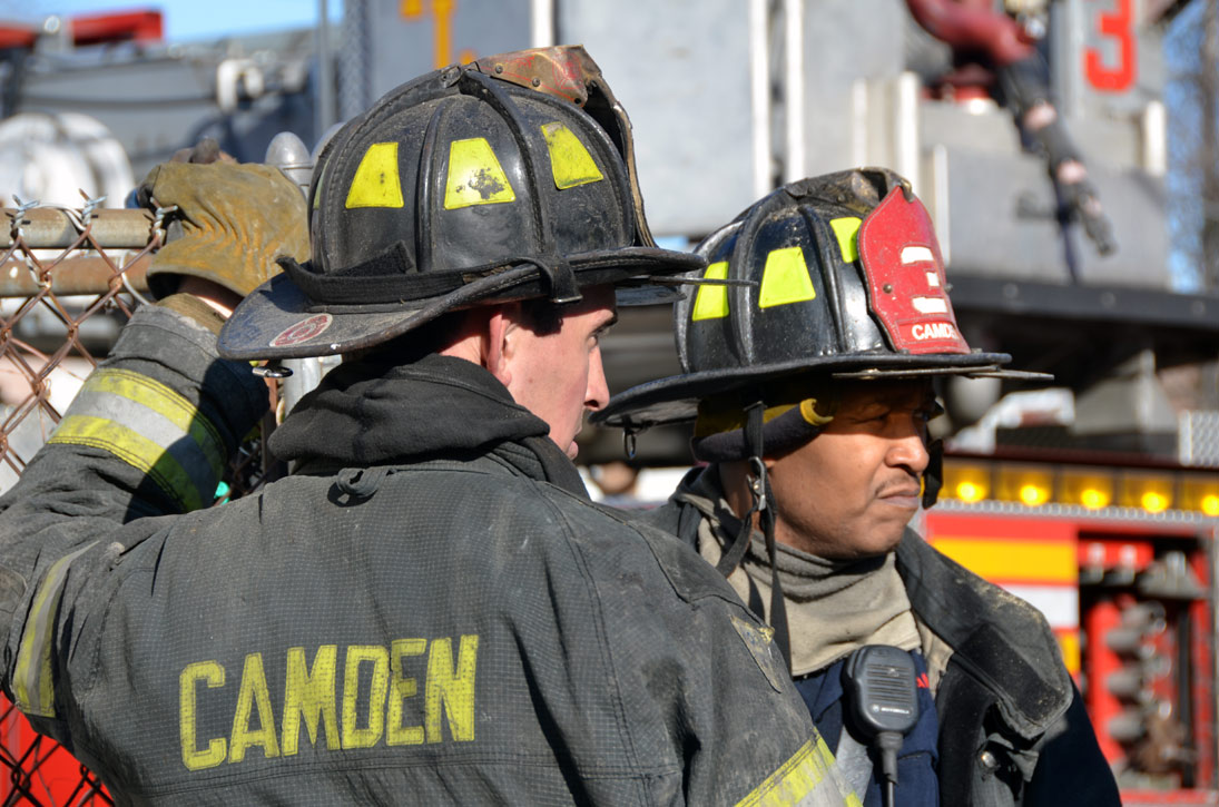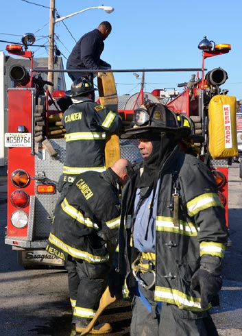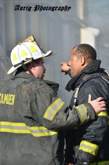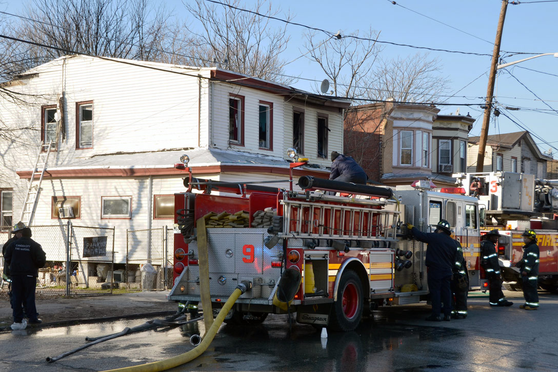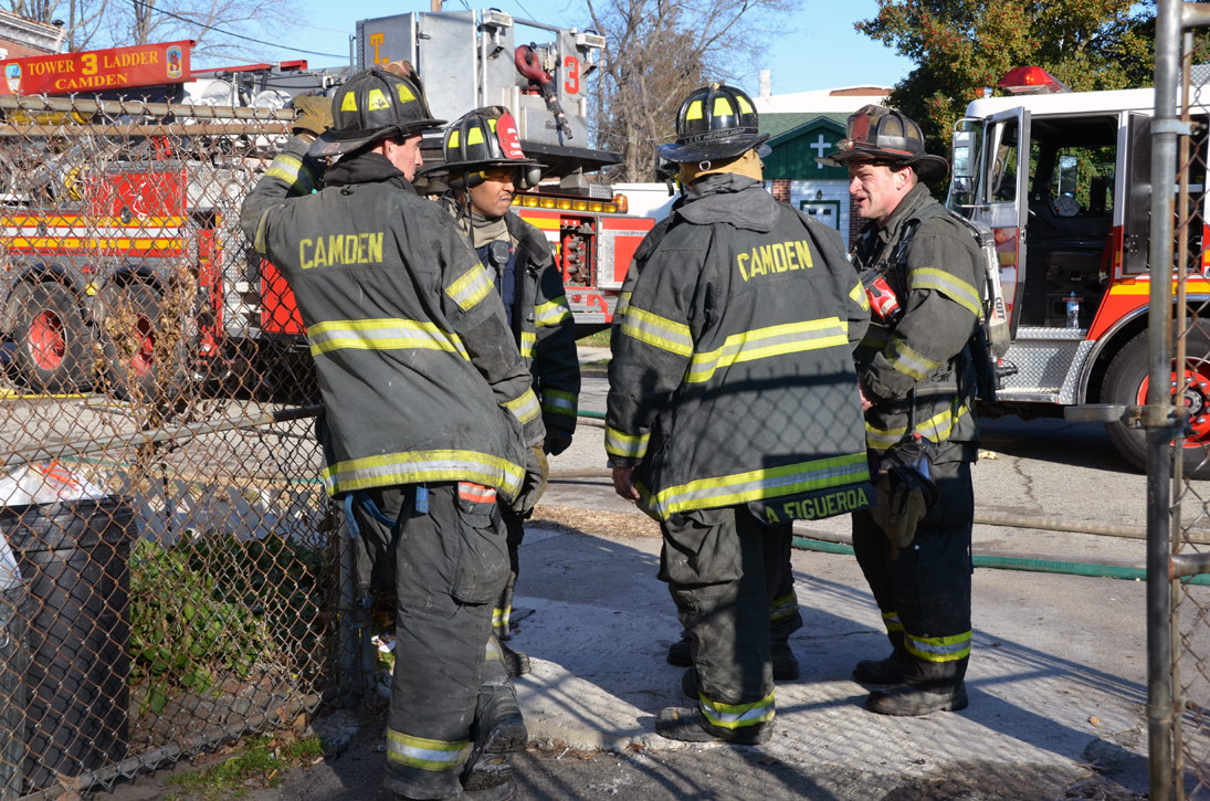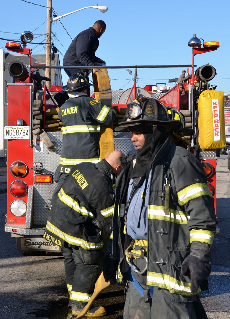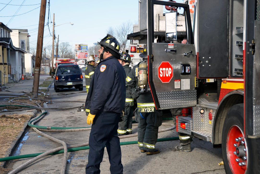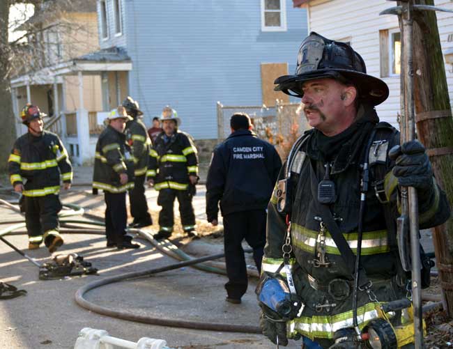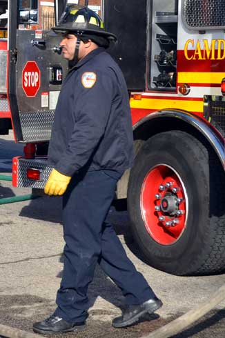This page and the other pages in this series are the successors to the series of web-page about the Camden Fire Department that began with the page Camden Fire Department: The Fires of the Summer of 2011. On this and other pages in the series you will find pictures and information regarding different events and aspects of the fire service in Camden, New Jersey. At 12:53 PM on January 9, 2012 units of the Camden Fire Department were dispatched to 121 North 26th Street in East Camden. Battalion 2 (Battalion Chief Sam Balakas) on arrival reported that this dwelling, a two-story frame twin showed heavy fire both to the rear and side exposures. Three hose lines were in operation at the ten minute mark. Companies went into defensive operations as a second alarm was struck, and companies from Pennsauken and Collingswood were dispatched to render assistance. Both 121 and 119 North 26th Street, which was the other side of the twin structure, was badly damaged. 123 North 26th Street suffered less damage. Two families were left homeless as a result of this blaze. One firefighter was reported to have been taken to the hospital for treatment of a shoulder injury. Photographer Ted Aurig was on scene early on in the operation. Five of his photos are here and you can see more of Ted's photos from this fire by clicking here. I arrived at the scene and took my first picture at 1:42 PM. All photos are presented in the order in which they were taken. As with the web page covering other Camden Fire Department events, if you can identify anyone that I've missed, please comment at the bottom of the page. (I'm terrible at at names and faces). I'm somewhat behind as of this writing in captioning photos, as things have been quite busy since New Years Day! January 12, 2012 |