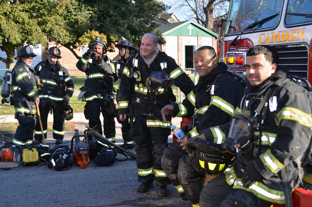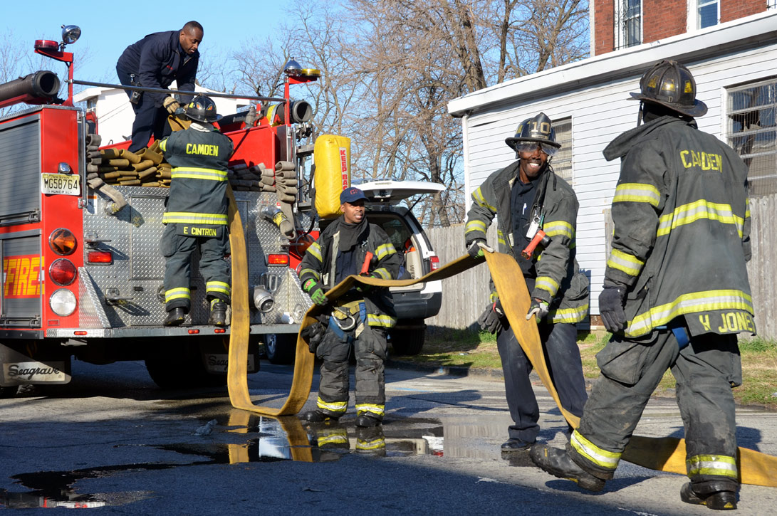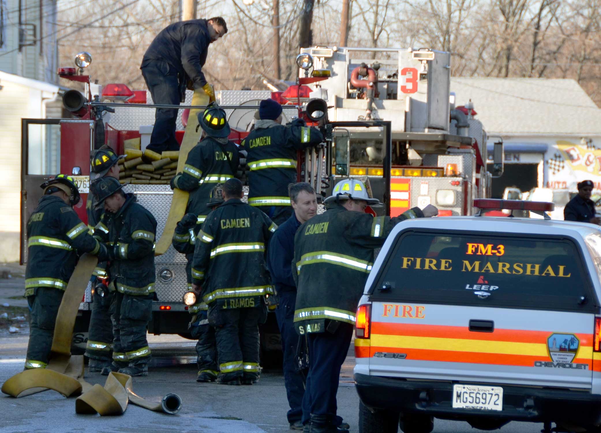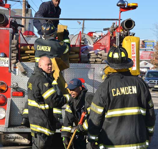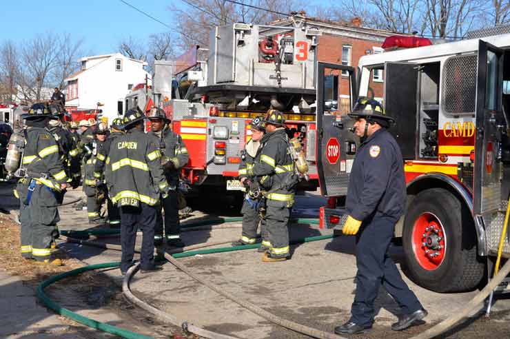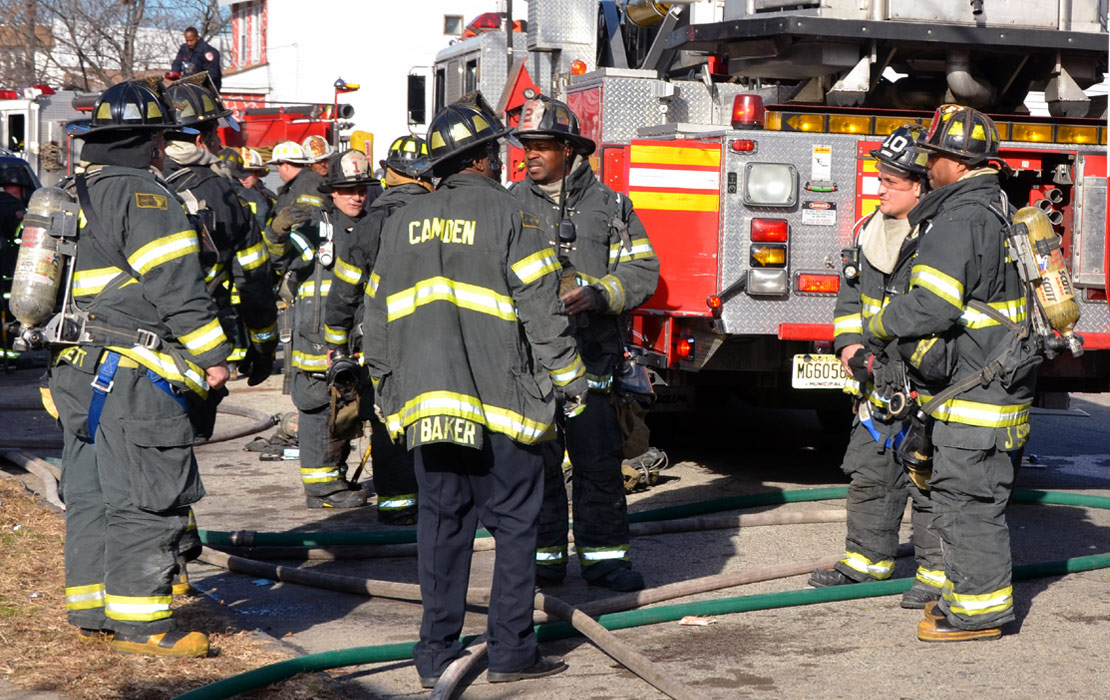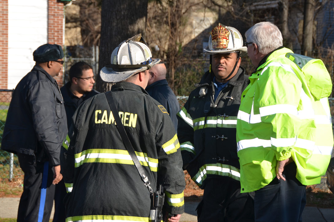 This page and the other pages in this series are the successors to the series of web-page about the Camden Fire Department that began with the page Camden Fire Department: The Fires of the Summer of 2011. On this and other pages in the series you will find pictures and information regarding different events and aspects of the fire service in Camden, New Jersey. At 12:53 PM on January 9, 2012 units of the Camden Fire Department were dispatched to 121 North 26th Street in East Camden. Battalion 2 (Battalion Chief Sam Balakas) on arrival reported that this dwelling, a two-story frame twin showed heavy fire both to the rear and side exposures. Three hose lines were in operation at the ten minute mark. Companies went into defensive operations as a second alarm was struck, and companies from Pennsauken and Collingswood were dispatched to render assistance. Both 121 and 119 North 26th Street, which was the other side of the twin structure, was badly damaged. 123 North 26th Street suffered less damage. Two families were left homeless as a result of this blaze. One firefighter was reported to have been taken to the hospital for treatment of a shoulder injury. Photographer Ted Aurig was on scene early on in the operation. Five of his photos are here and you can see more of Ted's photos from this fire by clicking here. I arrived at the scene and took my first picture at 1:42 PM. All photos are presented in the order in which they were taken. As with the web page covering other Camden Fire Department events, if you can identify anyone that I've missed, please comment at the bottom of the page. (I'm terrible at at names and faces). I'm somewhat behind as of this writing in captioning photos, as things have been quite busy since New Years Day! January 12, 2012 |