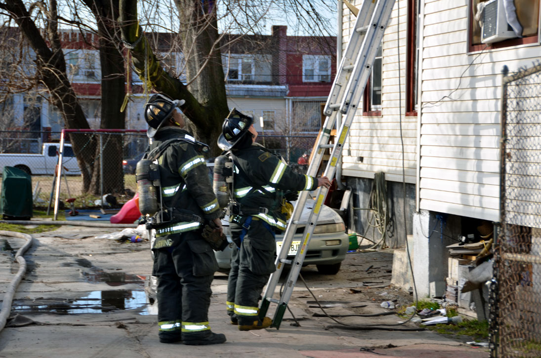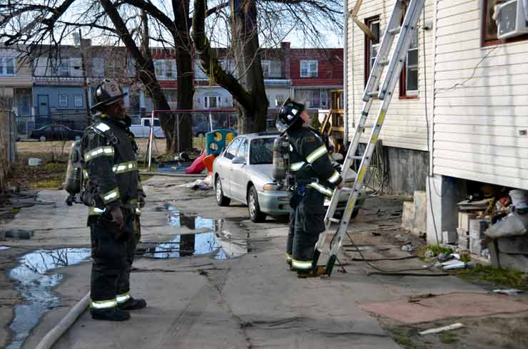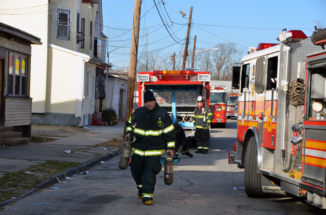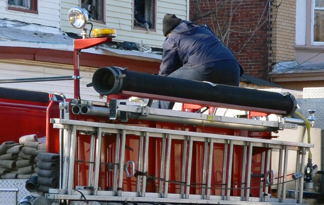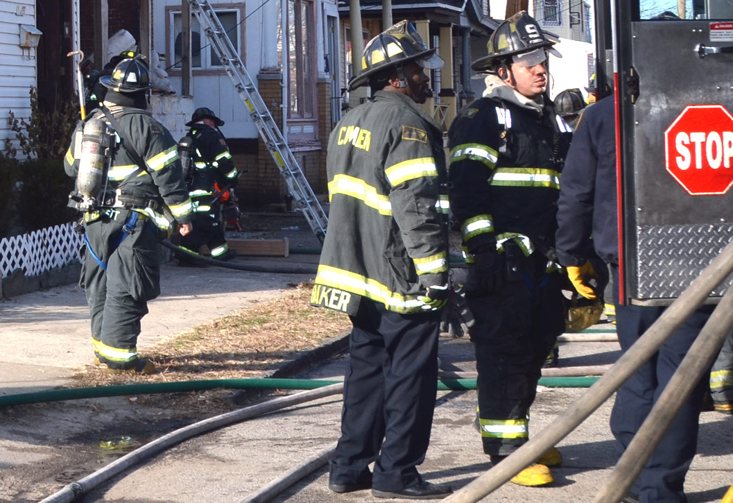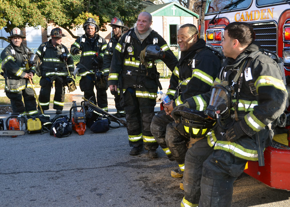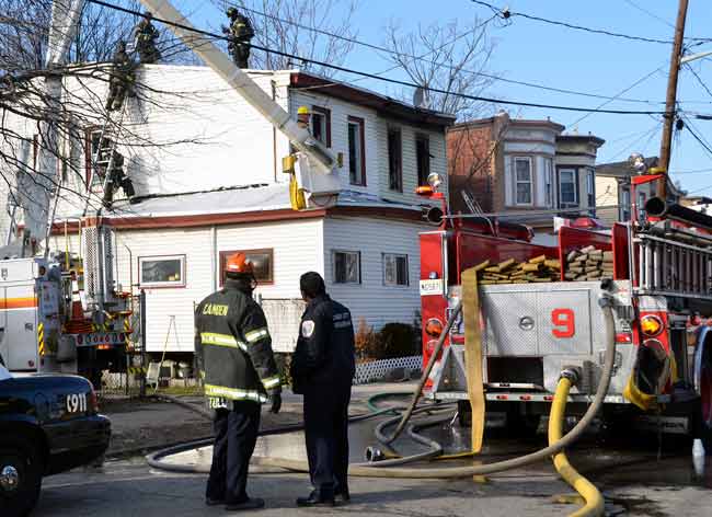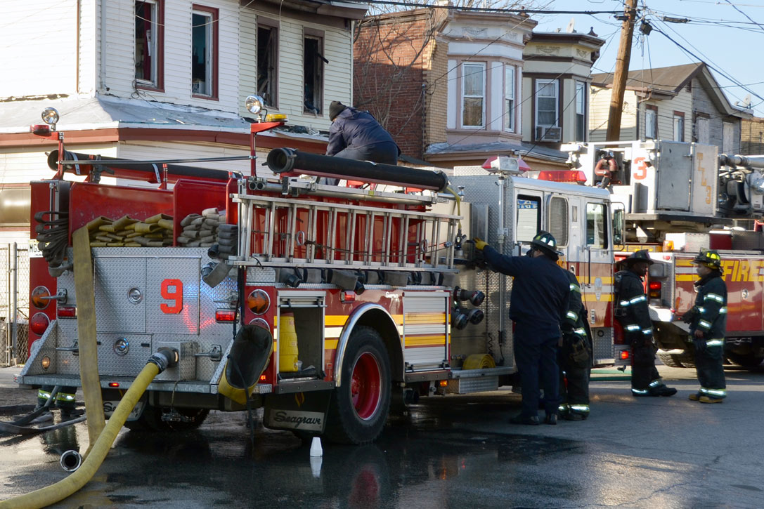 This page and the other pages in this series are the successors to the series of web-page about the Camden Fire Department that began with the page Camden Fire Department: The Fires of the Summer of 2011. On this and other pages in the series you will find pictures and information regarding different events and aspects of the fire service in Camden, New Jersey. At 12:53 PM on January 9, 2012 units of the Camden Fire Department were dispatched to 121 North 26th Street in East Camden. Battalion 2 (Battalion Chief Sam Balakas) on arrival reported that this dwelling, a two-story frame twin showed heavy fire both to the rear and side exposures. Three hose lines were in operation at the ten minute mark. Companies went into defensive operations as a second alarm was struck, and companies from Pennsauken and Collingswood were dispatched to render assistance. Both 121 and 119 North 26th Street, which was the other side of the twin structure, was badly damaged. 123 North 26th Street suffered less damage. Two families were left homeless as a result of this blaze. One firefighter was reported to have been taken to the hospital for treatment of a shoulder injury. Photographer Ted Aurig was on scene early on in the operation. Five of his photos are here and you can see more of Ted's photos from this fire by clicking here. I arrived at the scene and took my first picture at 1:42 PM. All photos are presented in the order in which they were taken. As with the web page covering other Camden Fire Department events, if you can identify anyone that I've missed, please comment at the bottom of the page. (I'm terrible at at names and faces). I'm somewhat behind as of this writing in captioning photos, as things have been quite busy since New Years Day! January 12, 2012 |