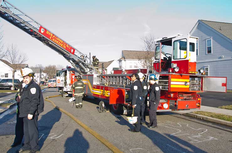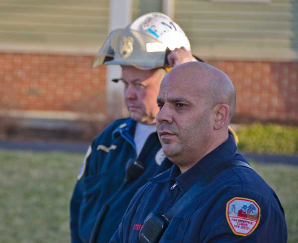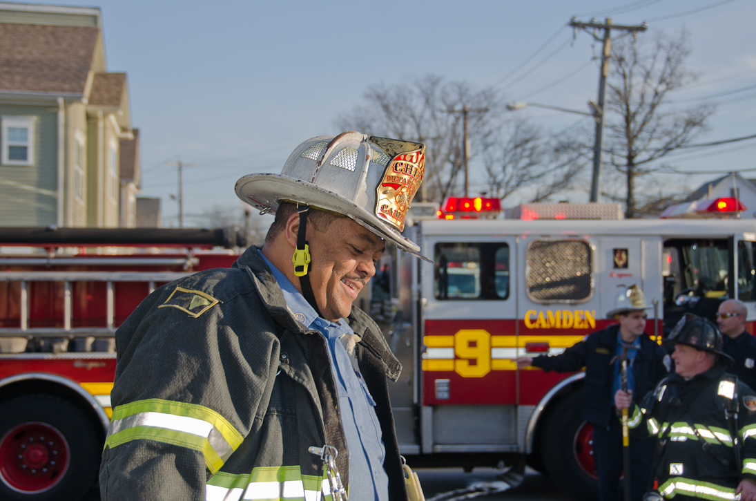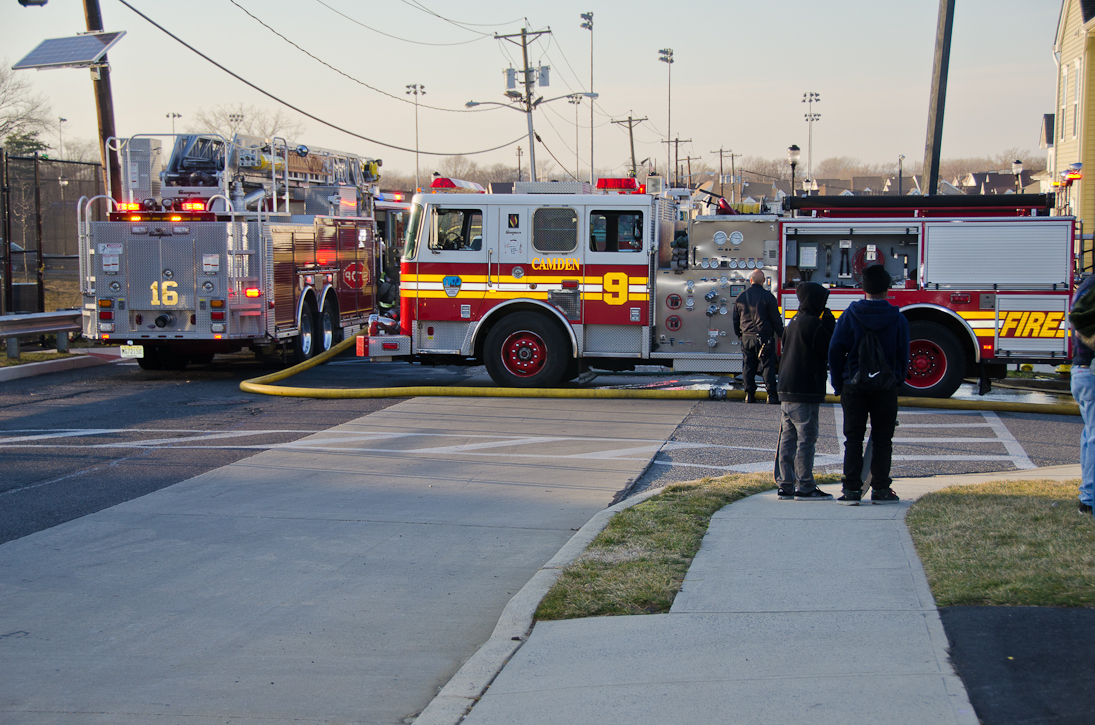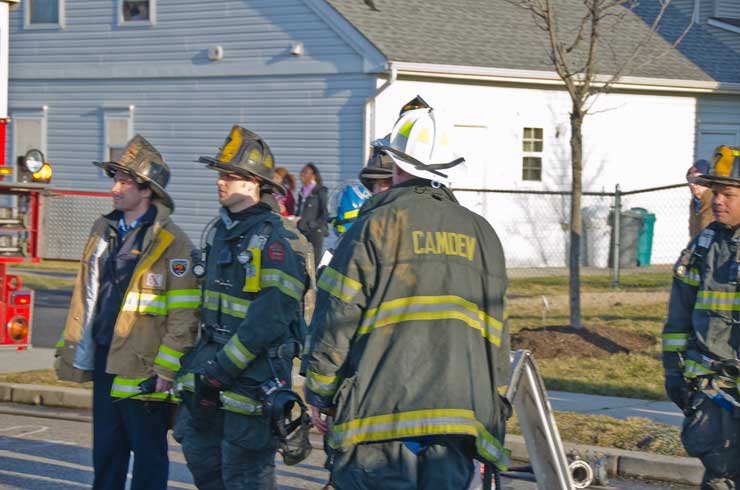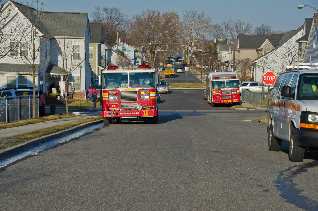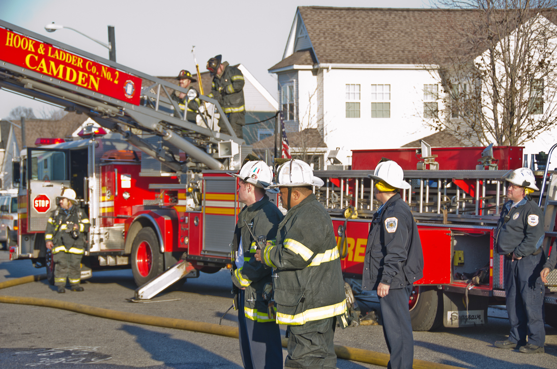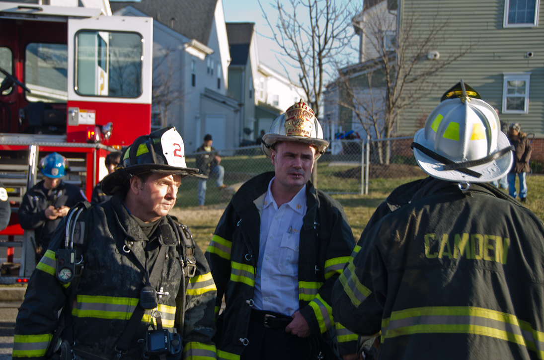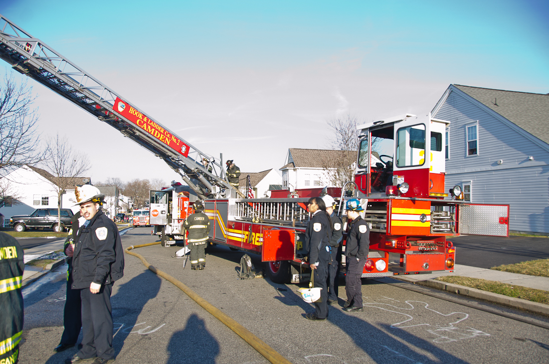 This page and the other pages in this series are the successors to the series of web-page about the Camden Fire Department that began with the page Camden Fire Department: The Fires of the Summer of 2011. On this and other pages in the series you will find pictures and information regarding different events and aspects of the fire service in Camden, New Jersey. On the evening of February 28, 2012 I was in Cherry Hill, New Jersey headed to my father's house to pick him up as we had plans to go to dinner. I was about 50 yards from his house when an alarm sounded for a house fire at 3133 Saunders Street in East Camden. This house was built about ten years ago on the site of the former Westfield Acres public housing project, and was located on the corner of Saunders Street and Rosedale Avenue. I stopped, got my father, and off we went to Camden. It took awhile to get there as it was rush hour and we had to come down Chapel Avenue in Cherry Hill, then down Maple Avenue in Merchantville to get to East Camden. The fire was under control when we arrived but there was still much to photograph. Camden Fire Department companies arrived with heavy fire conditions showing from the second story wood frame twin dwelling. Command struck a 2nd Alarm as crews operated in a defensive operation. Units from Collingswood and Pennsauken were also called on to rend assistance. As with the web page covering other Camden Fire Department events, if you can identify anyone that I've missed, please comment at the bottom of the page. (I'm terrible at at names and faces).. March 6, 2012 |
