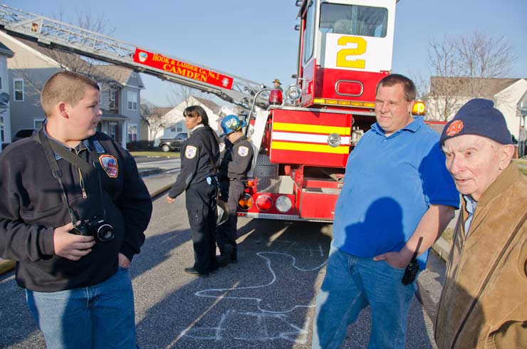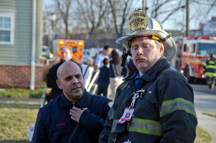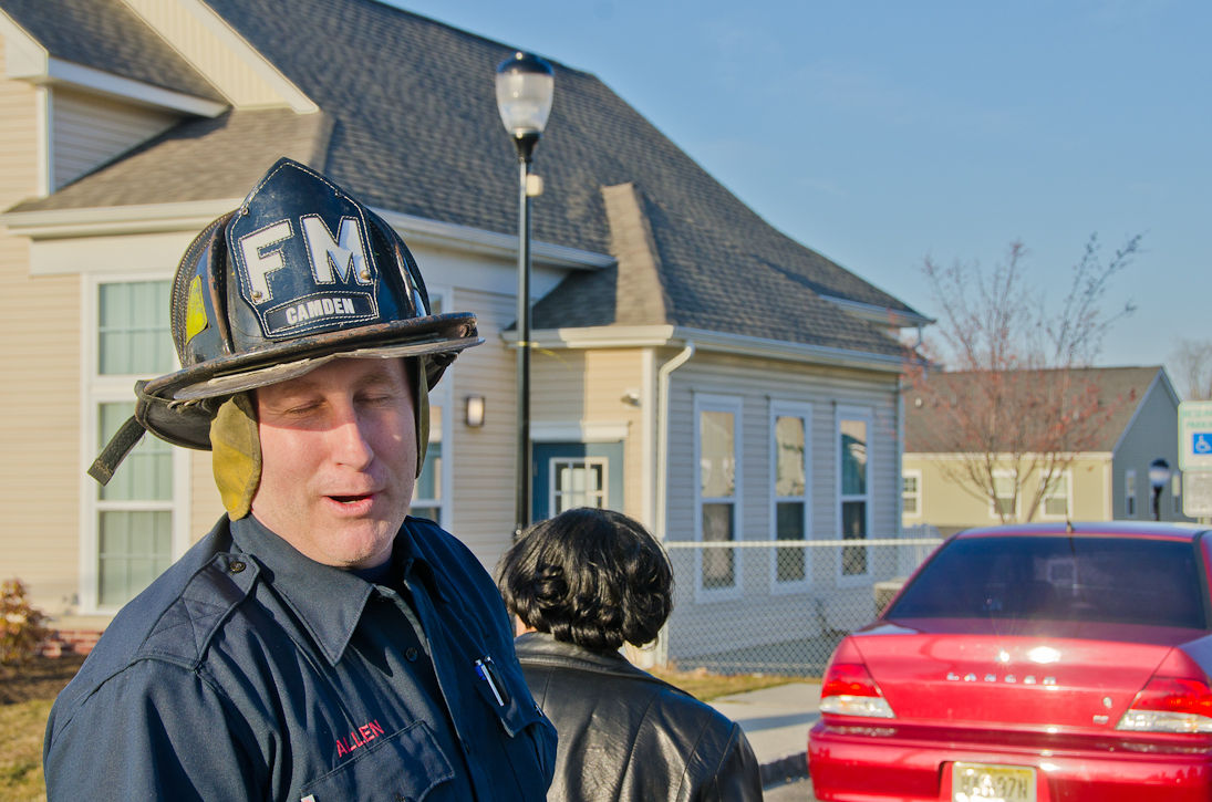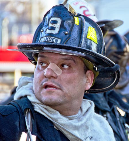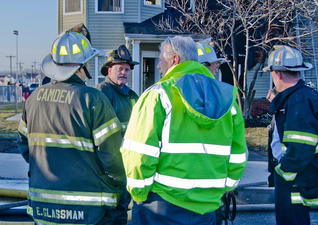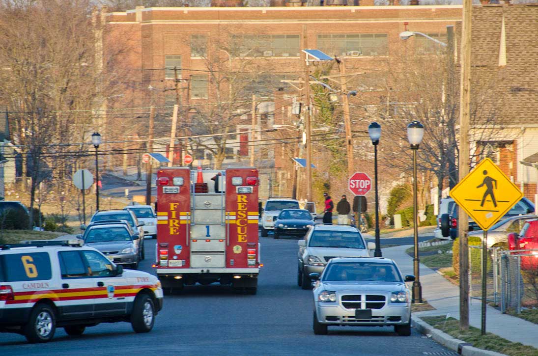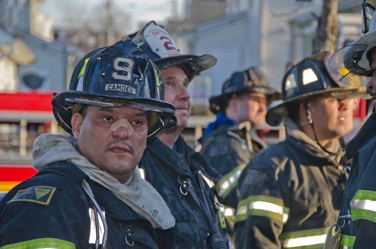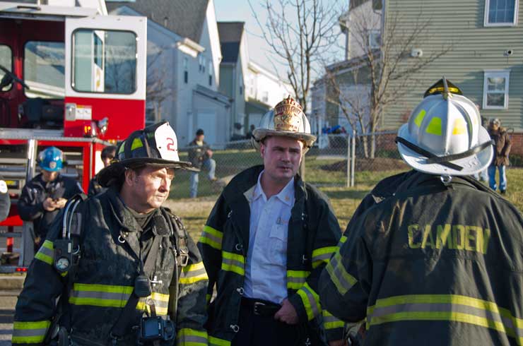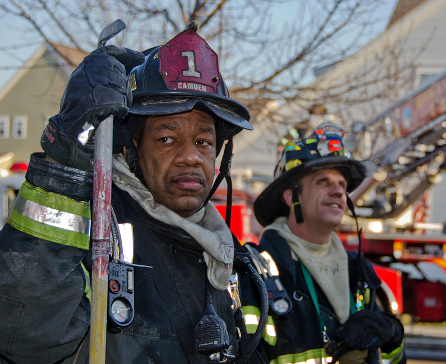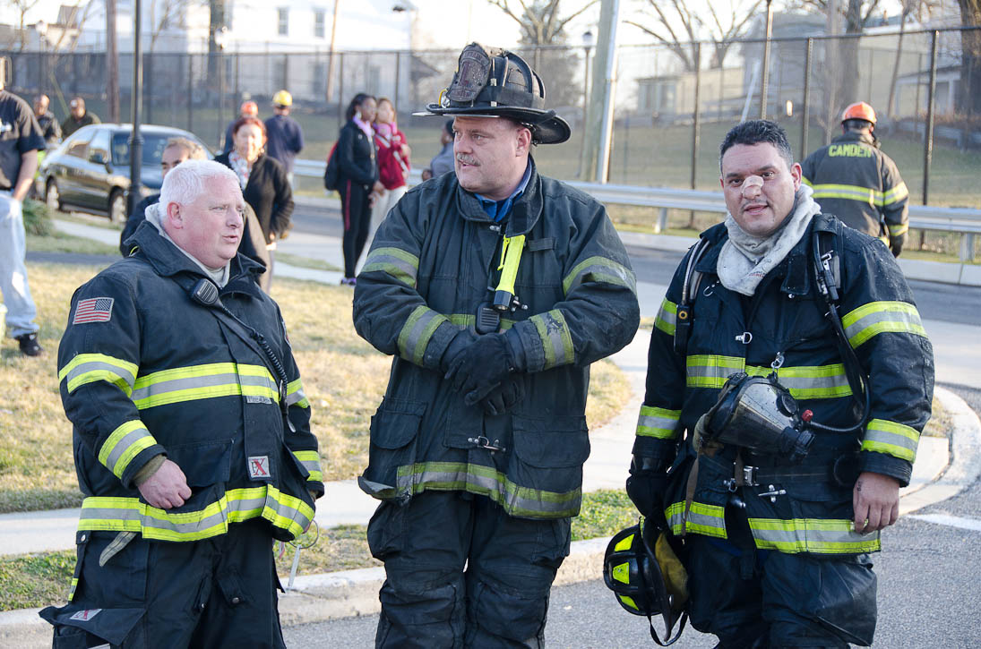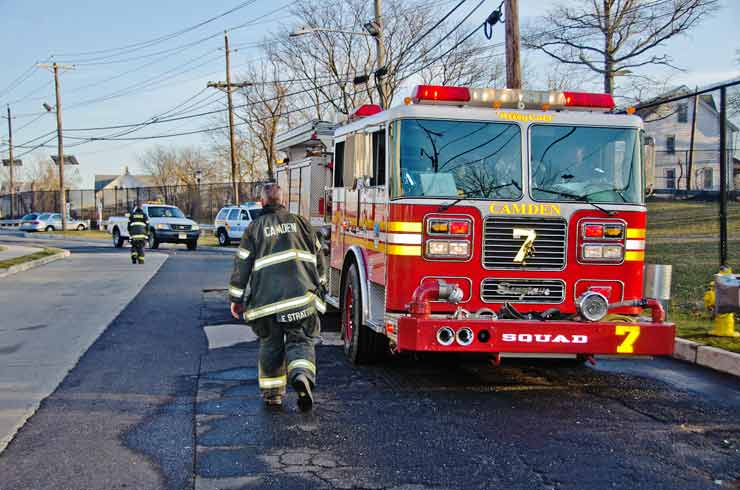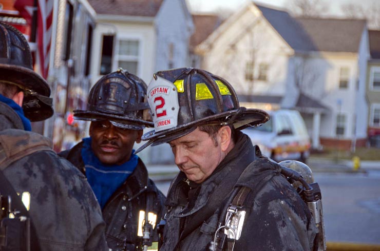 This page and the other pages in this series are the successors to the series of web-page about the Camden Fire Department that began with the page Camden Fire Department: The Fires of the Summer of 2011. On this and other pages in the series you will find pictures and information regarding different events and aspects of the fire service in Camden, New Jersey. On the evening of February 28, 2012 I was in Cherry Hill, New Jersey headed to my father's house to pick him up as we had plans to go to dinner. I was about 50 yards from his house when an alarm sounded for a house fire at 3133 Saunders Street in East Camden. This house was built about ten years ago on the site of the former Westfield Acres public housing project, and was located on the corner of Saunders Street and Rosedale Avenue. I stopped, got my father, and off we went to Camden. It took awhile to get there as it was rush hour and we had to come down Chapel Avenue in Cherry Hill, then down Maple Avenue in Merchantville to get to East Camden. The fire was under control when we arrived but there was still much to photograph. Camden Fire Department companies arrived with heavy fire conditions showing from the second story wood frame twin dwelling. Command struck a 2nd Alarm as crews operated in a defensive operation. Units from Collingswood and Pennsauken were also called on to rend assistance. As with the web page covering other Camden Fire Department events, if you can identify anyone that I've missed, please comment at the bottom of the page. (I'm terrible at at names and faces).. March 6, 2012 |