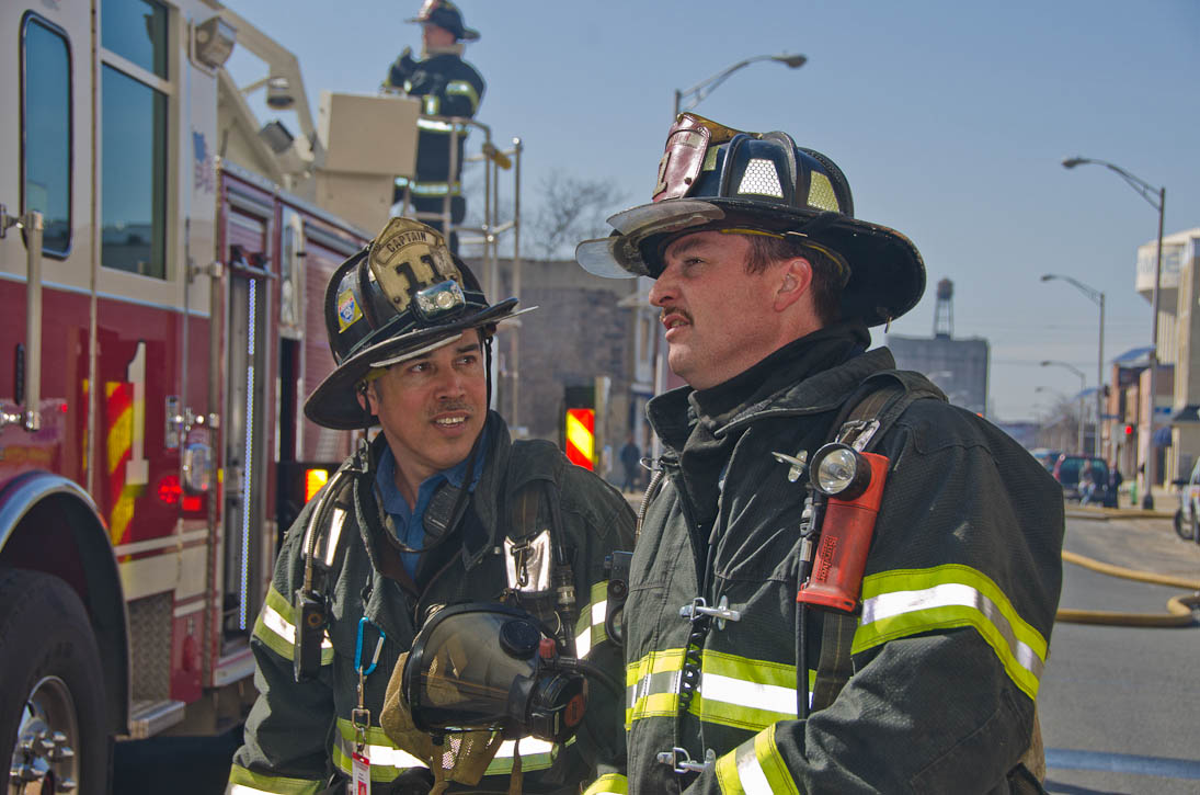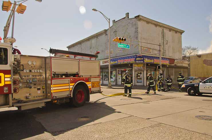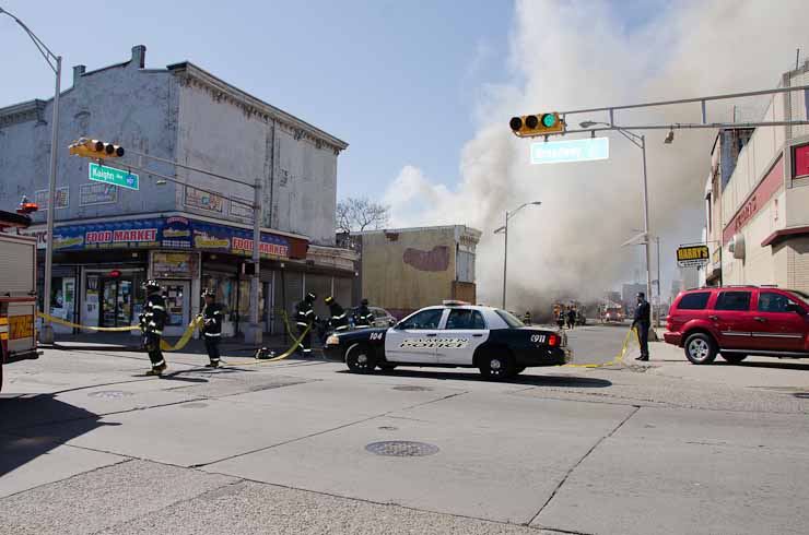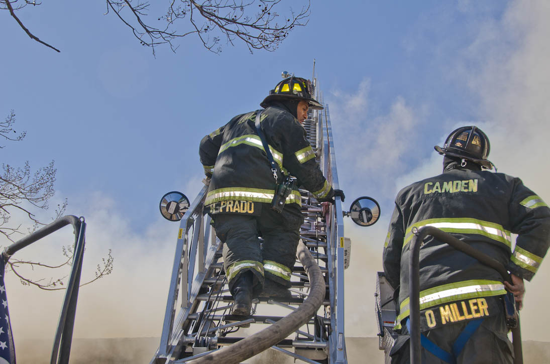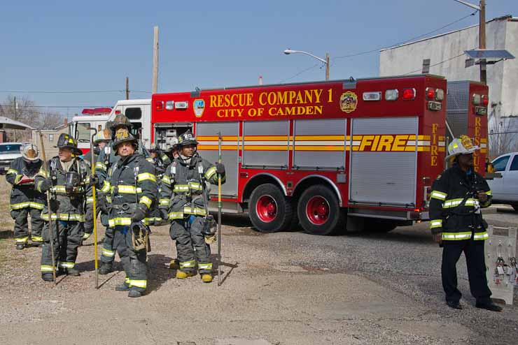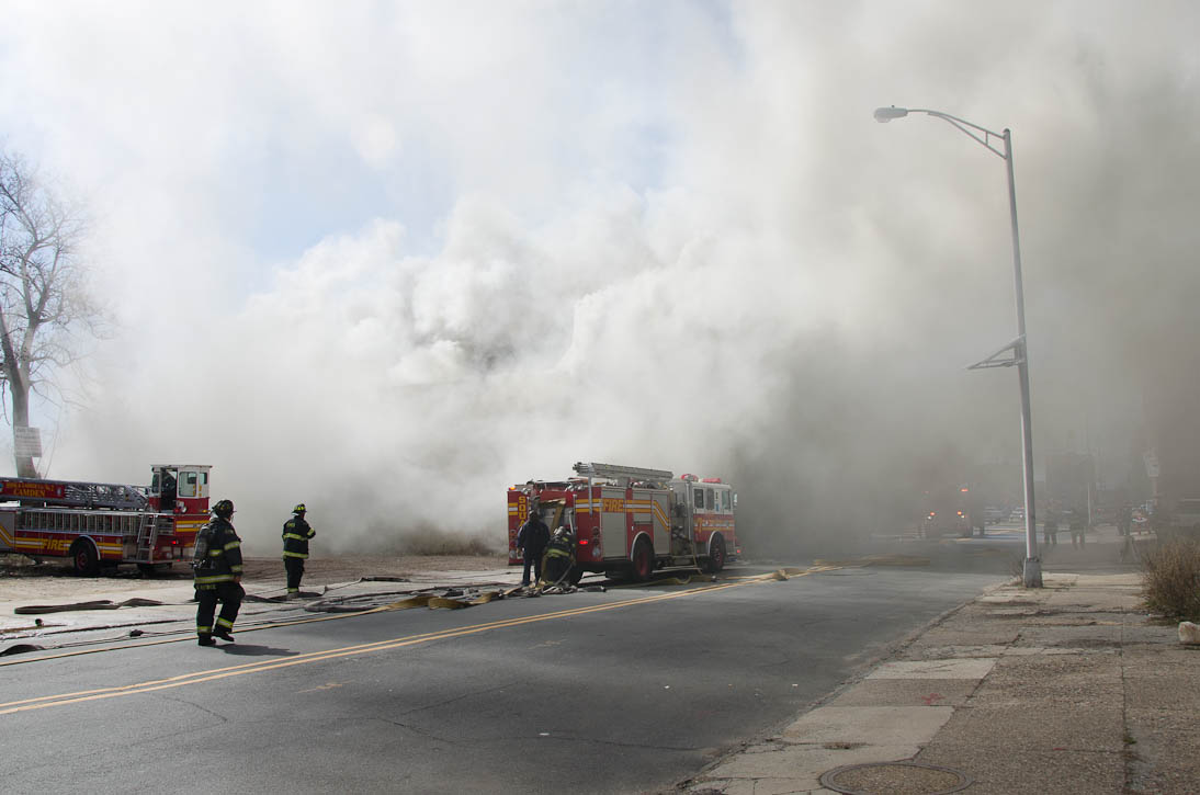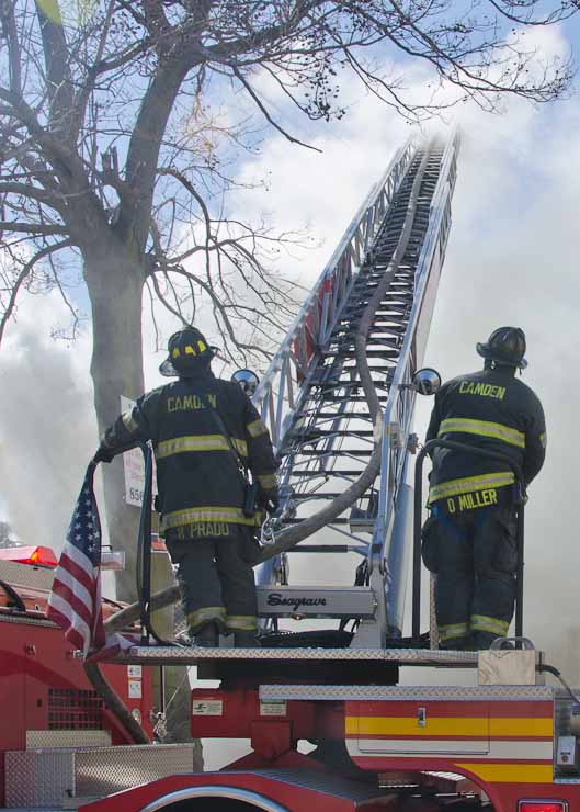 This page and the other pages in this series are the successors to the series of web-page about the Camden Fire Department that began with the page Camden Fire Department: The Fires of the Summer of 2011. On this and other pages in the series you will find pictures and information regarding different events and aspects of the fire service in Camden, New Jersey. At approximately 1:35 PM on March 6, 2012 a fire was reported in the abandoned building at 440-442 Kaighn Avenue, which until the mid-2000s had been the site of Henry Supply, a plumbing fixtures and supplies business which had been a fixture on Kaighn Avenue for decades. Long abandoned and used by squatters, addicts, and prostitutes, smoke and small fires had been reported at this location many times over the past few years, most reports turning out to be nothing of any consequence. This time would be different. Battalion reported heavy fire through the roof of the vacant building and requested the second alarm be struck. All companies were placed in service with master streams. Mutual Aid was rendered by Ladder 16 from Collingswood. Command reported water supply issues and special called two additional tower ladders and FAST company from Gloucester City. Command reported partial collapse of the roof and that there was difficulty getting water onto the fire due to the building's construction. Ladder 13-24 from Cherry Hill arrived and was placed in service in front of the building. With heavy fire coming through the roof, the building was soon a total loss. Crews performed defensive operations for several hours before clearing the scene. Ladder 13-24 was instrumental in pulling down the front wall of the building. The Camden County Fire Marshal, Camden City Fire Marshal, Camden Police Department, and numerous BLS units assisted at the scene. Besides the above mentioned departments, a company from Westmont also assisted at the scene All photos are presented in the order in which they were taken. There are so many images for this fire that I have split coverage of this fire into four parts, this being Page 1. There are links below to continue to Page 2, Page 3, and Page 4. As with the web page covering other Camden Fire Department events, if you can identify anyone that I've missed, please comment at the bottom of the page. (I'm terrible at at names and faces).. March 22, 2012 |