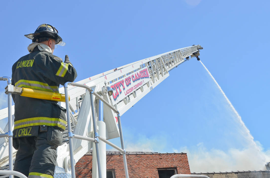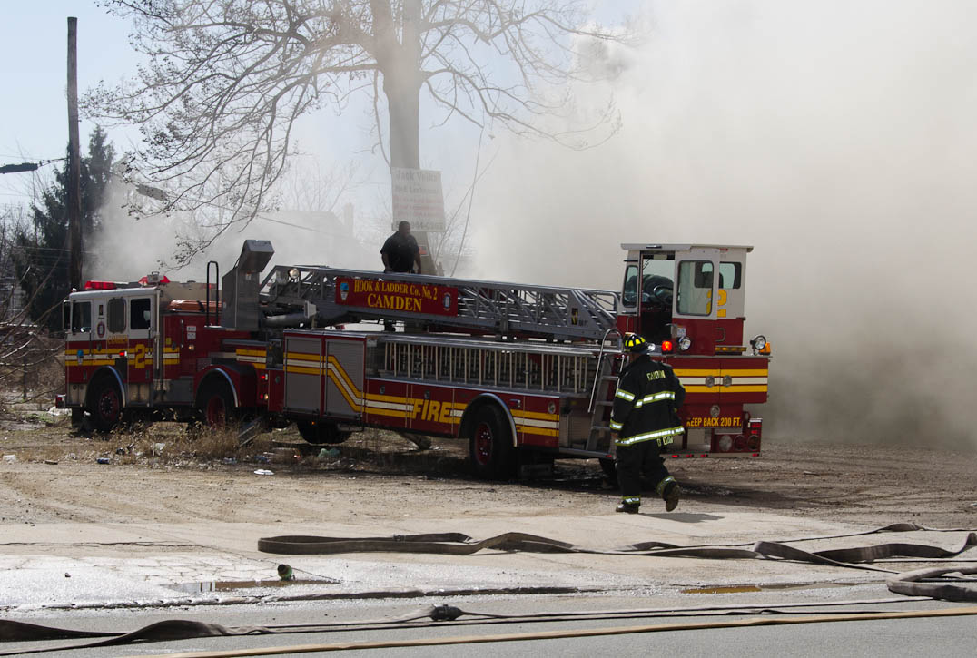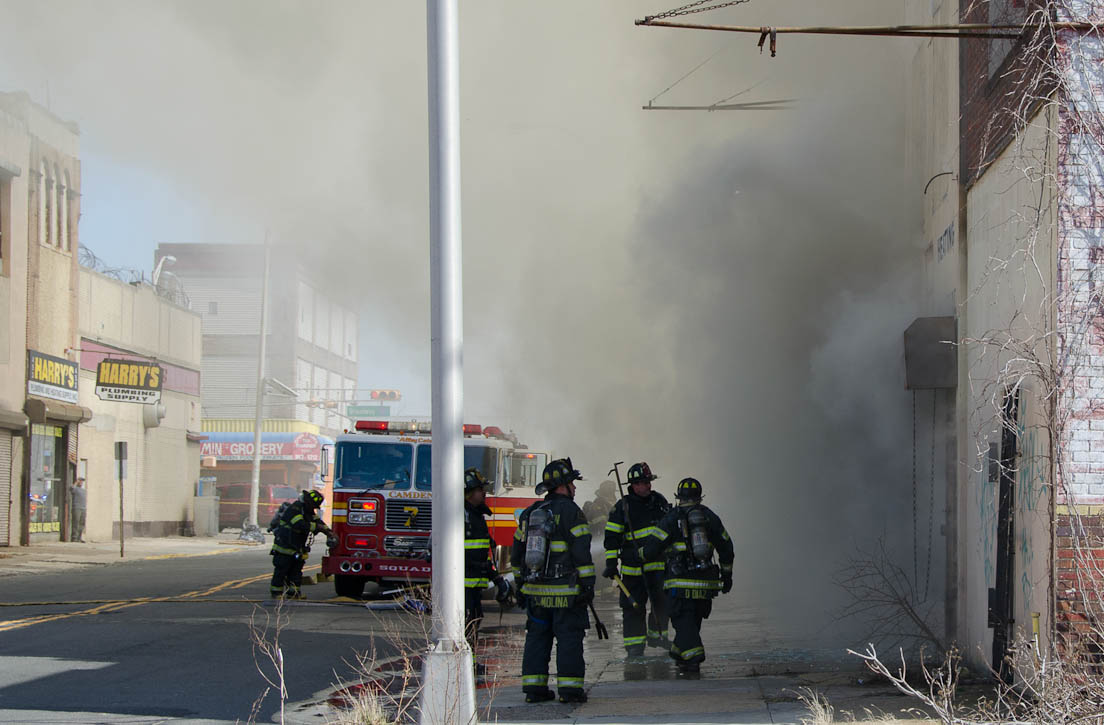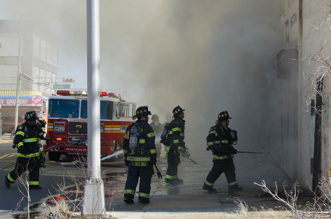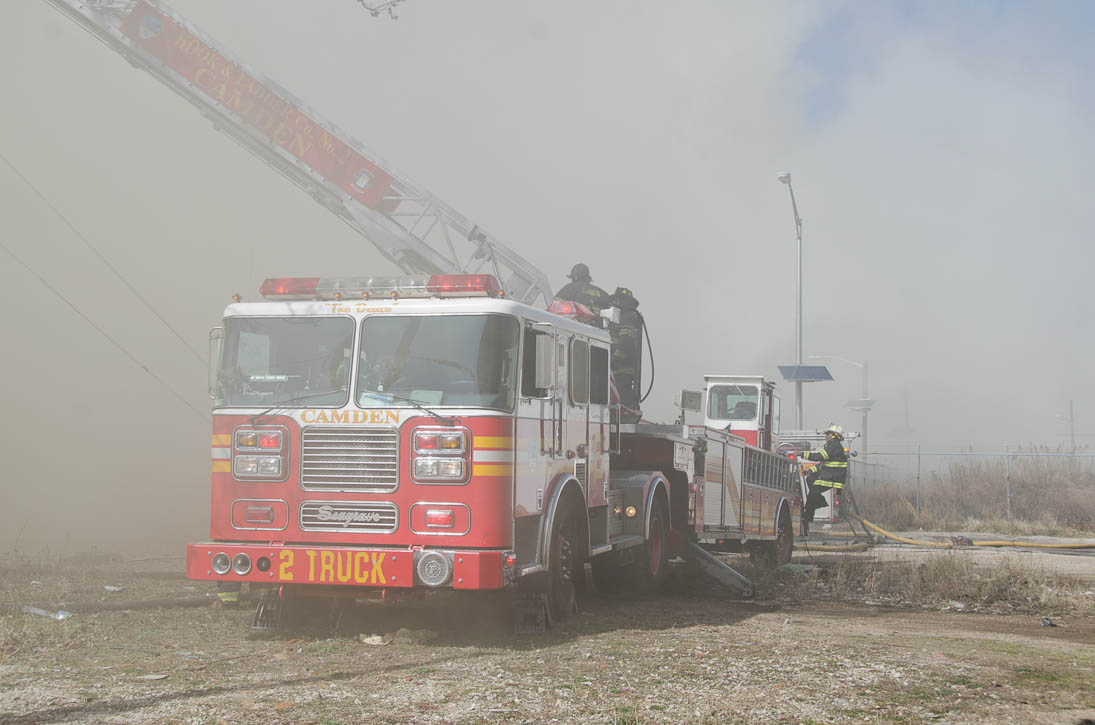 Fire guts abandoned warehouse in Camden Written by CAMDEN — A two-alarm fire ripped through an abandoned city warehouse Tuesday afternoon. The fire spewed flames through the collapsing roof of the long vacant Henry’s Plumbing Supplies warehouse along the 400 block of Kaighn Avenue, blocked traffic on the nearby Broadway corridor and filled surrounding neighborhoods with gray smoke. First reported around 1 p.m., firefighters from Camden, Gloucester City, Cherry Hill and Collingswood battled the blaze for more than an hour before the thick smoke that drew pockets of onlookers began to dissipate. No injuries were reported in the blaze, which remains under investigation, according to city fire officials. Nearby resident Belvin Williams said the plumbing supply store had been vacant for years and has been a target for scrappers. At another abandoned building a short distance from the plumbing supply store, scrappers have cut out sections of metal gates that once blocked access to the gutted building. Williams