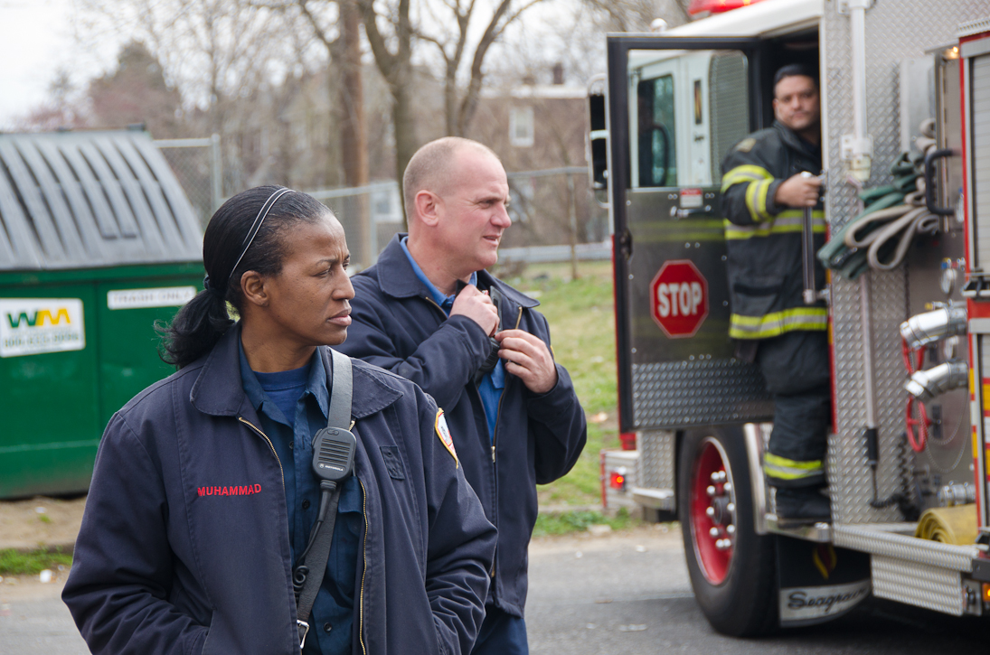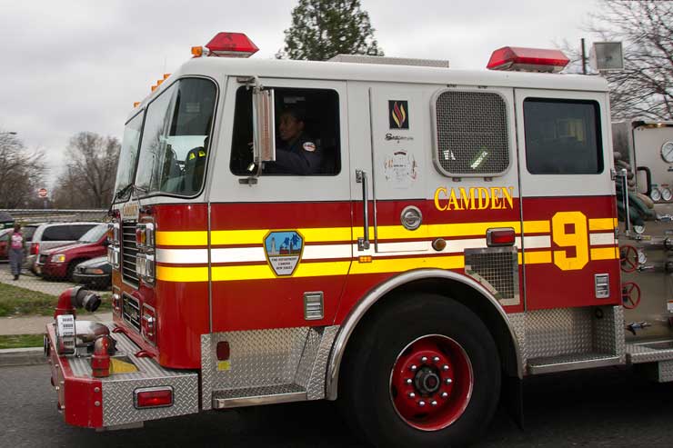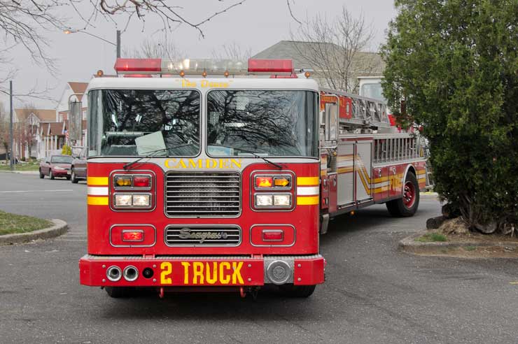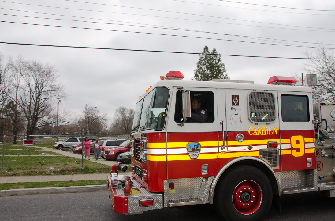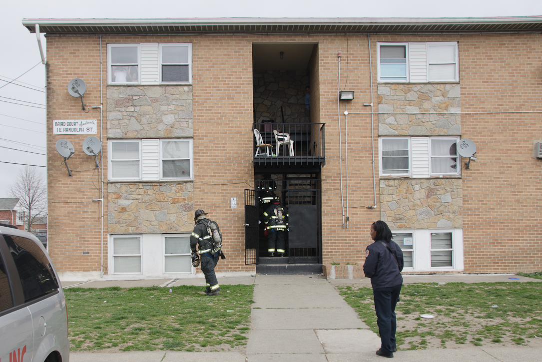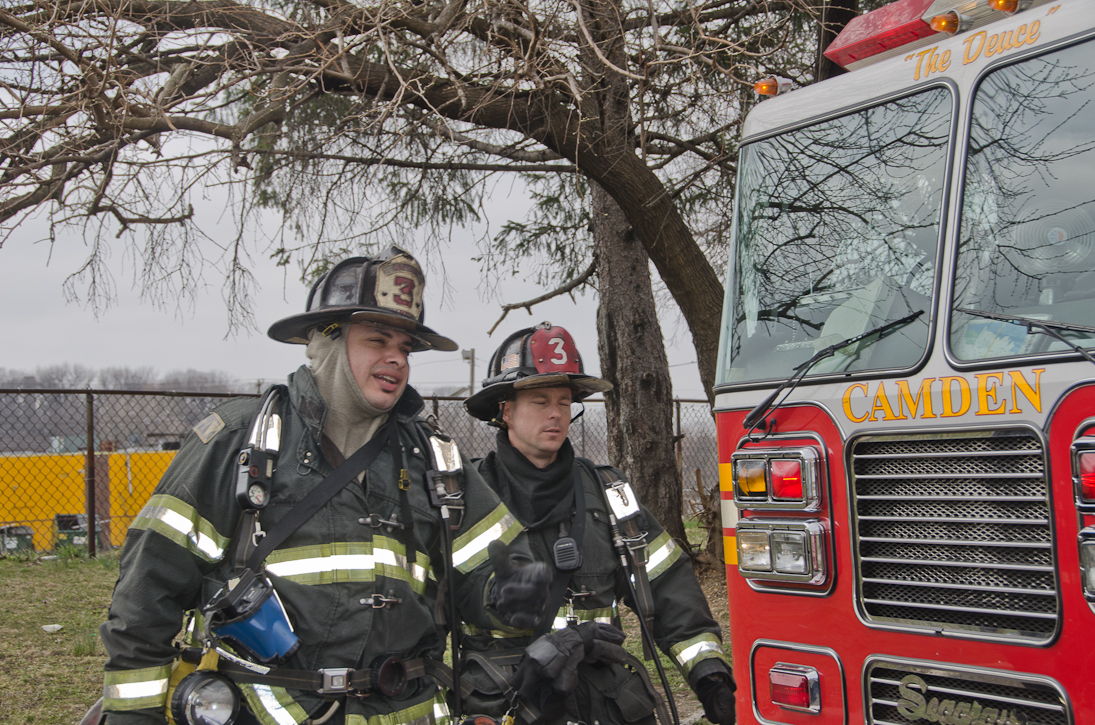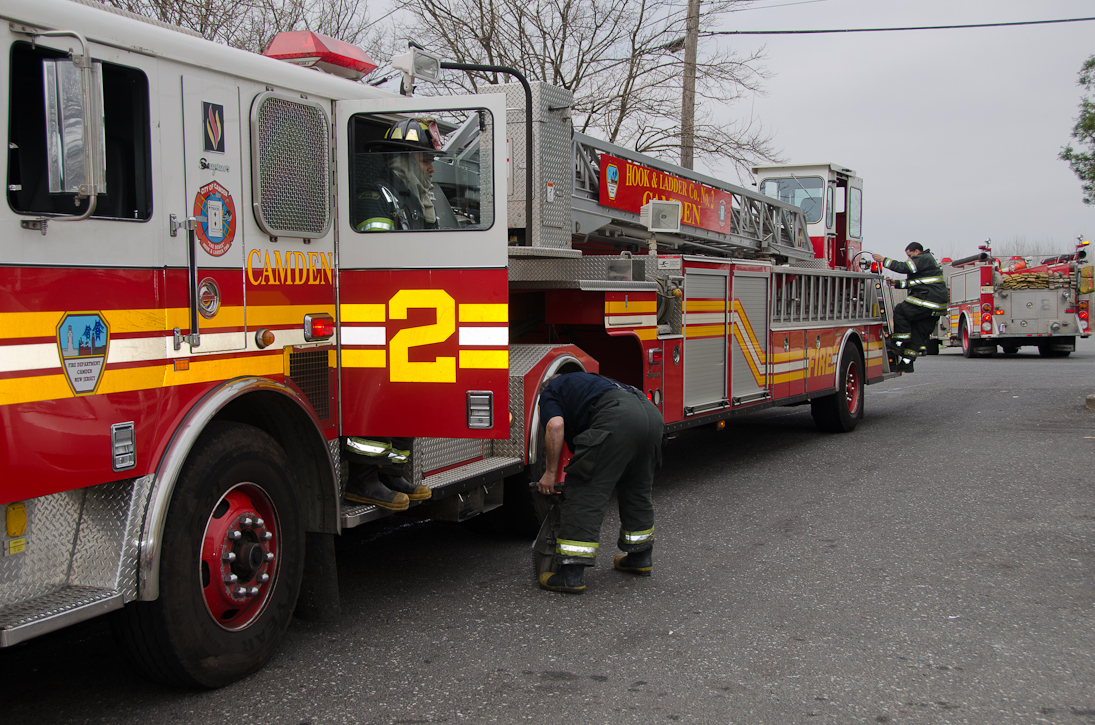 This page and the other pages in this series are the successors to the series of web-page about the Camden Fire Department that began with the page Camden Fire Department: The Fires of the Summer of 2011. On this and other pages in the series you will find pictures and information regarding different events and aspects of the fire service in Camden, New Jersey. Unseasonably warm weather brought people outside to do yard work and some outdoor cooking. One by product of this was a number of calls by worried residents who smelled smoke. A typical incident of this nature happened on March 15, 2012. I was in the 2300 block of Howell Street on my way to photographed an abandoned building that was slated for demolition when a call came over the radio at 12:37 PM for 1 Randolph Street, the Baird Court Apartments, just off the Admiral Wilson Boulevard at Westminster Street. I got there literally seconds after Ladder 3 arrived to investigate. I took my first photo at 12:41 PM. The investigation determined that one of the residents had smelled smoke emanating from a neighbor's barbecue at the rear of the property. Units returned to quarters at 12:50 PM. As with the web page covering other Camden Fire Department events, if you can identify anyone that I've missed, please comment at the bottom of the page. (I'm terrible at at names and faces). March 23, 2012 |