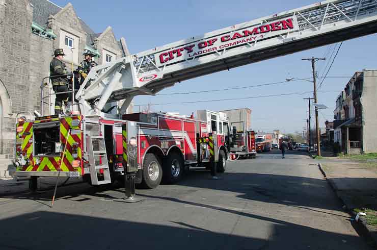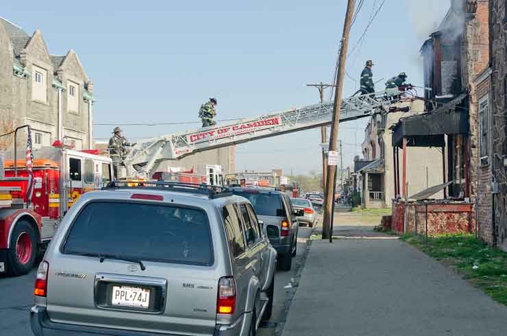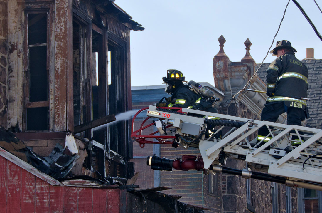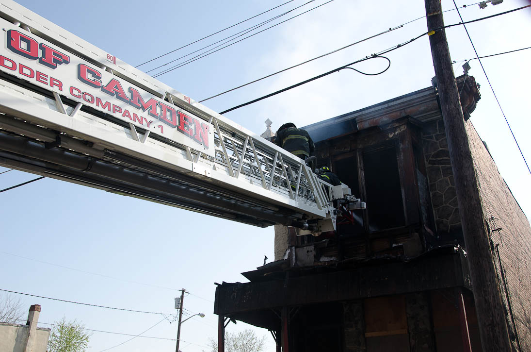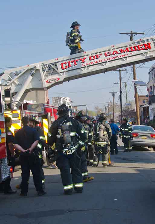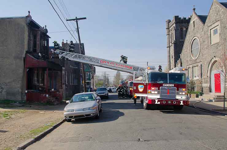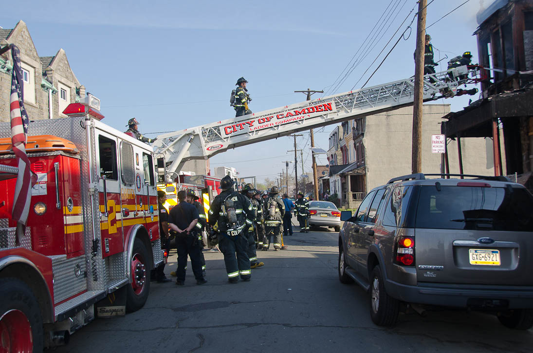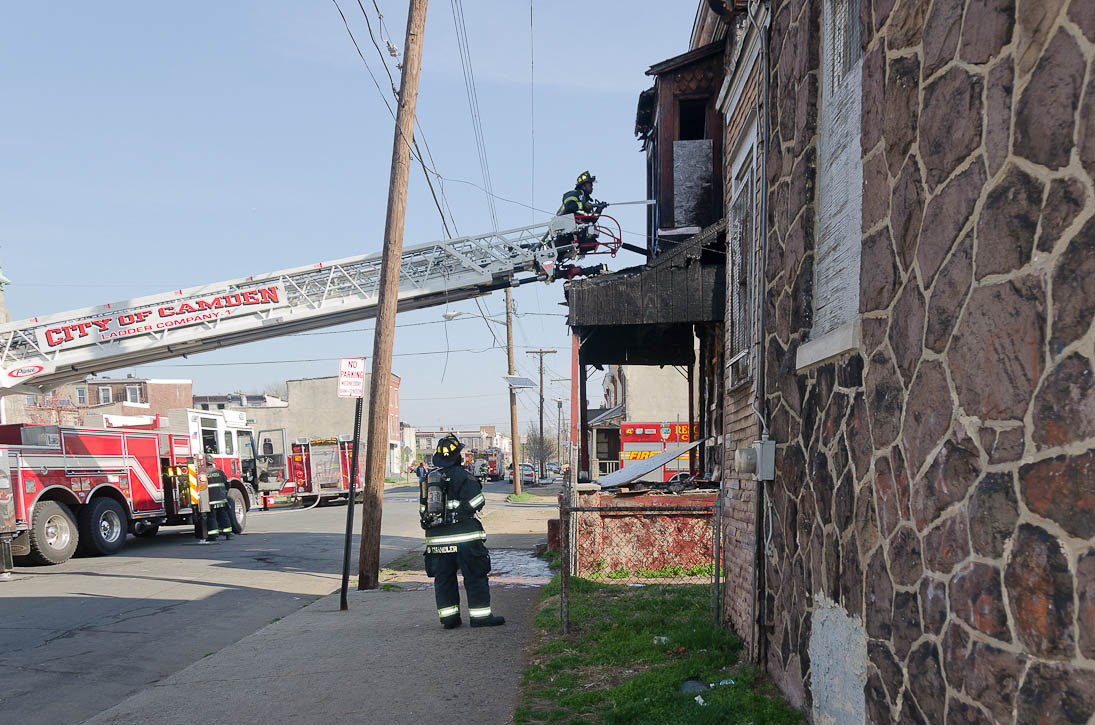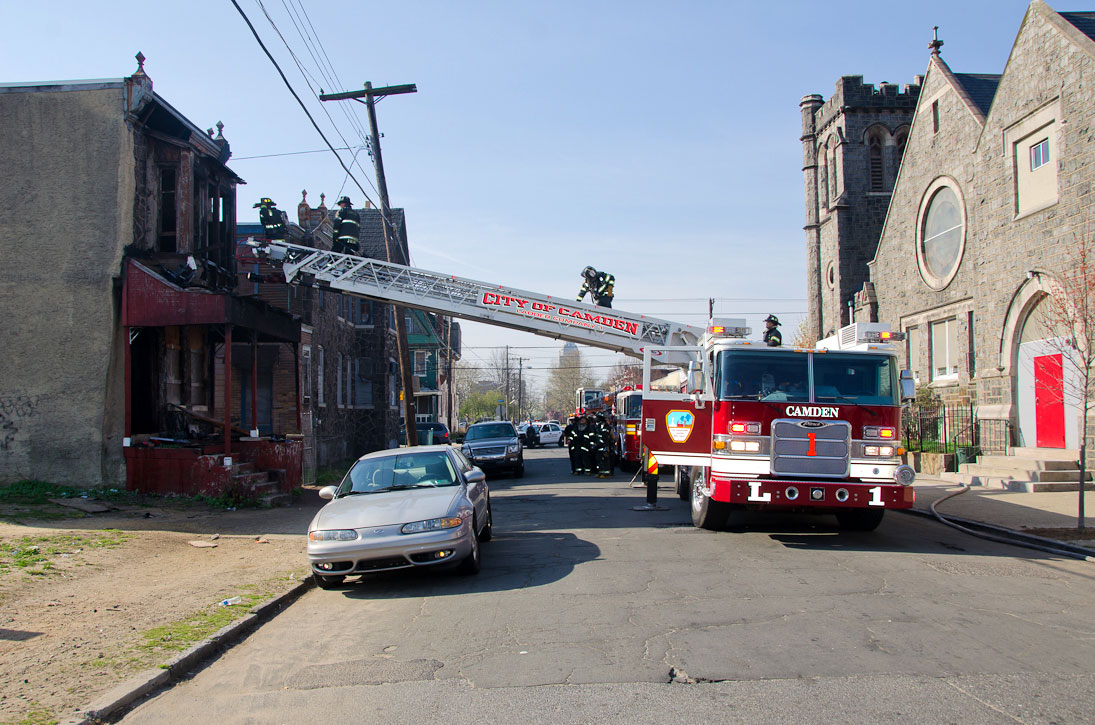 This page and the other pages in this series are the successors to the series of web-page about the Camden Fire Department that began with the page Camden Fire Department: The Fires of the Summer of 2011. On this and other pages in the series you will find pictures and information regarding different events and aspects of the fire service in Camden, New Jersey. At approximately 9:45 PM on March 23, 2012 units of the Camden Fire Department were dispatched to a dwelling a vacant dwelling at 806 North 6th Street in North Camden. This two-story building had once been an attached dwelling, but had long been a stand-alone, and had been the scene of several fires previously. Only three weeks previously the building had been slated for demolition, however, the wreckers had not yet arrived when this fire took place. This was the first of three small fire that the Camden Fire Department addressed that day. All photos here are presented in the order in which they were taken. My first photograph was shot at 9:59 AM. The last picture presented here was taken at 10:22 AM. By 10:47 I was shooting pictures at another fire at Broadway and Washington Street. As with the web page covering other Camden Fire Department events, if you can identify anyone that I've missed, please comment at the bottom of the page. (I'm terrible at at names and faces). April 6, 2012 |