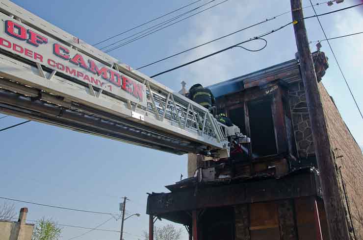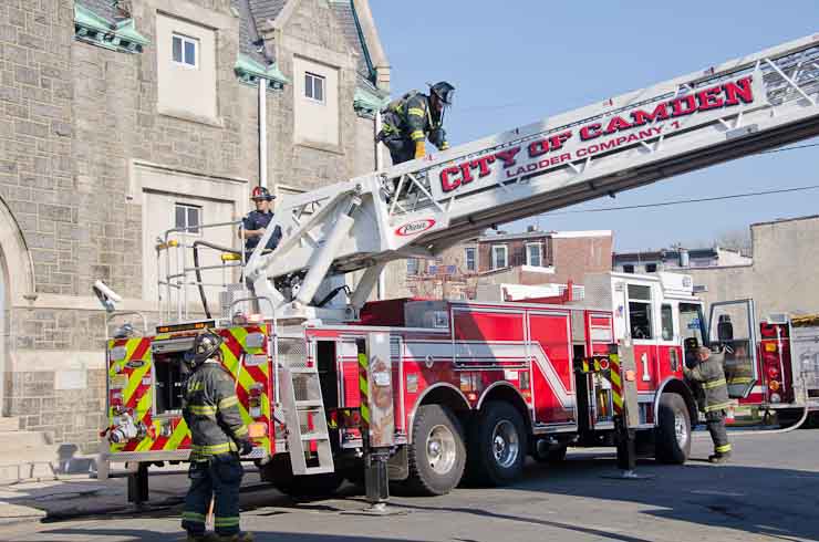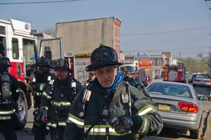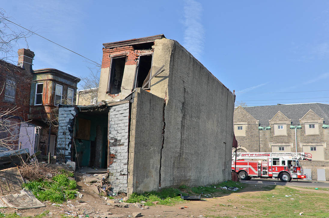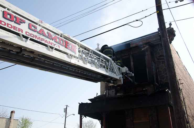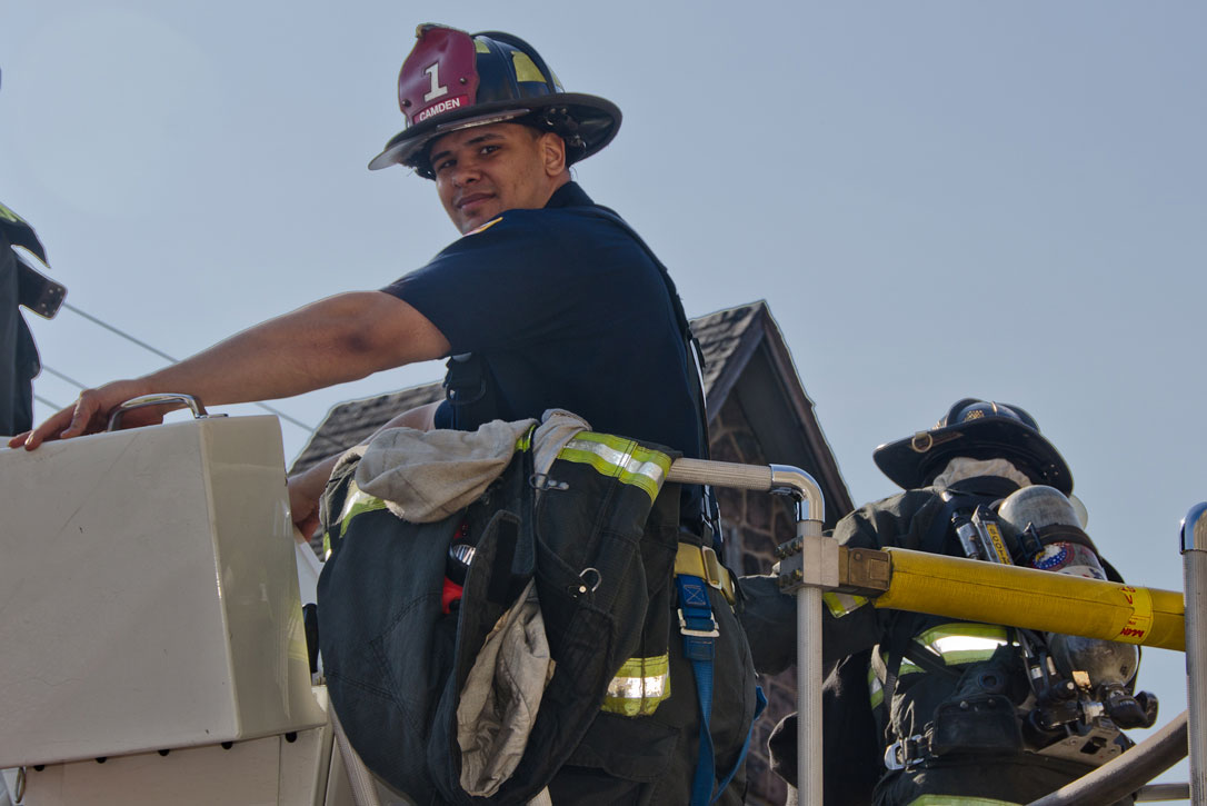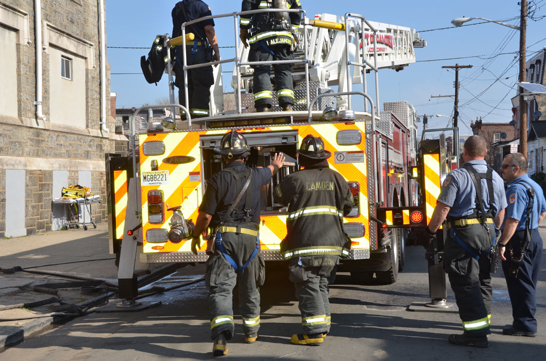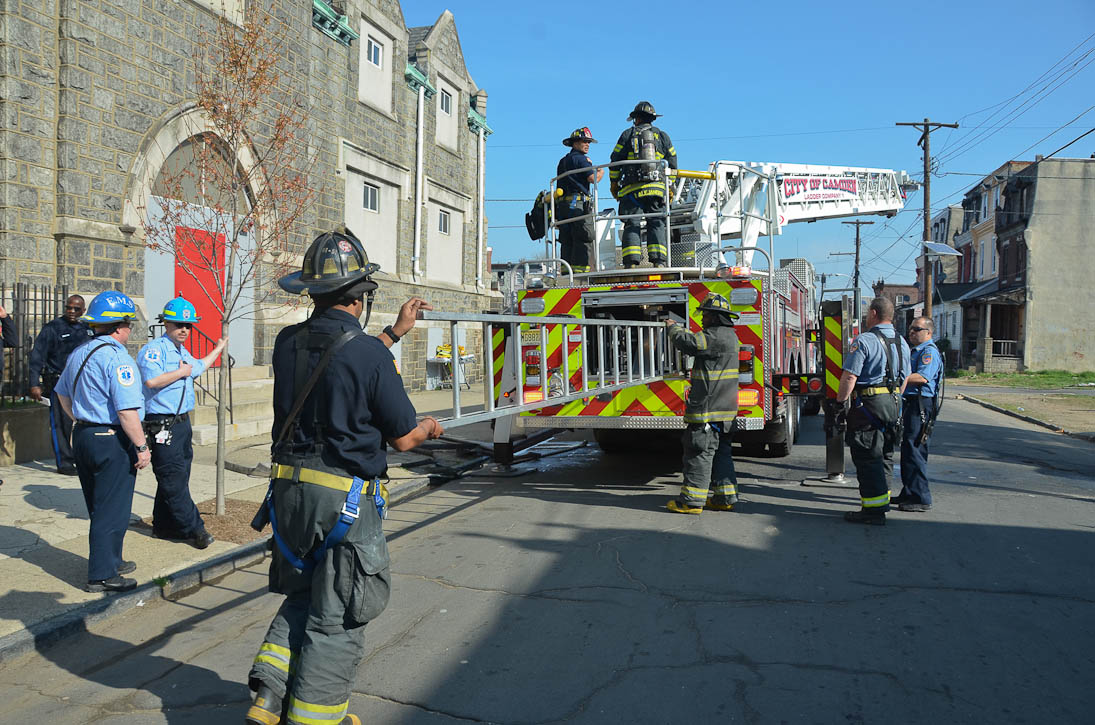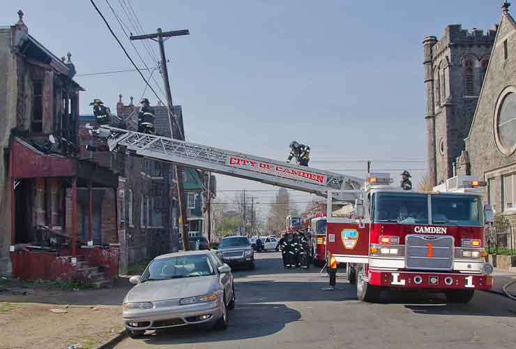 This page and the other pages in this series are the successors to the series of web-page about the Camden Fire Department that began with the page Camden Fire Department: The Fires of the Summer of 2011. On this and other pages in the series you will find pictures and information regarding different events and aspects of the fire service in Camden, New Jersey. At approximately 9:45 PM on March 23, 2012 units of the Camden Fire Department were dispatched to a dwelling a vacant dwelling at 806 North 6th Street in North Camden. This two-story building had once been an attached dwelling, but had long been a stand-alone, and had been the scene of several fires previously. Only three weeks previously the building had been slated for demolition, however, the wreckers had not yet arrived when this fire took place. This was the first of three small fire that the Camden Fire Department addressed that day. All photos here are presented in the order in which they were taken. My first photograph was shot at 9:59 AM. The last picture presented here was taken at 10:22 AM. By 10:47 I was shooting pictures at another fire at Broadway and Washington Street. As with the web page covering other Camden Fire Department events, if you can identify anyone that I've missed, please comment at the bottom of the page. (I'm terrible at at names and faces). April 6, 2012 |