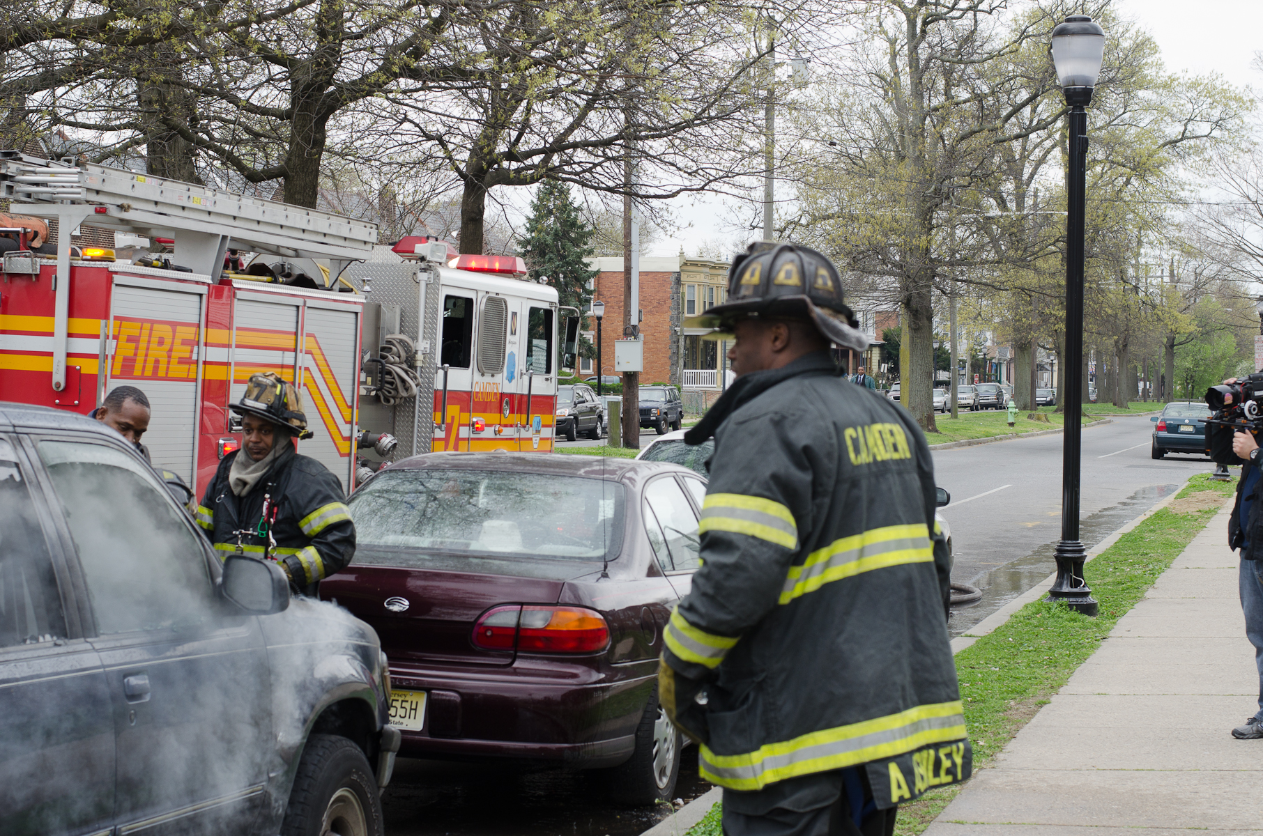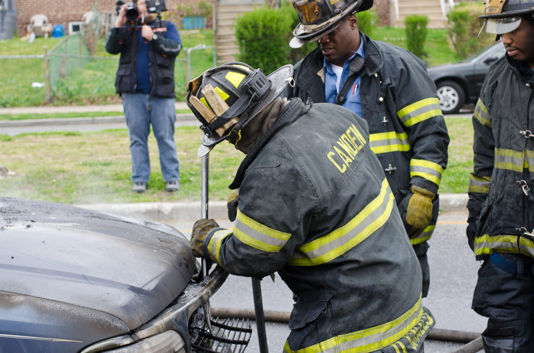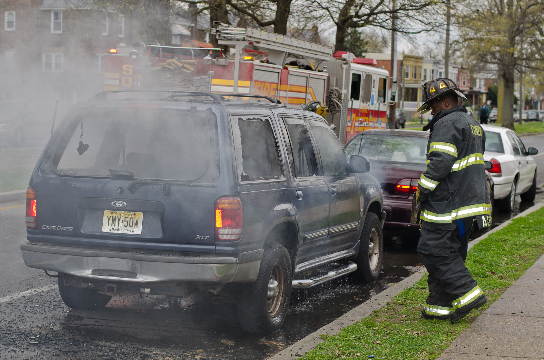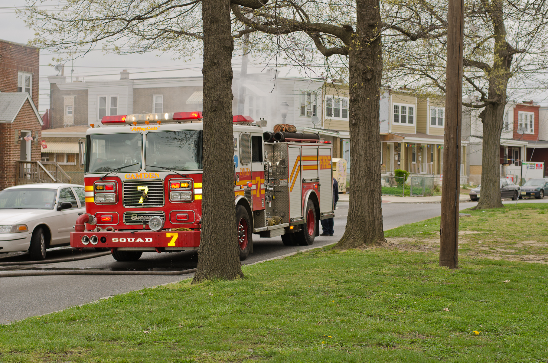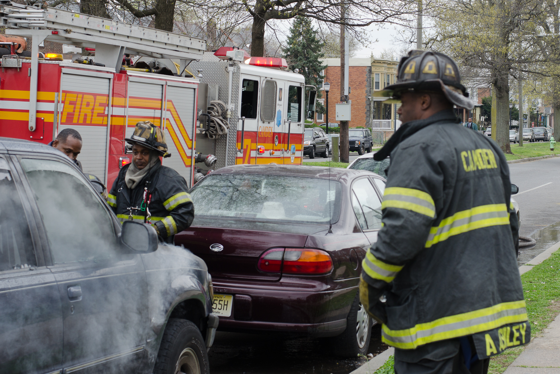 This page and the other pages in this series are the successors to the series of web-page about the Camden Fire Department that began with the page Camden Fire Department: The Fires of the Summer of 2011. On this and other pages in the series you will find pictures and information regarding different events and aspects of the fire service in Camden, New Jersey. A quiet Sunday in Camden found me at Liberty Station, shooting the breeze with fire photographer Dave Hernandez, who also is a Captain with he Medford, New Jersey Fire Department. A call came over the radio concerning a car fire on Park Boulevard, near Empire Avenue, so we jumped into my truck and rode over. Dave shot video, while I took still photos. Squad Company 7, consisting of Captain Al Ashley and firefighters Asante Wilson, David Smalls and Craig Spearman, was on scene with a Ford minivan fully involved. The fire was out when we arrived, but as always there was still much to record. As with the web page covering other Camden Fire Department events, if you can identify anyone that I've missed, please comment at the bottom of the page. (I'm terrible at at names and faces). April 7, 2012 |