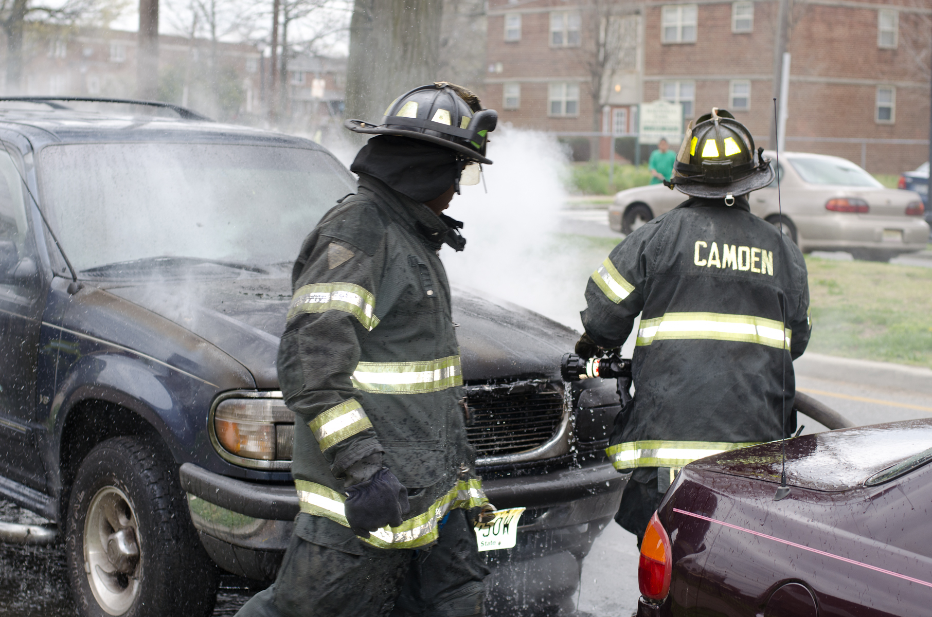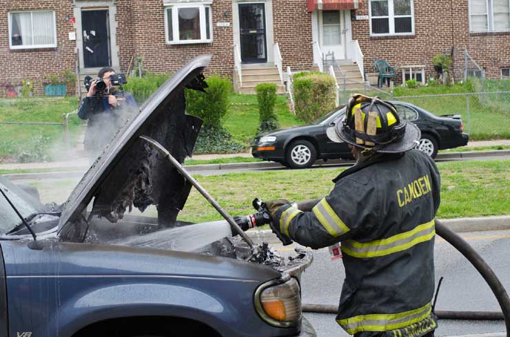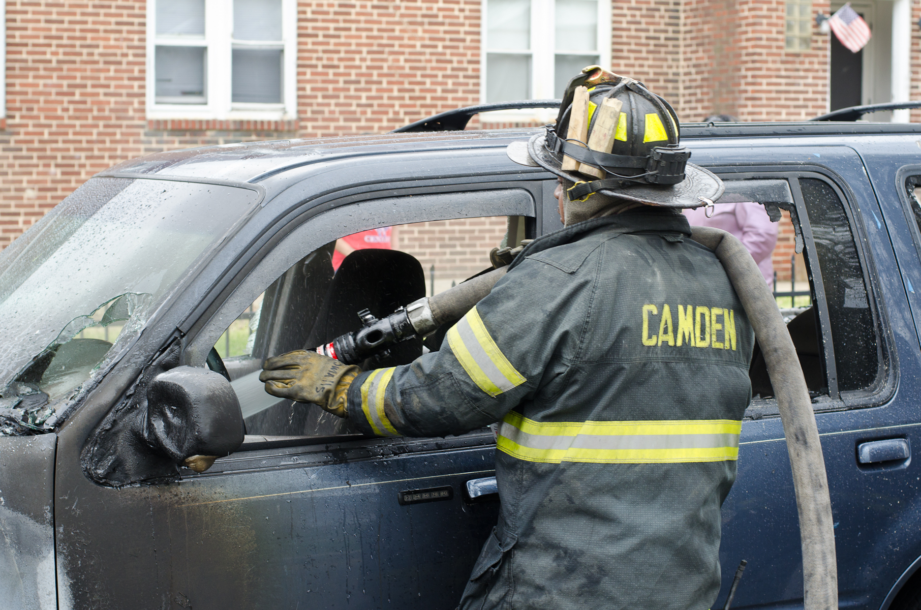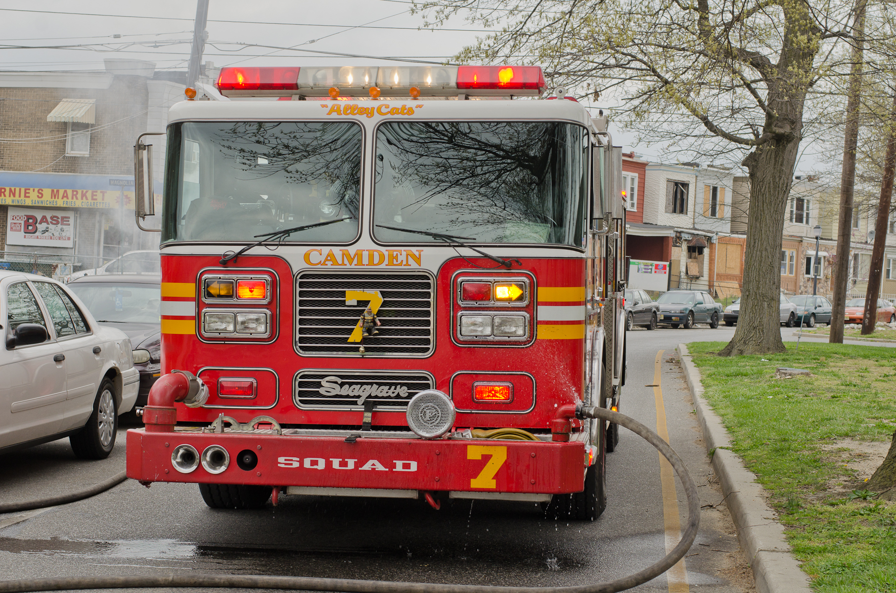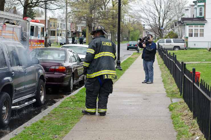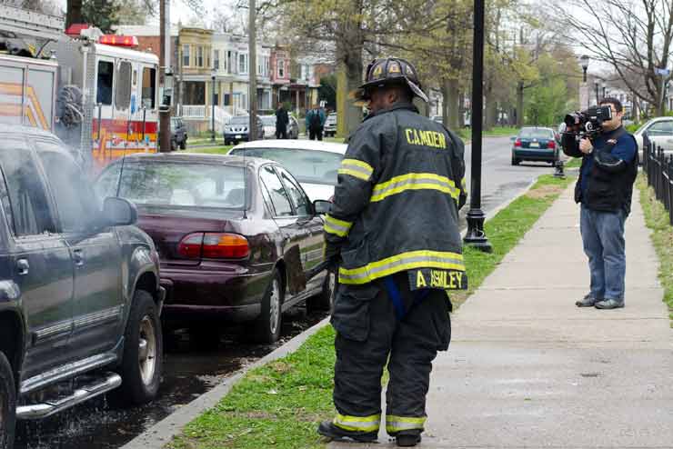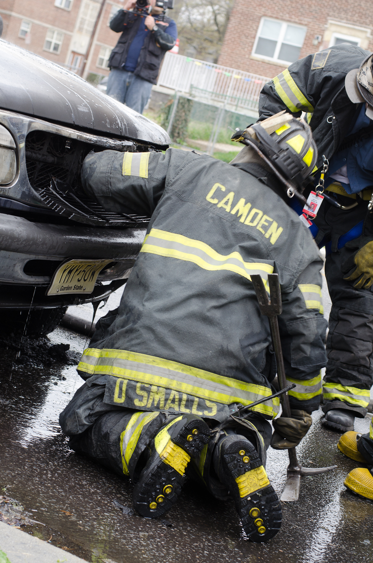 This page and the other pages in this series are the successors to the series of web-page about the Camden Fire Department that began with the page Camden Fire Department: The Fires of the Summer of 2011. On this and other pages in the series you will find pictures and information regarding different events and aspects of the fire service in Camden, New Jersey. A quiet Sunday in Camden found me at Liberty Station, shooting the breeze with fire photographer Dave Hernandez, who also is a Captain with he Medford, New Jersey Fire Department. A call came over the radio concerning a car fire on Park Boulevard, near Empire Avenue, so we jumped into my truck and rode over. Dave shot video, while I took still photos. Squad Company 7, consisting of Captain Al Ashley and firefighters Asante Wilson, David Smalls and Craig Spearman, was on scene with a Ford minivan fully involved. The fire was out when we arrived, but as always there was still much to record. As with the web page covering other Camden Fire Department events, if you can identify anyone that I've missed, please comment at the bottom of the page. (I'm terrible at at names and faces). April 7, 2012 |