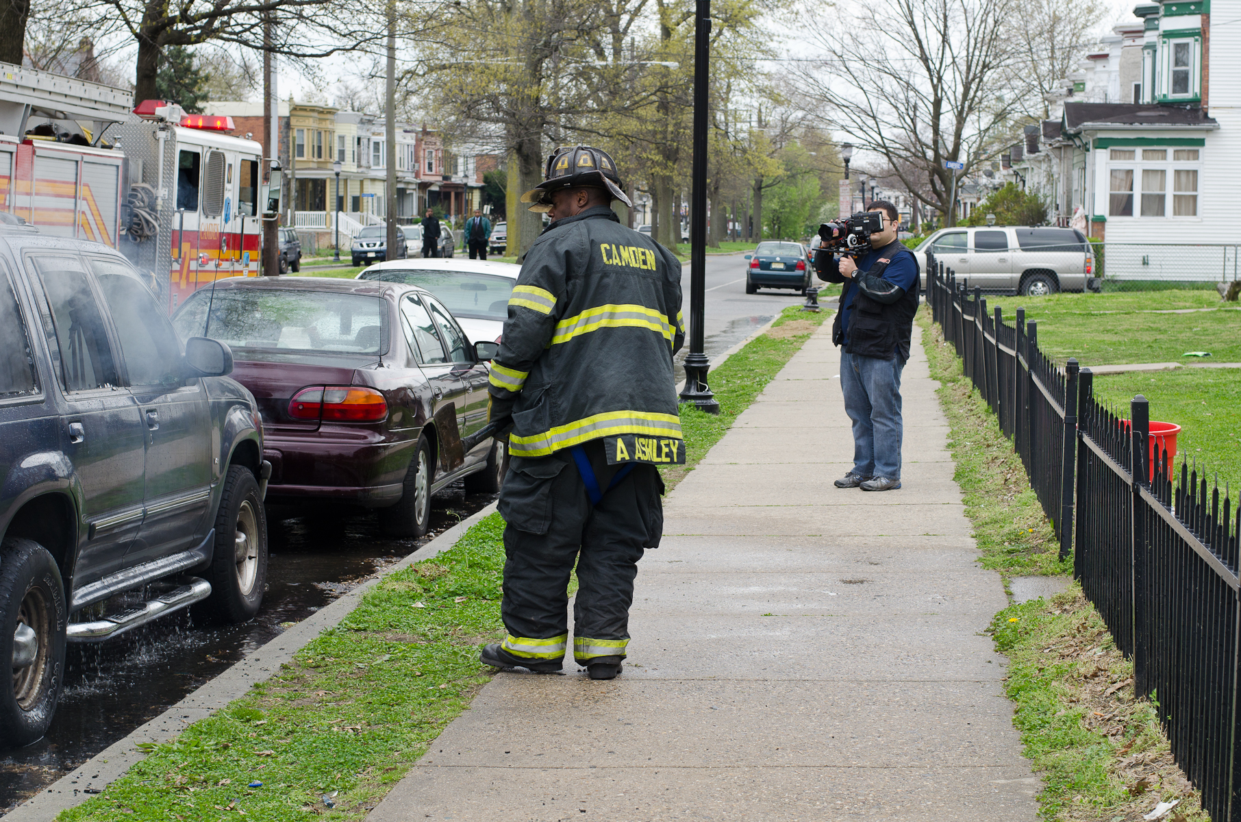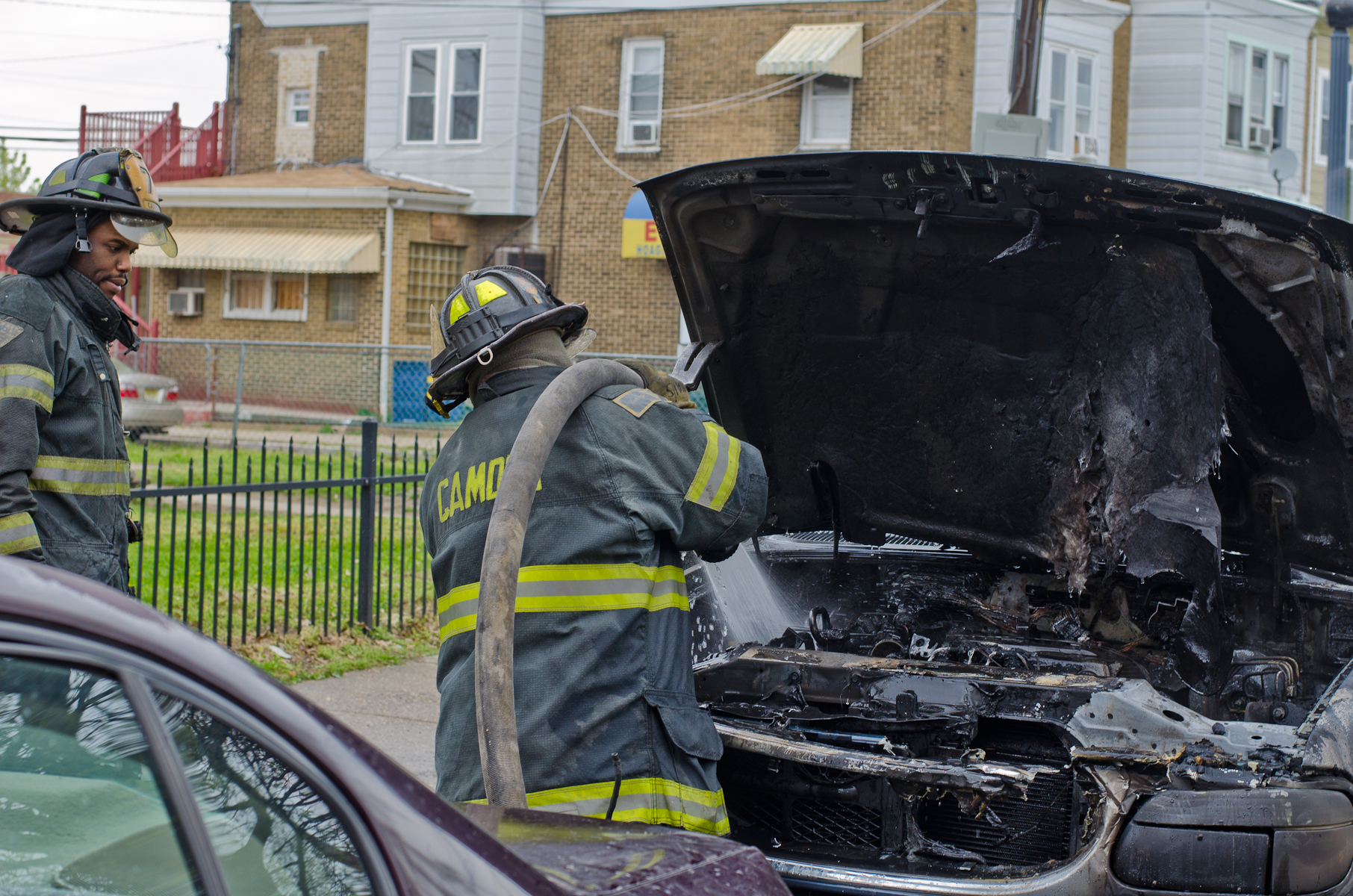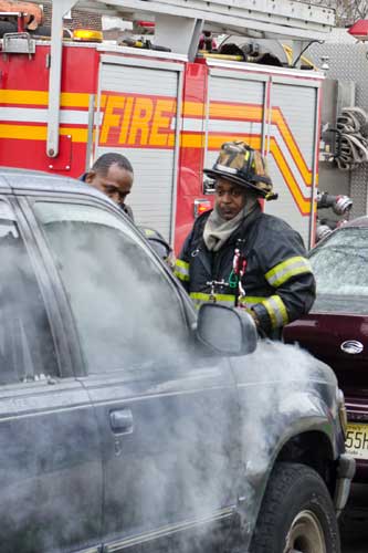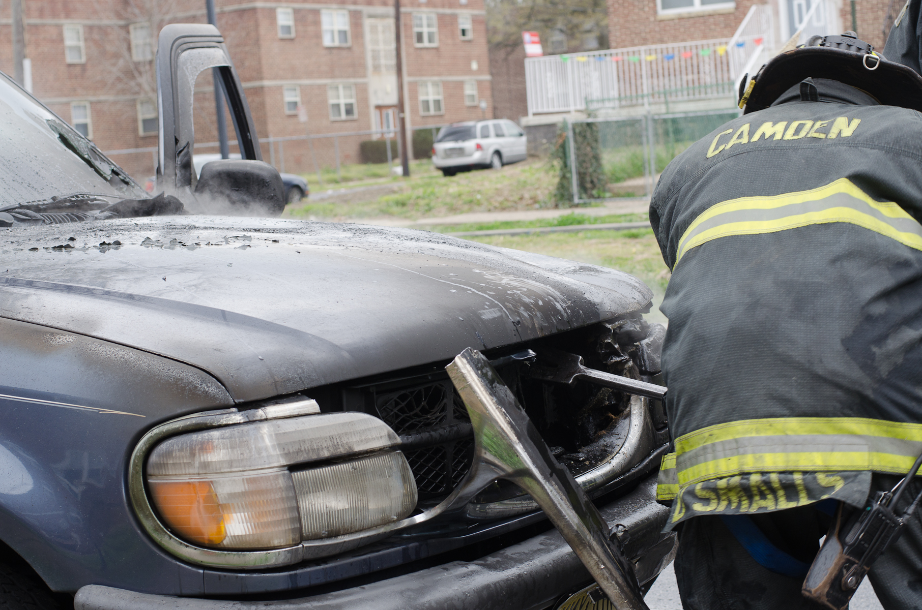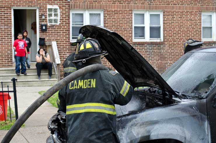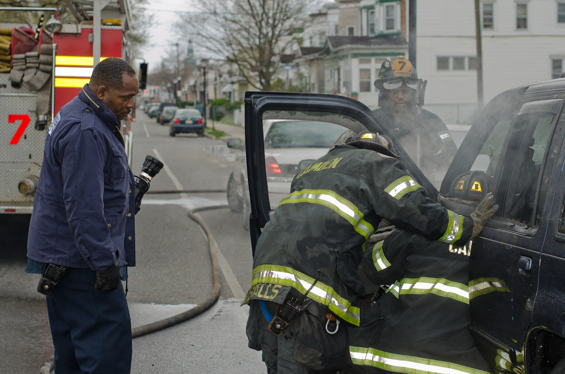 This page and the other pages in this series are the successors to the series of web-page about the Camden Fire Department that began with the page Camden Fire Department: The Fires of the Summer of 2011. On this and other pages in the series you will find pictures and information regarding different events and aspects of the fire service in Camden, New Jersey. A quiet Sunday in Camden found me at Liberty Station, shooting the breeze with fire photographer Dave Hernandez, who also is a Captain with he Medford, New Jersey Fire Department. A call came over the radio concerning a car fire on Park Boulevard, near Empire Avenue, so we jumped into my truck and rode over. Dave shot video, while I took still photos. Squad Company 7, consisting of Captain Al Ashley and firefighters Asante Wilson, David Smalls and Craig Spearman, was on scene with a Ford minivan fully involved. The fire was out when we arrived, but as always there was still much to record. As with the web page covering other Camden Fire Department events, if you can identify anyone that I've missed, please comment at the bottom of the page. (I'm terrible at at names and faces). April 7, 2012 |