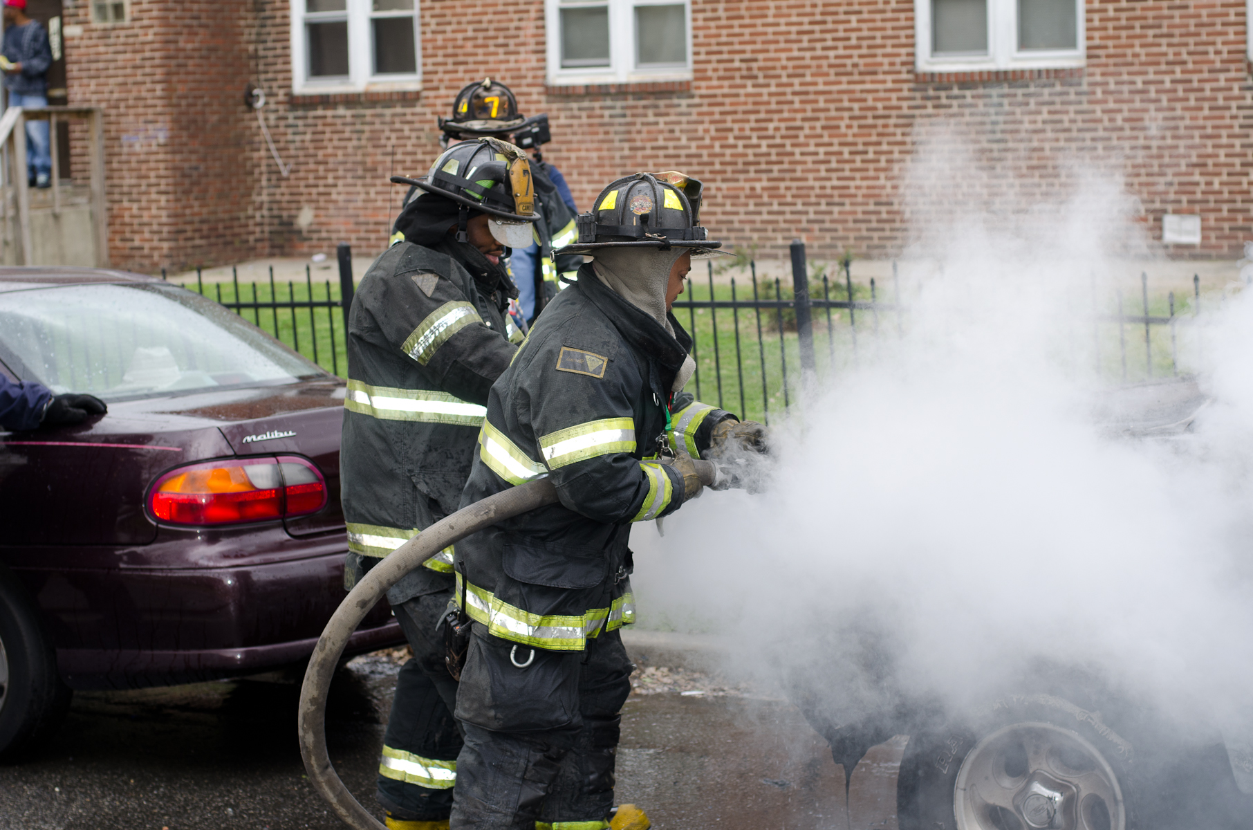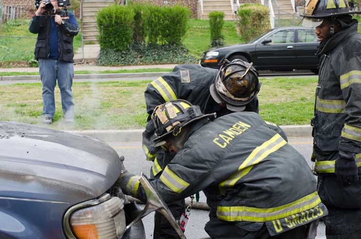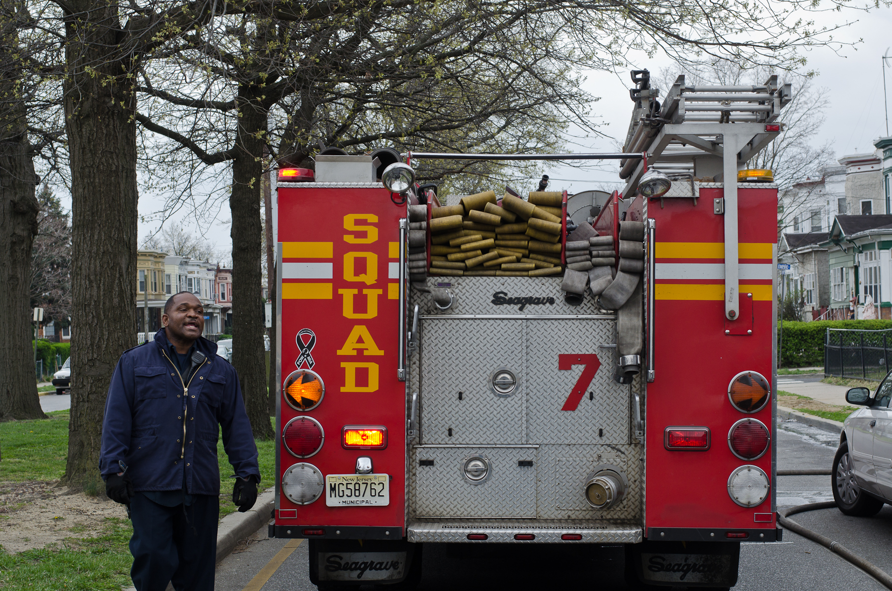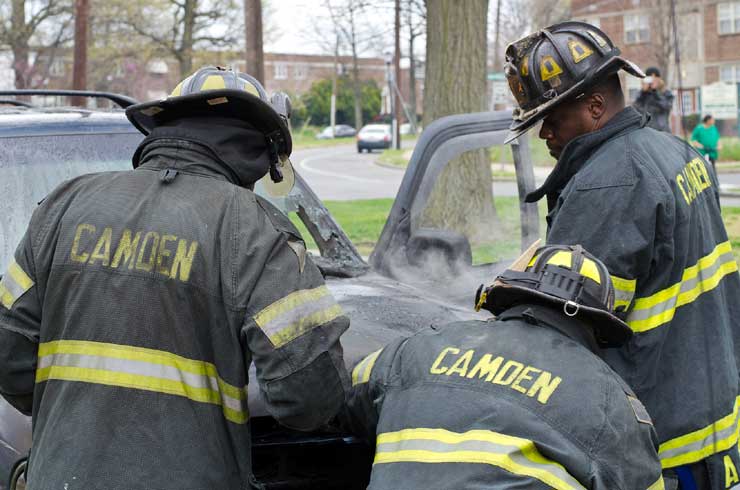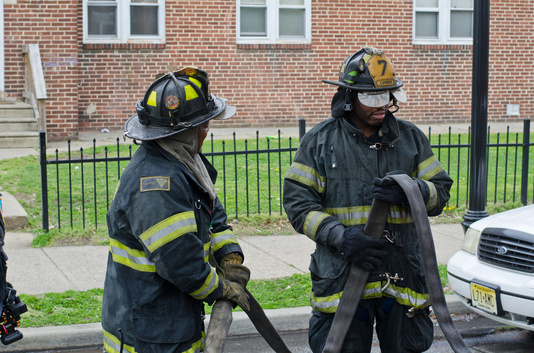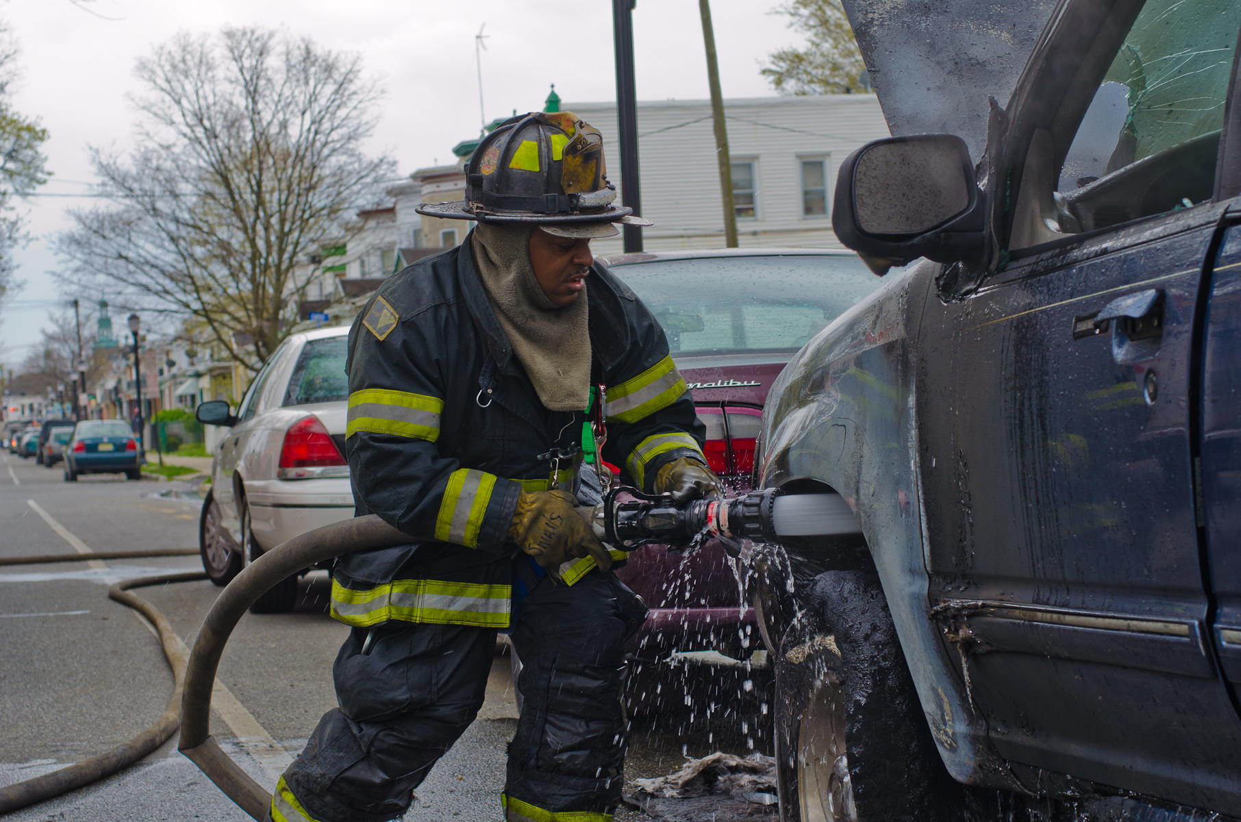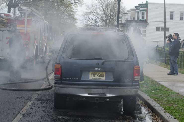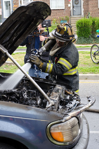 This page and the other pages in this series are the successors to the series of web-page about the Camden Fire Department that began with the page Camden Fire Department: The Fires of the Summer of 2011. On this and other pages in the series you will find pictures and information regarding different events and aspects of the fire service in Camden, New Jersey. A quiet Sunday in Camden found me at Liberty Station, shooting the breeze with fire photographer Dave Hernandez, who also is a Captain with he Medford, New Jersey Fire Department. A call came over the radio concerning a car fire on Park Boulevard, near Empire Avenue, so we jumped into my truck and rode over. Dave shot video, while I took still photos. Squad Company 7, consisting of Captain Al Ashley and firefighters Asante Wilson, David Smalls and Craig Spearman, was on scene with a Ford minivan fully involved. The fire was out when we arrived, but as always there was still much to record. As with the web page covering other Camden Fire Department events, if you can identify anyone that I've missed, please comment at the bottom of the page. (I'm terrible at at names and faces). April 7, 2012 |