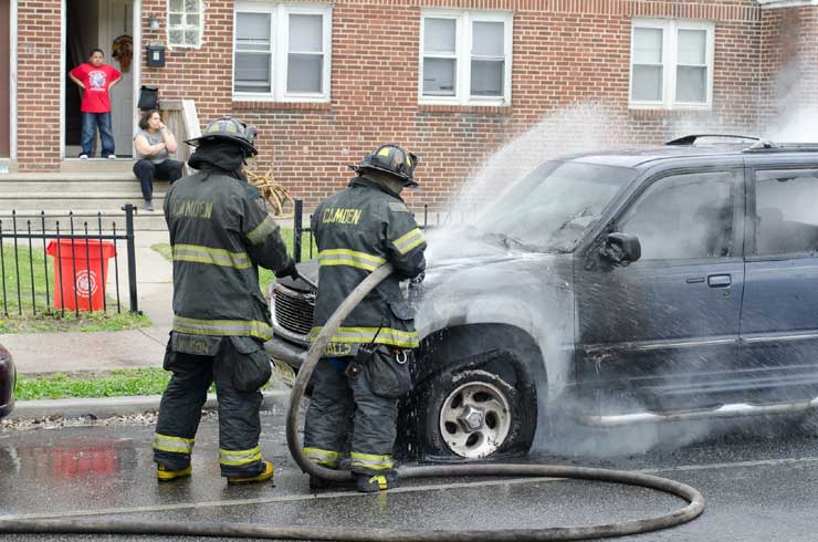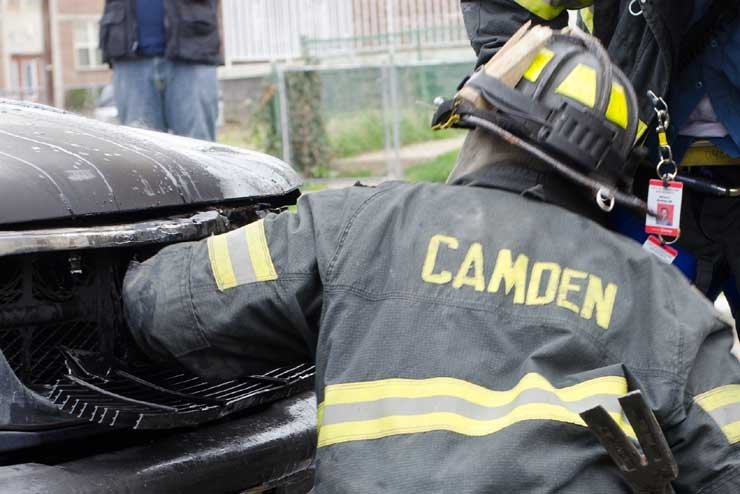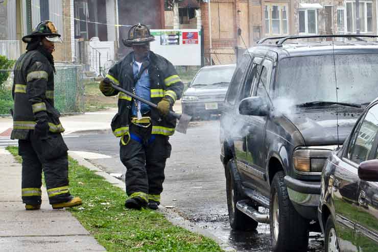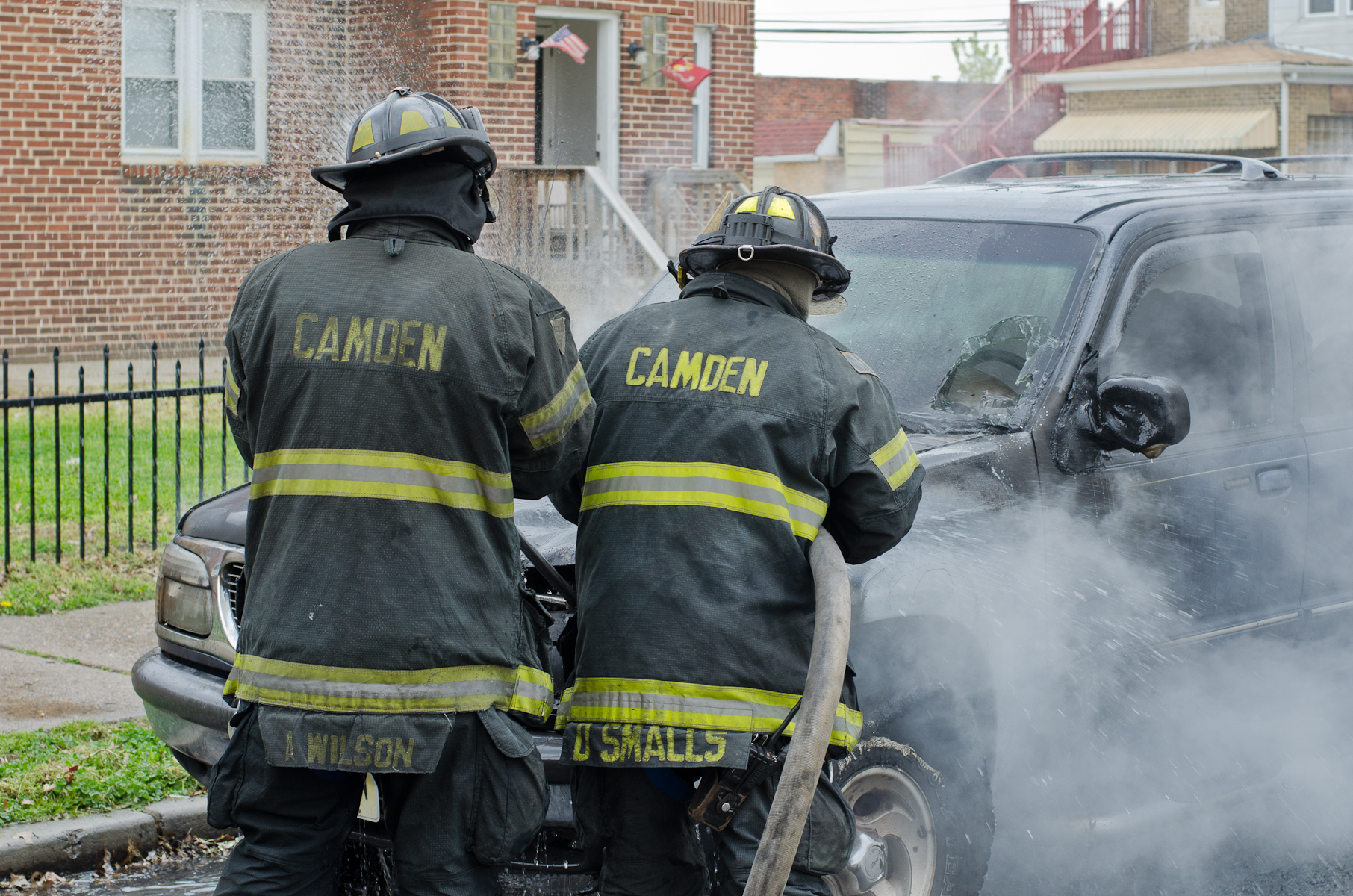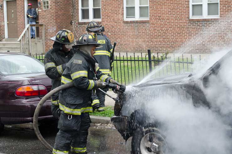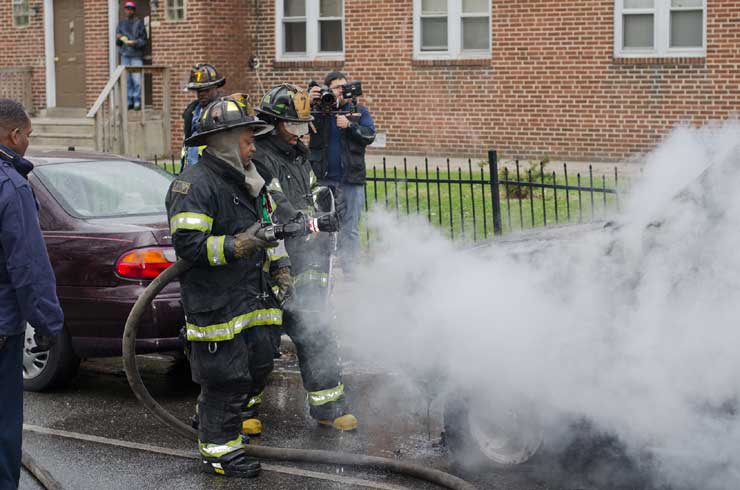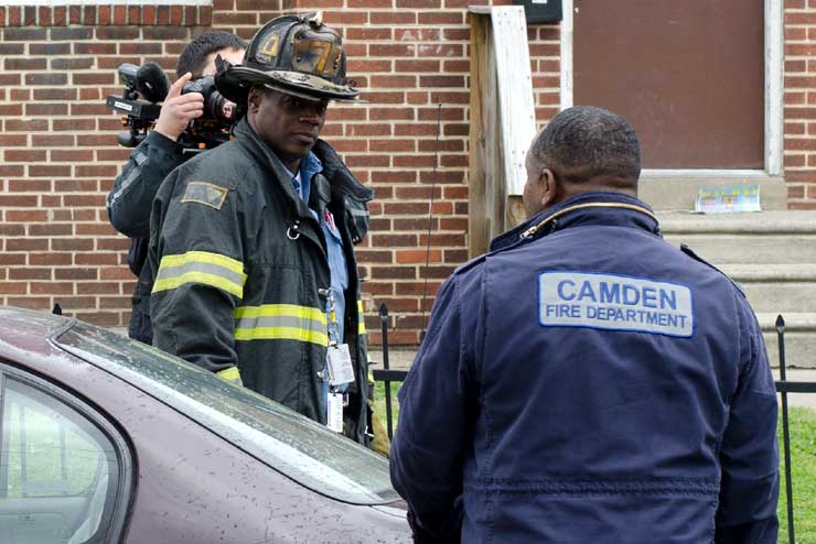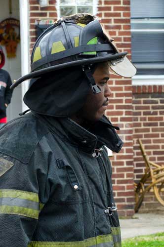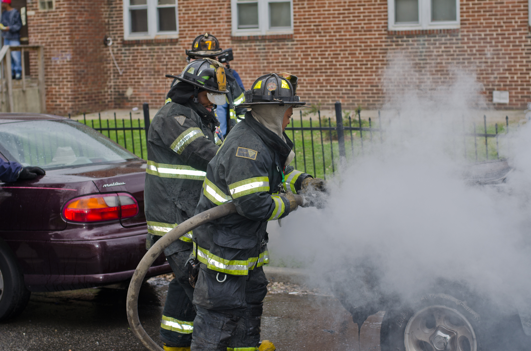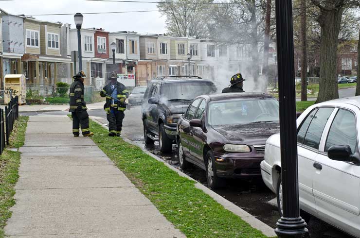 This page and the other pages in this series are the successors to the series of web-page about the Camden Fire Department that began with the page Camden Fire Department: The Fires of the Summer of 2011. On this and other pages in the series you will find pictures and information regarding different events and aspects of the fire service in Camden, New Jersey. A quiet Sunday in Camden found me at Liberty Station, shooting the breeze with fire photographer Dave Hernandez, who also is a Captain with he Medford, New Jersey Fire Department. A call came over the radio concerning a car fire on Park Boulevard, near Empire Avenue, so we jumped into my truck and rode over. Dave shot video, while I took still photos. Squad Company 7, consisting of Captain Al Ashley and firefighters Asante Wilson, David Smalls and Craig Spearman, was on scene with a Ford minivan fully involved. The fire was out when we arrived, but as always there was still much to record. As with the web page covering other Camden Fire Department events, if you can identify anyone that I've missed, please comment at the bottom of the page. (I'm terrible at at names and faces). April 7, 2012 |