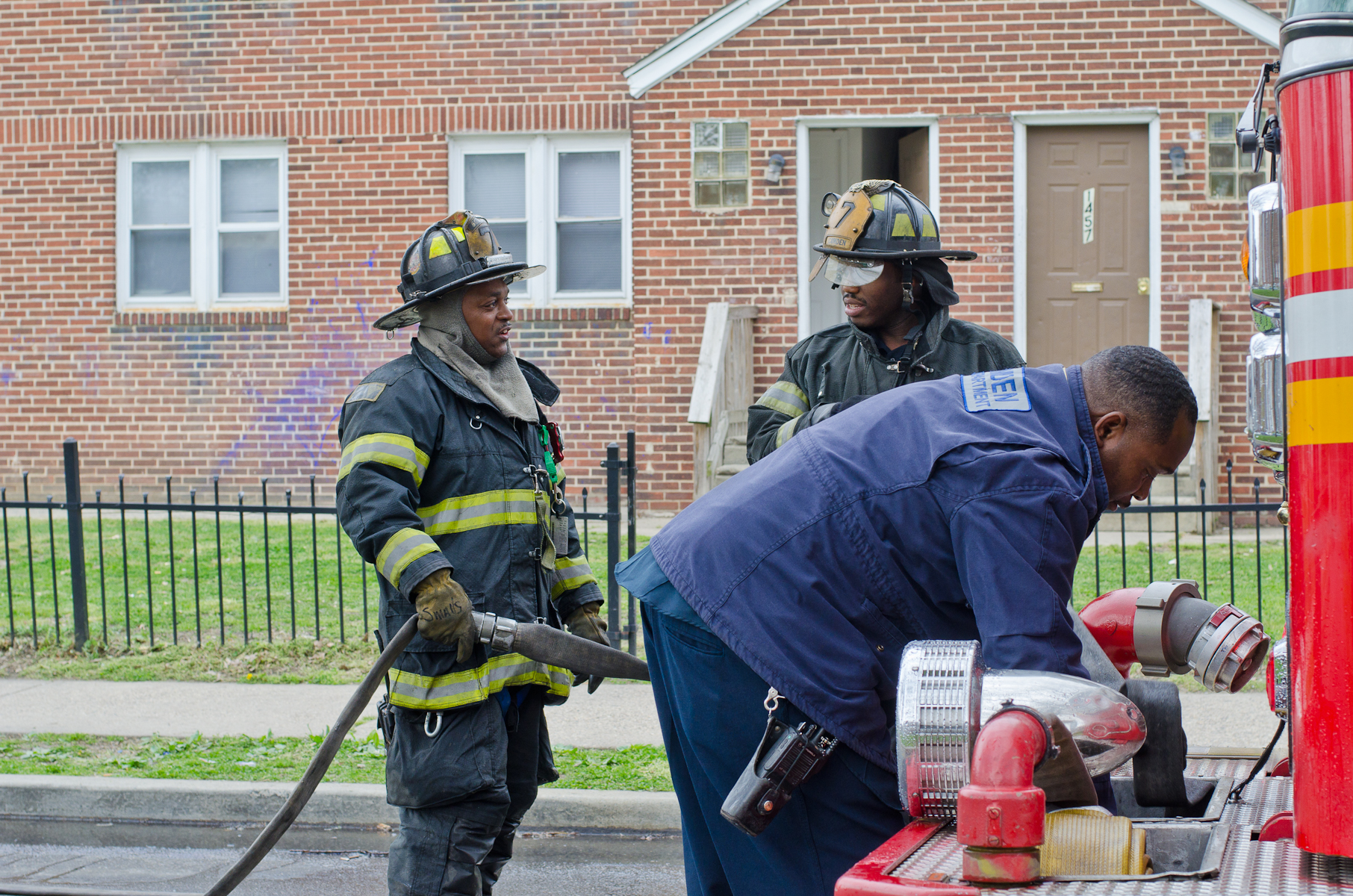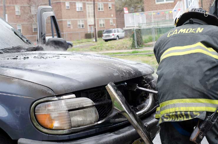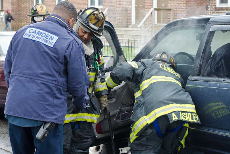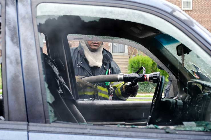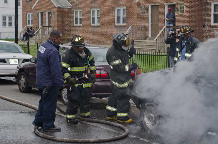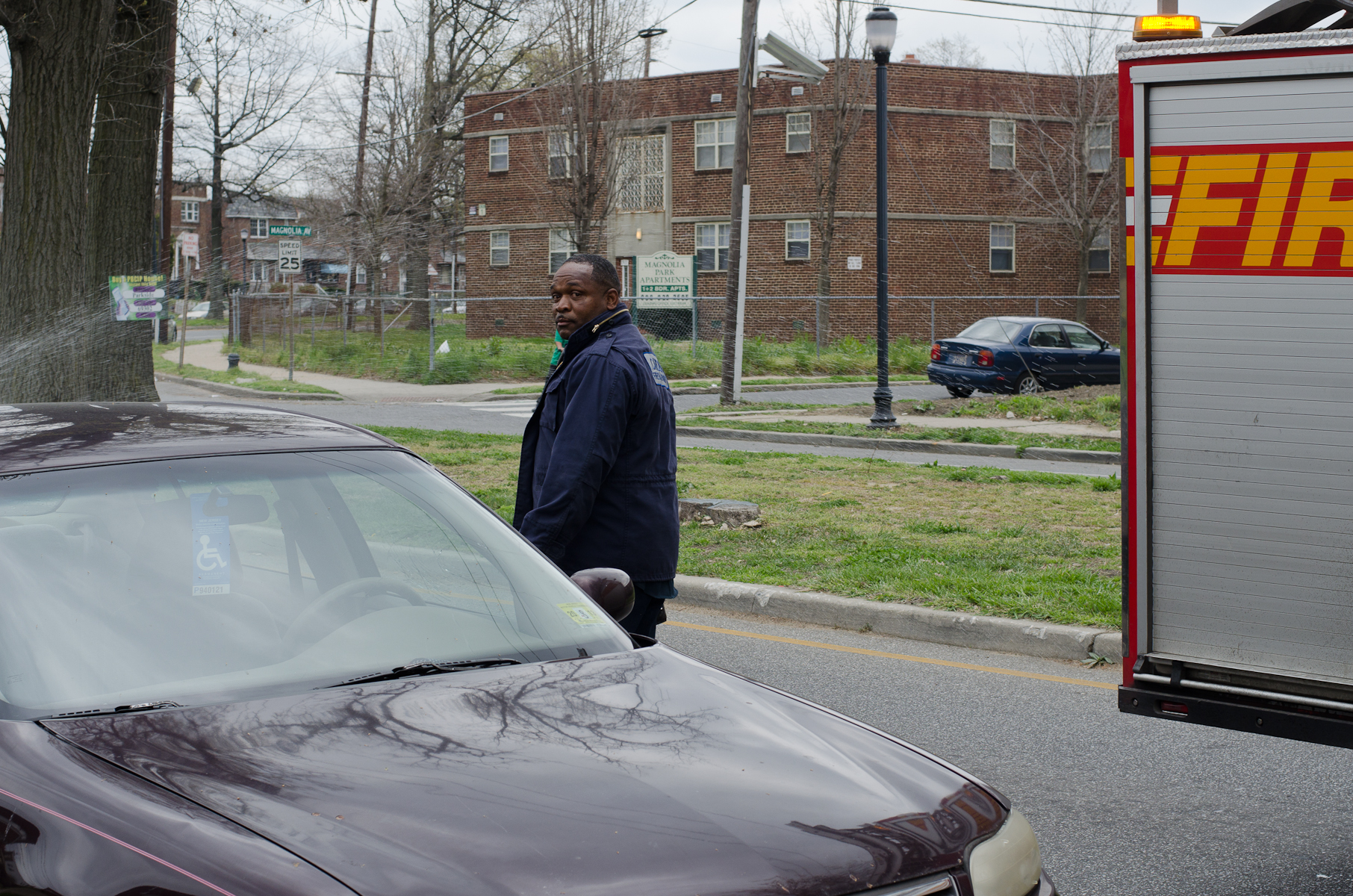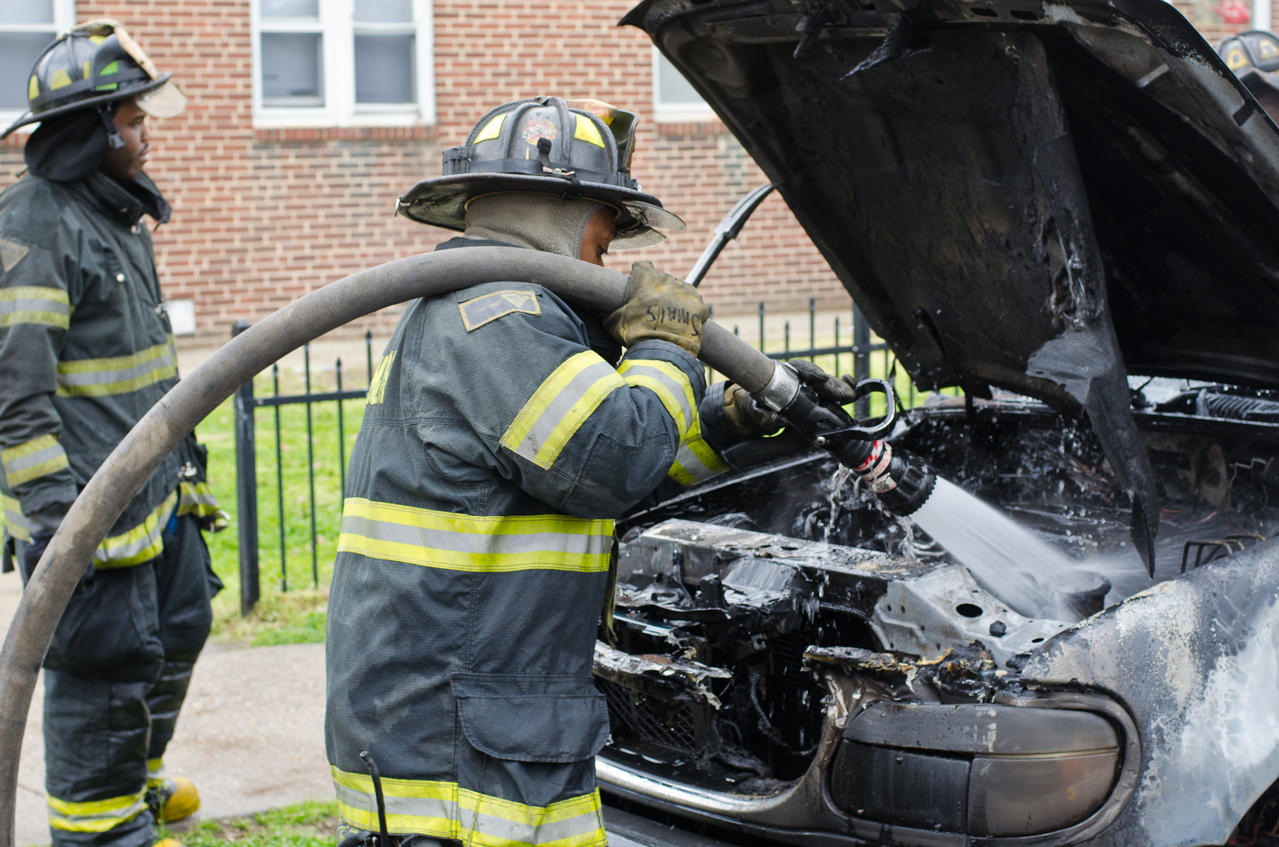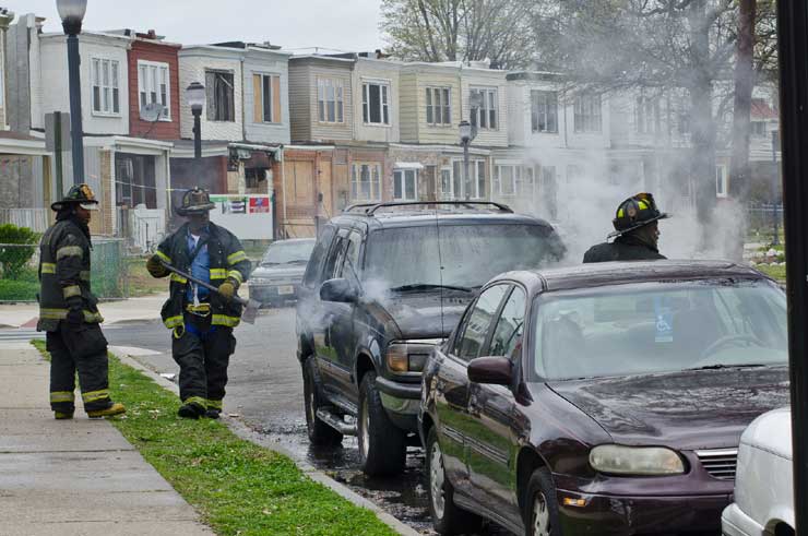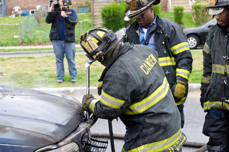 This page and the other pages in this series are the successors to the series of web-page about the Camden Fire Department that began with the page Camden Fire Department: The Fires of the Summer of 2011. On this and other pages in the series you will find pictures and information regarding different events and aspects of the fire service in Camden, New Jersey. A quiet Sunday in Camden found me at Liberty Station, shooting the breeze with fire photographer Dave Hernandez, who also is a Captain with he Medford, New Jersey Fire Department. A call came over the radio concerning a car fire on Park Boulevard, near Empire Avenue, so we jumped into my truck and rode over. Dave shot video, while I took still photos. Squad Company 7, consisting of Captain Al Ashley and firefighters Asante Wilson, David Smalls and Craig Spearman, was on scene with a Ford minivan fully involved. The fire was out when we arrived, but as always there was still much to record. As with the web page covering other Camden Fire Department events, if you can identify anyone that I've missed, please comment at the bottom of the page. (I'm terrible at at names and faces). April 7, 2012 |