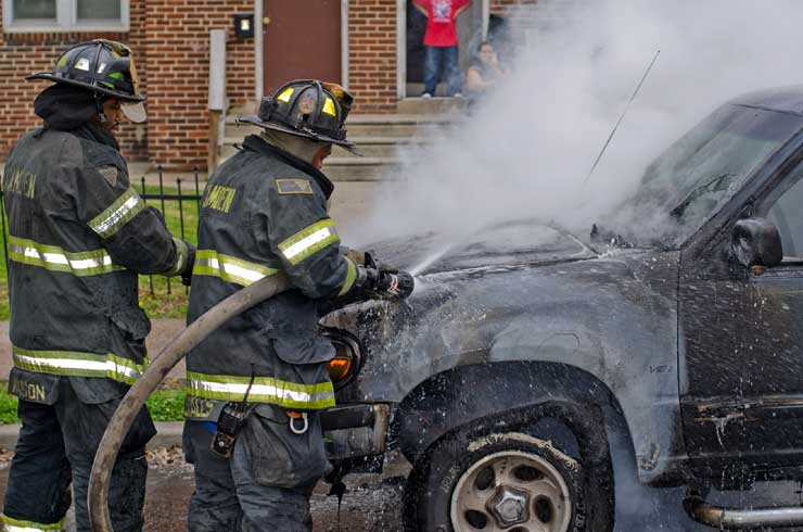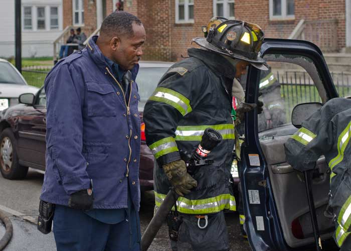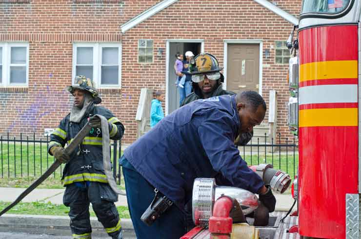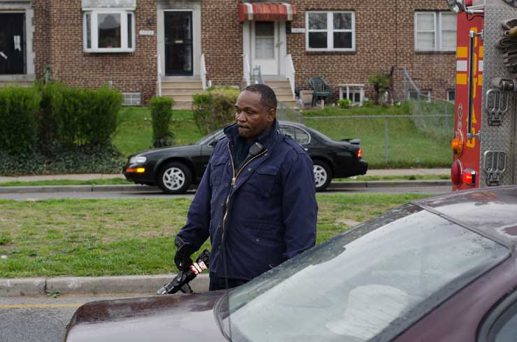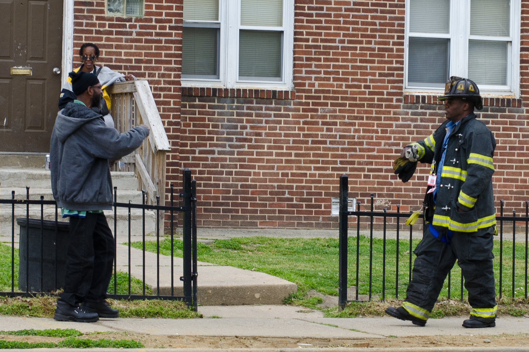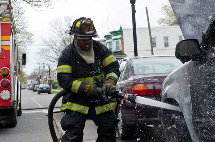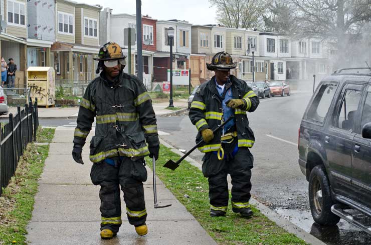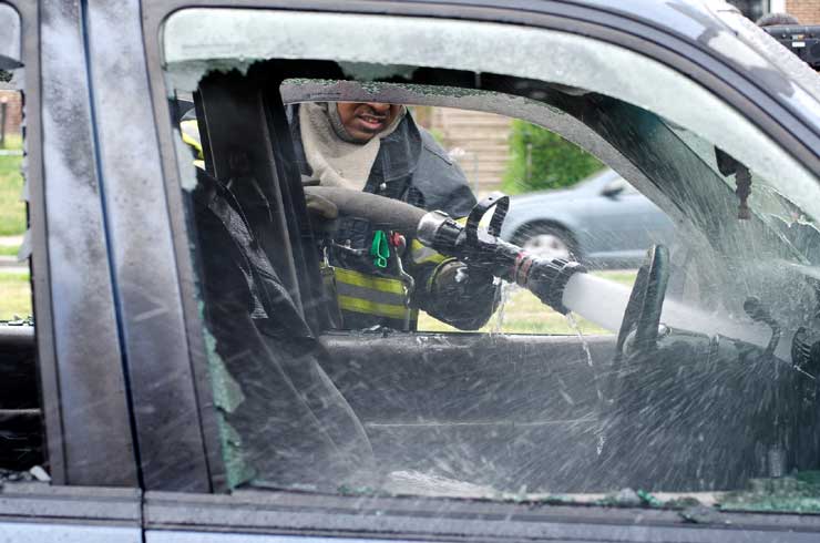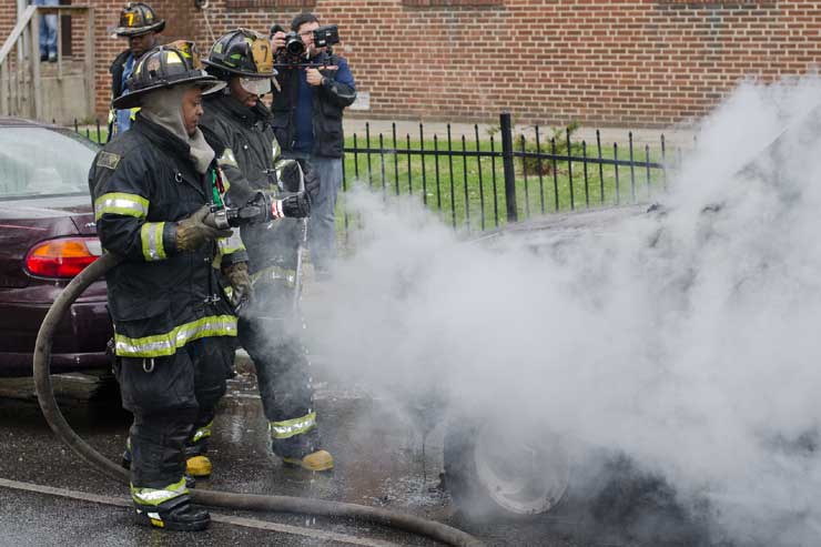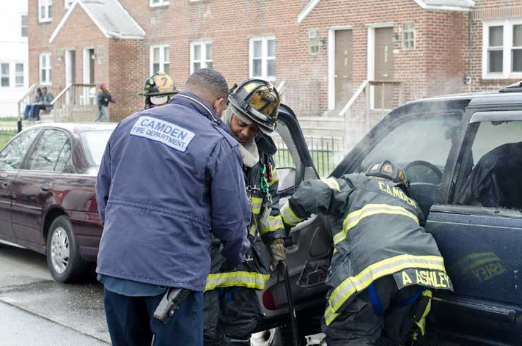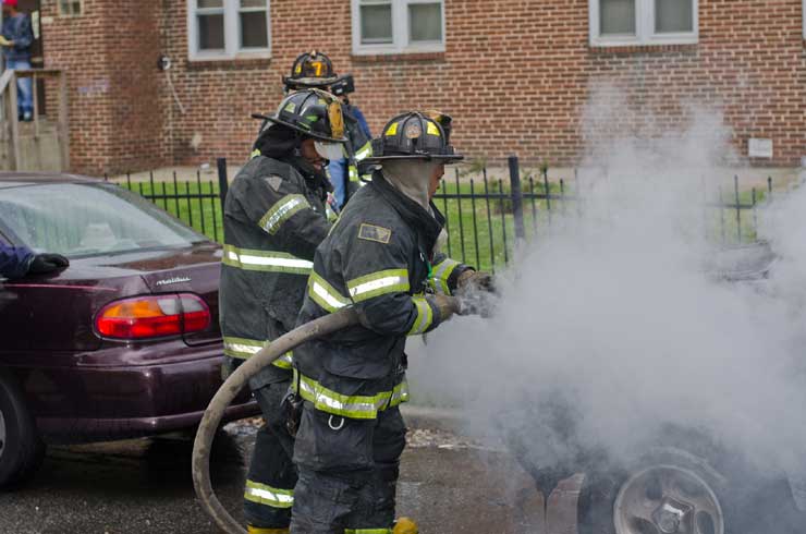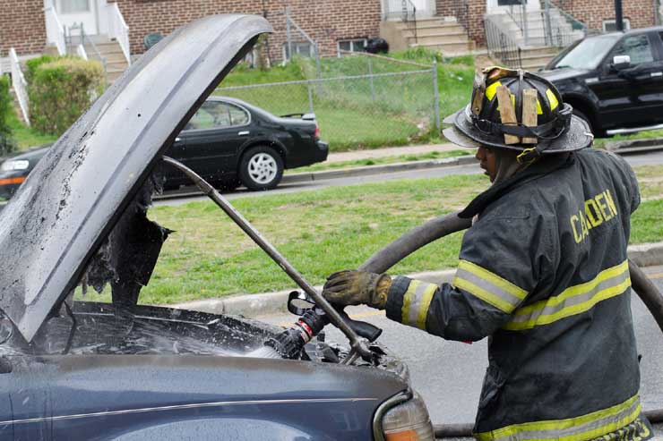 This page and the other pages in this series are the successors to the series of web-page about the Camden Fire Department that began with the page Camden Fire Department: The Fires of the Summer of 2011. On this and other pages in the series you will find pictures and information regarding different events and aspects of the fire service in Camden, New Jersey. A quiet Sunday in Camden found me at Liberty Station, shooting the breeze with fire photographer Dave Hernandez, who also is a Captain with he Medford, New Jersey Fire Department. A call came over the radio concerning a car fire on Park Boulevard, near Empire Avenue, so we jumped into my truck and rode over. Dave shot video, while I took still photos. Squad Company 7, consisting of Captain Al Ashley and firefighters Asante Wilson, David Smalls and Craig Spearman, was on scene with a Ford minivan fully involved. The fire was out when we arrived, but as always there was still much to record. As with the web page covering other Camden Fire Department events, if you can identify anyone that I've missed, please comment at the bottom of the page. (I'm terrible at at names and faces). April 7, 2012 |
