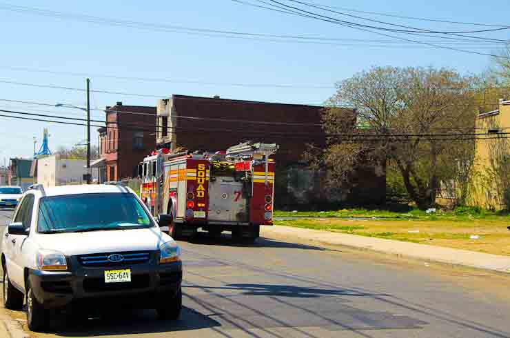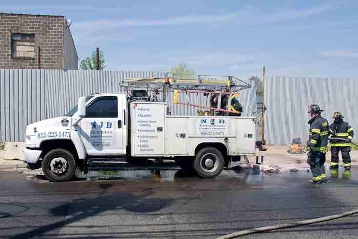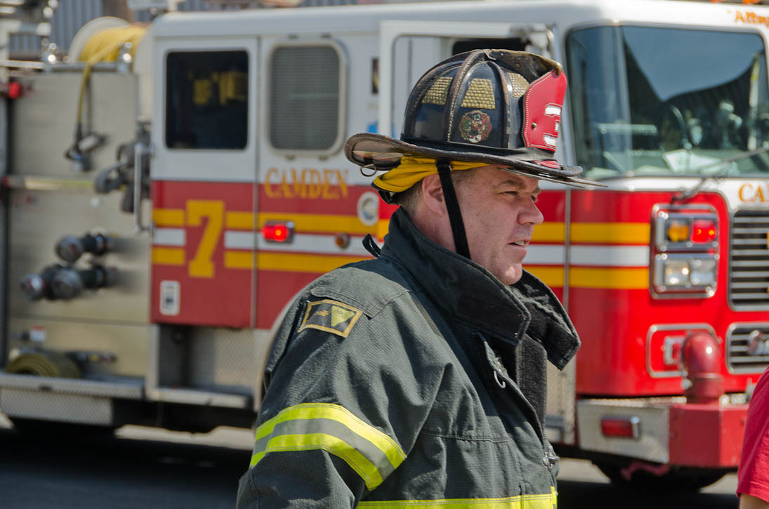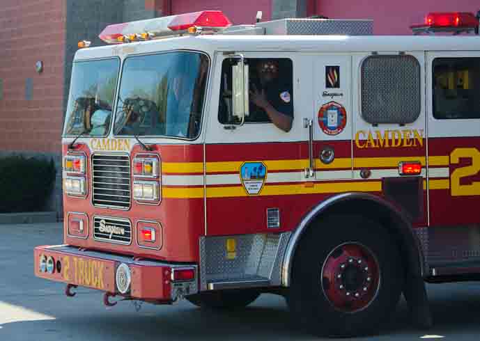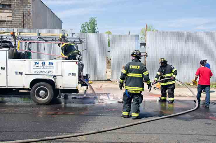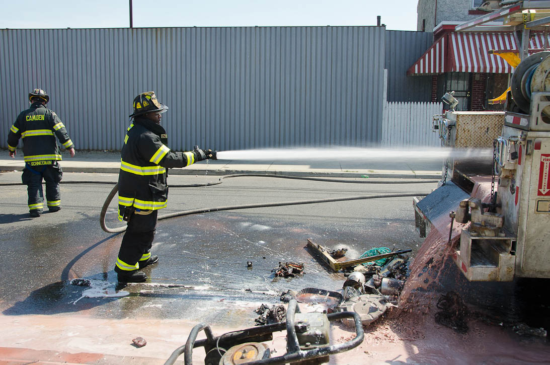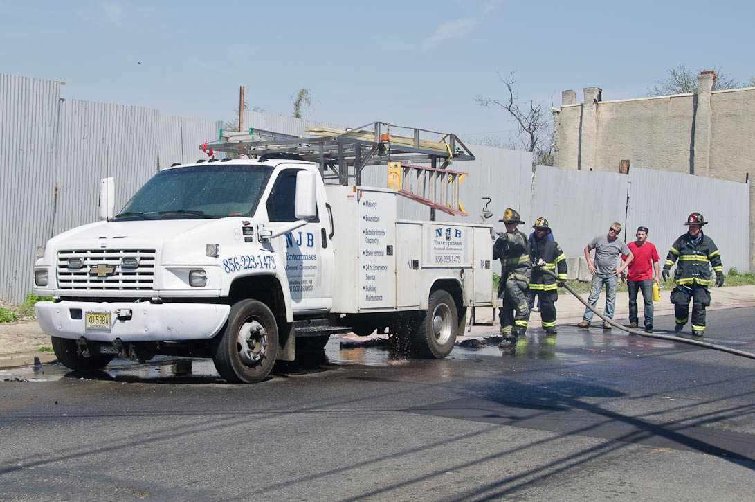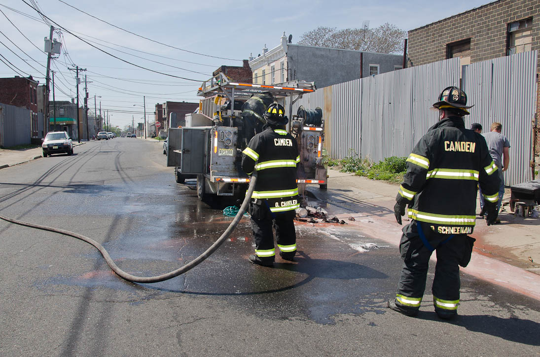 This page and the other pages in this series are the successors to the series of web-page about the Camden Fire Department that began with the page Camden Fire Department: The Fires of the Summer of 2011. On this and other pages in the series you will find pictures and information regarding different events and aspects of the fire service in Camden, New Jersey. I was in town with a friend, Merchantville volunteer fireman Rob Kanauss, running a few errands and stopping in to say hello here and there. After spending some time at the East Camden firehouse we had gone downtown and were at Fire Headquarters when a call came in concerning a car fire at South 7th and Chestnut Streets. We drove on down, making pretty good time taking the back streets, and got to the 600 block of Chestnut Street to find Squad Company 7 operating. A utility body truck had been traveling northbound on Route 676 when materials in the rear had ignited. The driver got off the highway at Atlantic Avenue, unaware of his problem until pedestrians in the vicinity of South 7th Street and Kaighn Avenue alerted him. Squad 7 made short work of the fire. We stopped by Liberty Station for a bit, before leaving the city when Ladder 2 went off to the Maintenance Shop. Before we left Camden Fire Department member Craig Spearman drove past, and I got a shot of him driving his car! It was home for me to take my dogs for their daily late afternoon walk… not knowing that I would be back in Camden within a few hours to photograph a dwelling fire at 2819 Benson Street. As with the web page covering other Camden Fire Department events, if you can identify anyone that I've missed, please comment at the bottom of the page. (I'm terrible at at names and faces). May 8, 2012 |