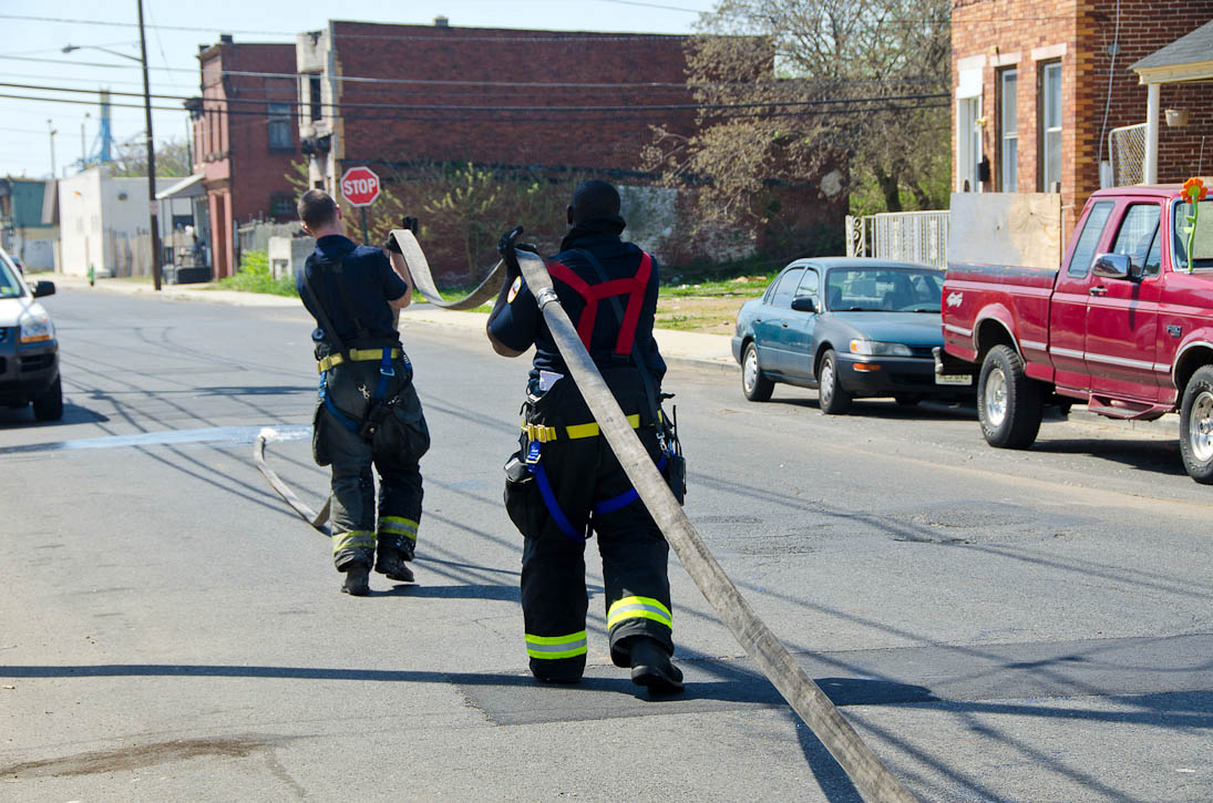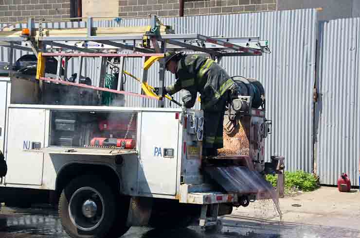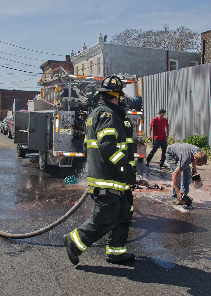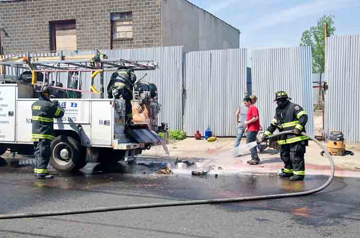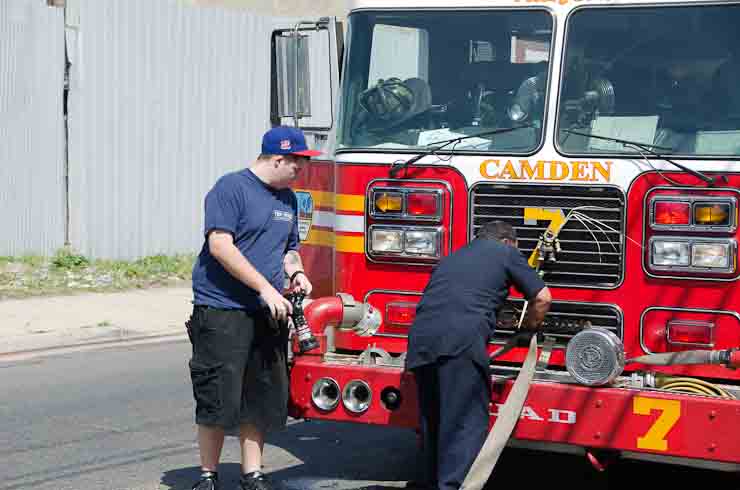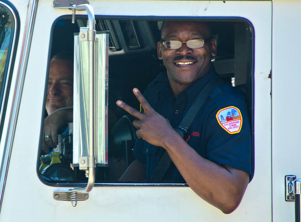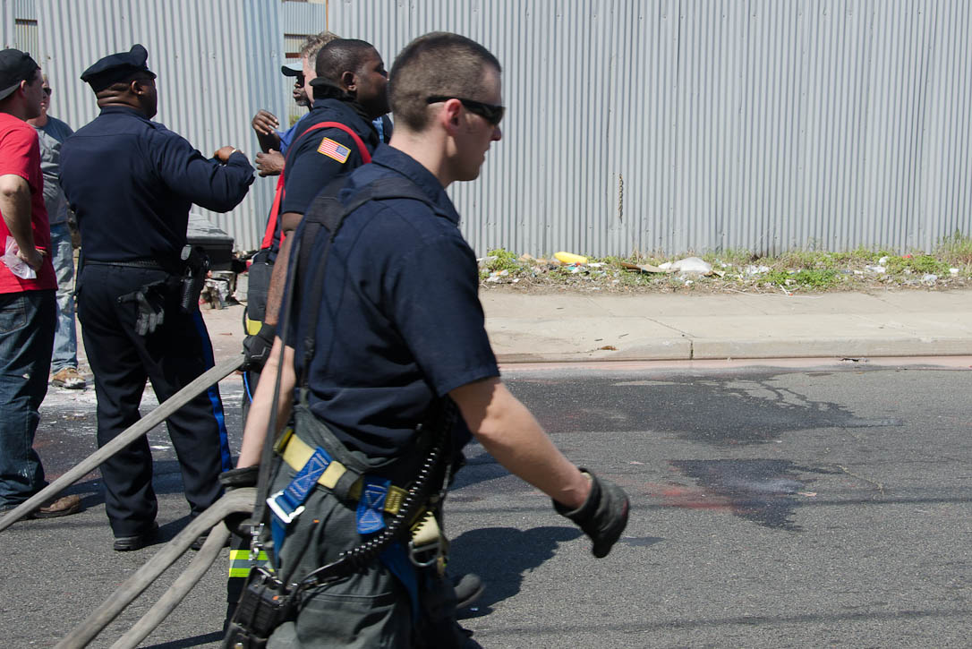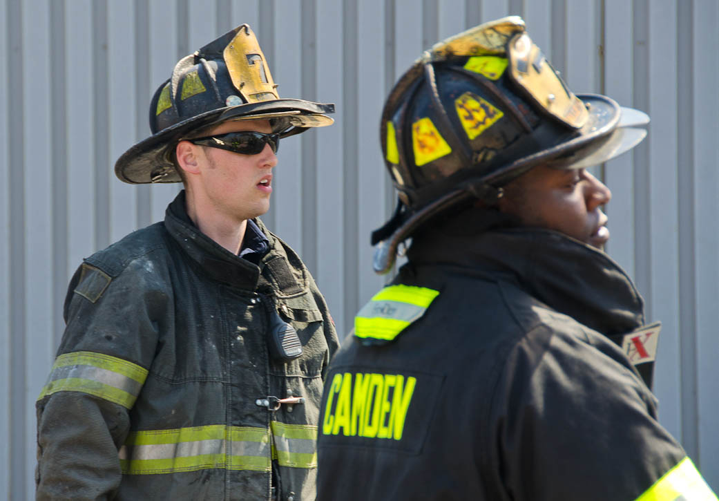 This page and the other pages in this series are the successors to the series of web-page about the Camden Fire Department that began with the page Camden Fire Department: The Fires of the Summer of 2011. On this and other pages in the series you will find pictures and information regarding different events and aspects of the fire service in Camden, New Jersey. I was in town with a friend, Merchantville volunteer fireman Rob Kanauss, running a few errands and stopping in to say hello here and there. After spending some time at the East Camden firehouse we had gone downtown and were at Fire Headquarters when a call came in concerning a car fire at South 7th and Chestnut Streets. We drove on down, making pretty good time taking the back streets, and got to the 600 block of Chestnut Street to find Squad Company 7 operating. A utility body truck had been traveling northbound on Route 676 when materials in the rear had ignited. The driver got off the highway at Atlantic Avenue, unaware of his problem until pedestrians in the vicinity of South 7th Street and Kaighn Avenue alerted him. Squad 7 made short work of the fire. We stopped by Liberty Station for a bit, before leaving the city when Ladder 2 went off to the Maintenance Shop. Before we left Camden Fire Department member Craig Spearman drove past, and I got a shot of him driving his car! It was home for me to take my dogs for their daily late afternoon walk… not knowing that I would be back in Camden within a few hours to photograph a dwelling fire at 2819 Benson Street. As with the web page covering other Camden Fire Department events, if you can identify anyone that I've missed, please comment at the bottom of the page. (I'm terrible at at names and faces). May 8, 2012 |