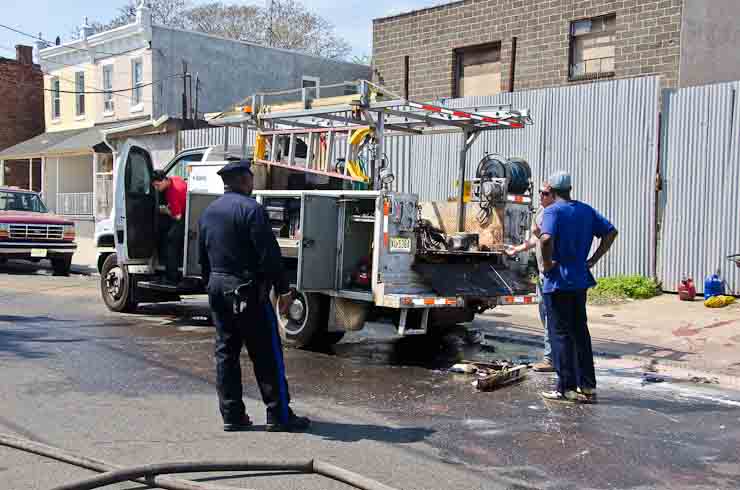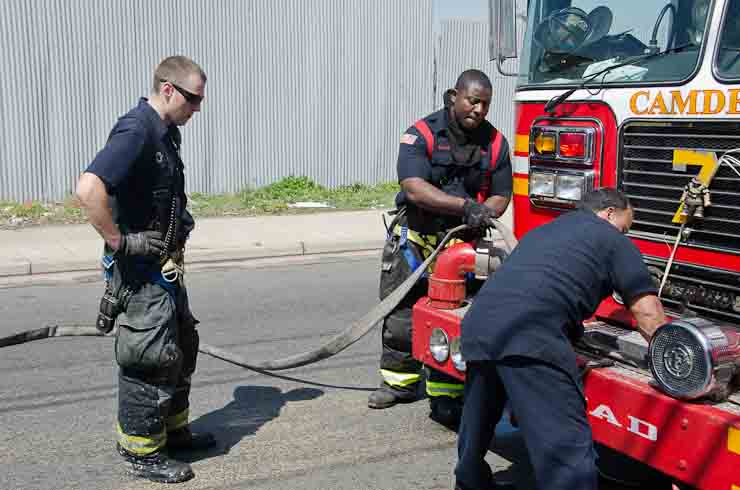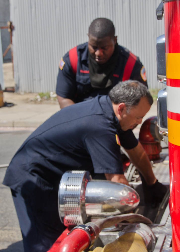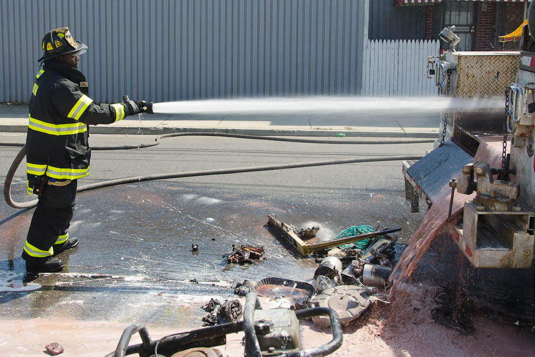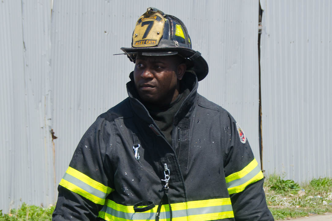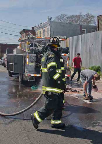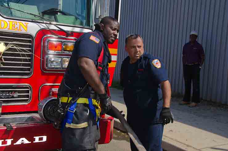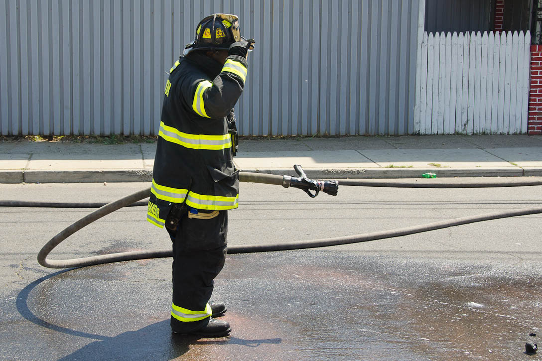 This page and the other pages in this series are the successors to the series of web-page about the Camden Fire Department that began with the page Camden Fire Department: The Fires of the Summer of 2011. On this and other pages in the series you will find pictures and information regarding different events and aspects of the fire service in Camden, New Jersey. I was in town with a friend, Merchantville volunteer fireman Rob Kanauss, running a few errands and stopping in to say hello here and there. After spending some time at the East Camden firehouse we had gone downtown and were at Fire Headquarters when a call came in concerning a car fire at South 7th and Chestnut Streets. We drove on down, making pretty good time taking the back streets, and got to the 600 block of Chestnut Street to find Squad Company 7 operating. A utility body truck had been traveling northbound on Route 676 when materials in the rear had ignited. The driver got off the highway at Atlantic Avenue, unaware of his problem until pedestrians in the vicinity of South 7th Street and Kaighn Avenue alerted him. Squad 7 made short work of the fire. We stopped by Liberty Station for a bit, before leaving the city when Ladder 2 went off to the Maintenance Shop. Before we left Camden Fire Department member Craig Spearman drove past, and I got a shot of him driving his car! It was home for me to take my dogs for their daily late afternoon walk… not knowing that I would be back in Camden within a few hours to photograph a dwelling fire at 2819 Benson Street. As with the web page covering other Camden Fire Department events, if you can identify anyone that I've missed, please comment at the bottom of the page. (I'm terrible at at names and faces). May 8, 2012 |