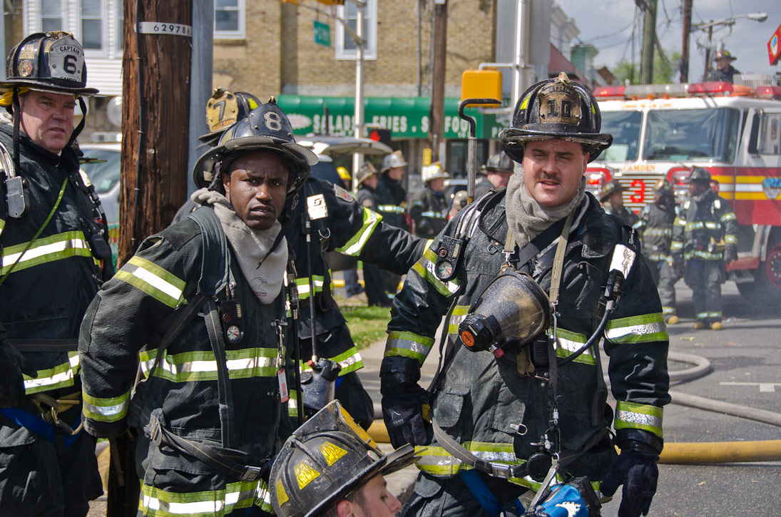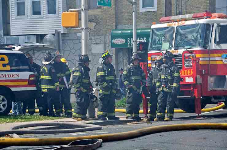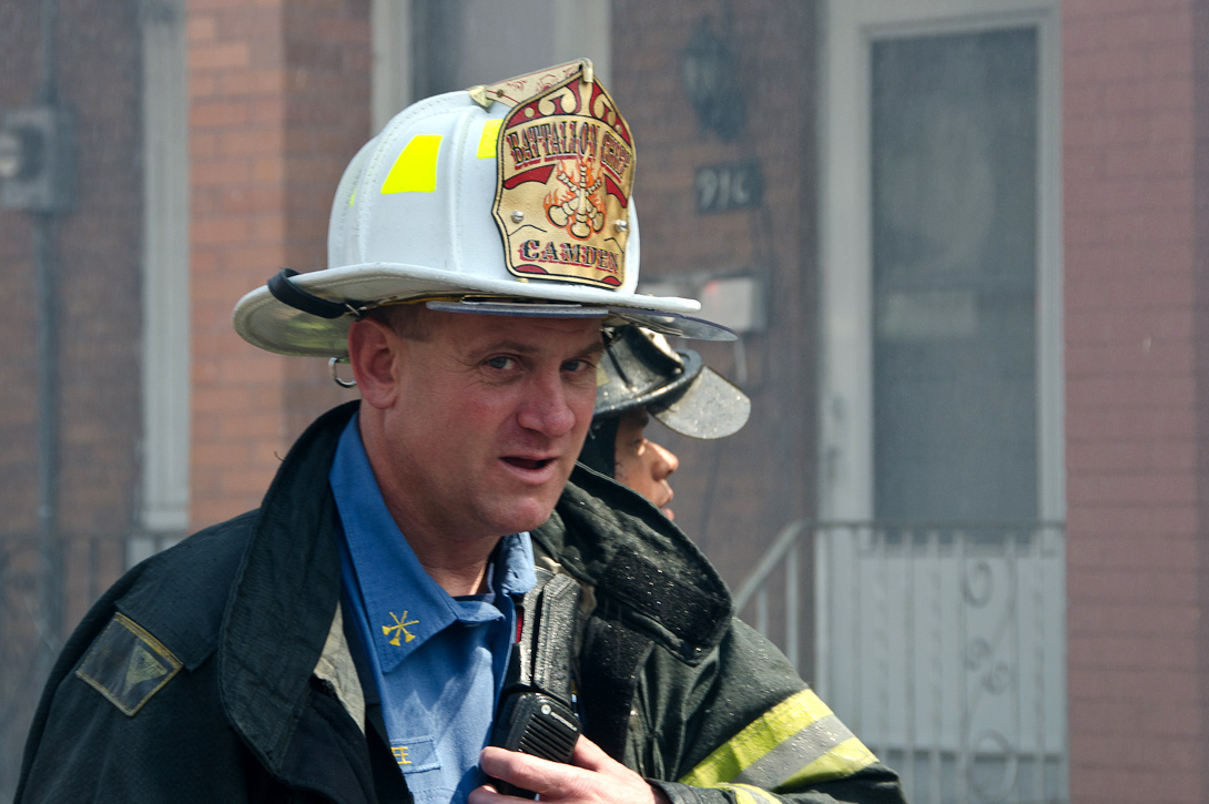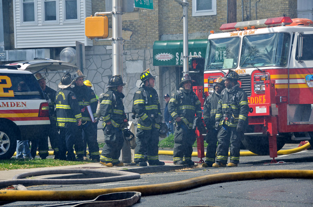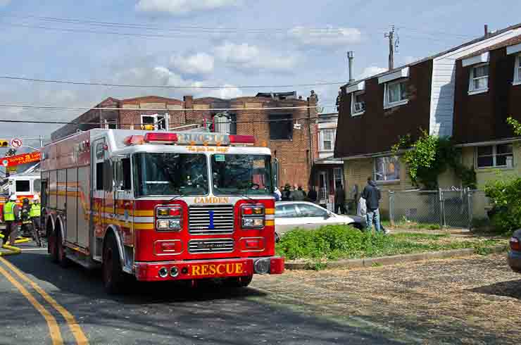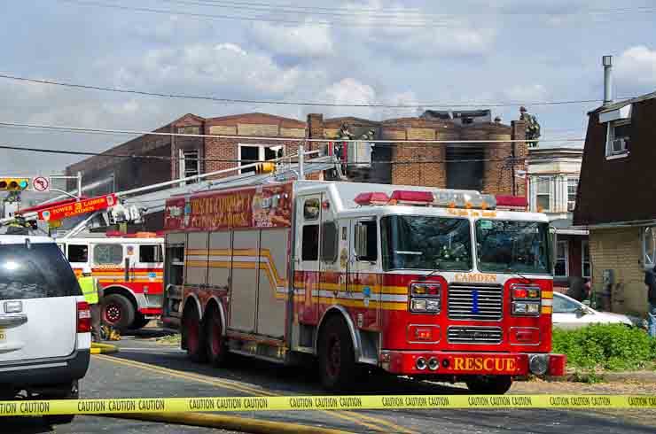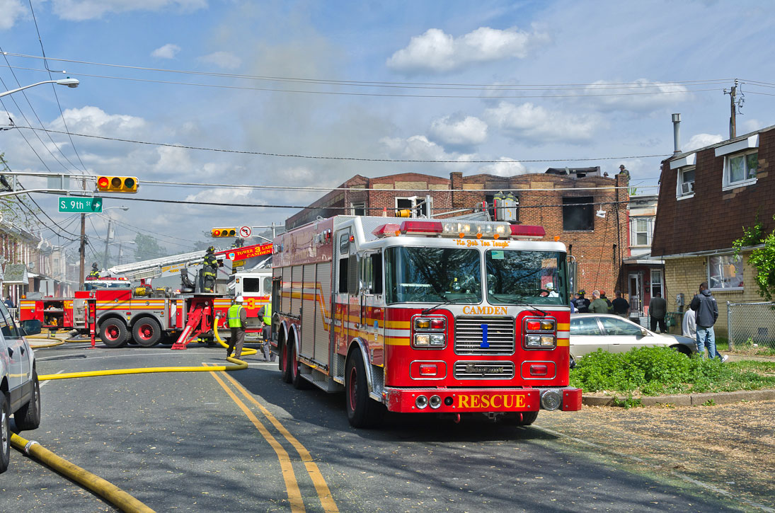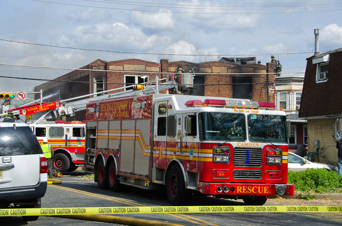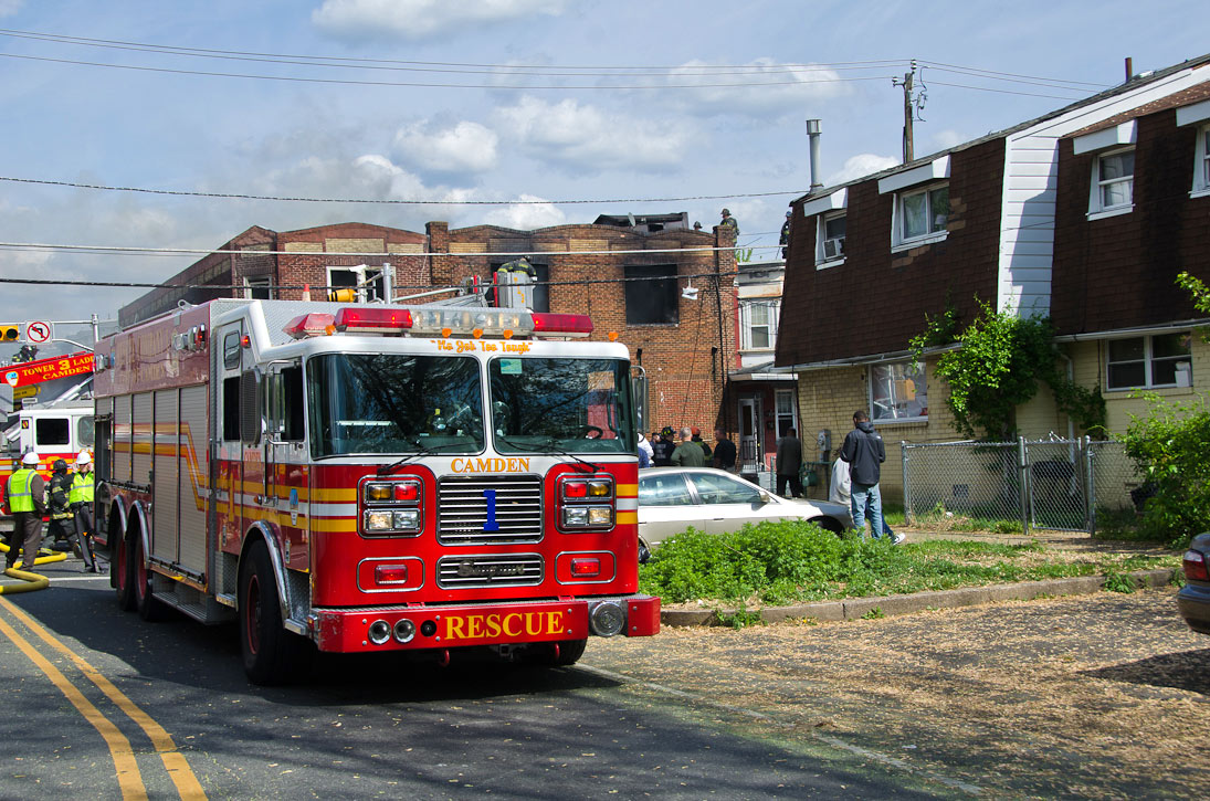 This page and the other pages in this series are the successors to the series of web-page about the Camden Fire Department that began with the page Camden Fire Department: The Fires of the Summer of 2011. On this and other pages in the series you will find pictures and information regarding different events and aspects of the fire service in Camden, New Jersey. This is the third of three pages covering the fire at BDF Industrial Fasteners, 1026-1030 South 10th Street, Camden NJ on April 24, 2012. There are links here and below to return to the first page or return to the second page. I had stopped by Liberty Station when around 2:20 PM a call came for Rescue Company 1 to go to a car accident on Admiral Wilson Boulevard. We were on Newton Avenue between South 7th and South 8th Streets when we were diverted to a report of a fire at South 9th Street and Atlantic Avenue. We turned right onto Mt Ephraim Avenue and smelled smoke almost as soon as we crossed Mechanic Street, a good two blocks away from the fire. This fire went to 2 alarms with companies from Gloucester City, Collingswood, Pennsauken, and Cherry Hill assisting. It took about an hour to bring under control, and there were no injuries. The photos and videos on this page are presented in the order in which they were taken. This page begins at 2:54 PM and ends when my battery ran out. Lesson learned… don't leave the spare battery at home! As stated above, this is the third of three pages, covering this fire. There are five video clips, each running about 24 seconds each. One is on this page. The videos have been uploaded to YOUTUBE. They are all MOV files and you can also download them by right-clicking on the links provided and saving them. All photos are also downloadable, click on each to get a larger and higher resolution version, then right-click and save. . . As with the web page covering other Camden Fire Department events, if you can identify anyone that I've missed, please comment at the bottom of the page. (I'm terrible at at names and faces). May 9, 2012 |