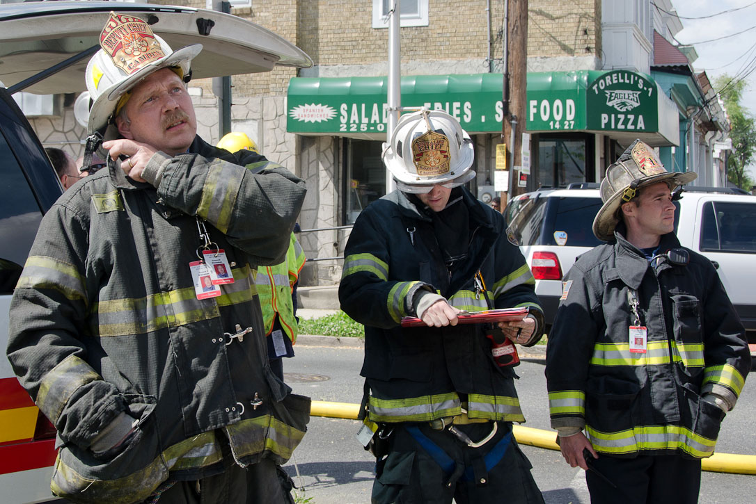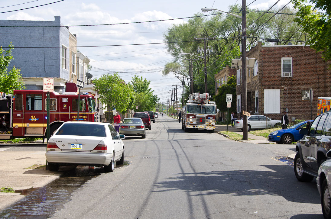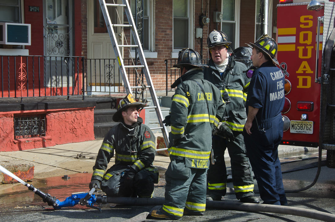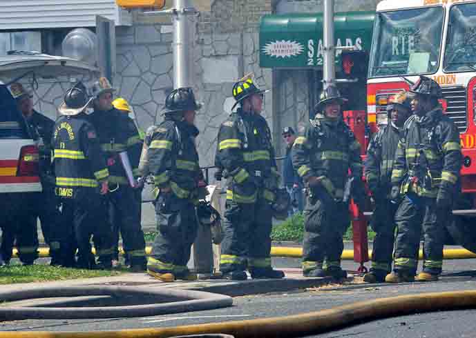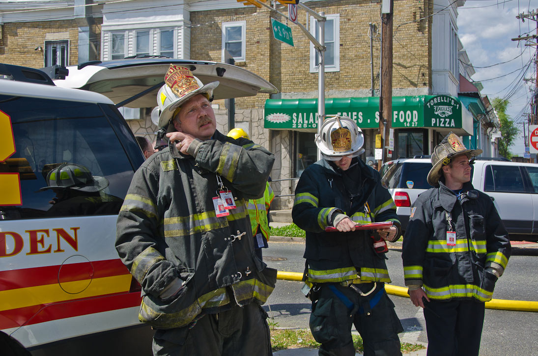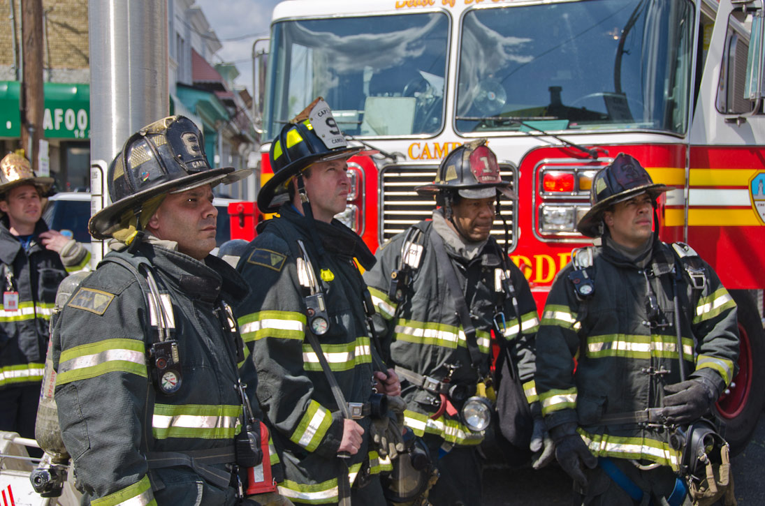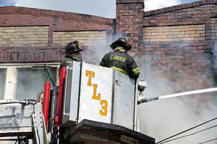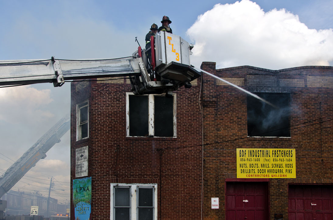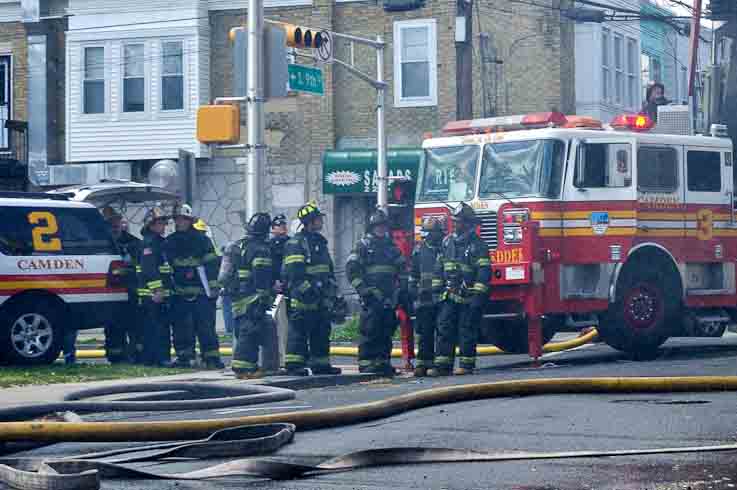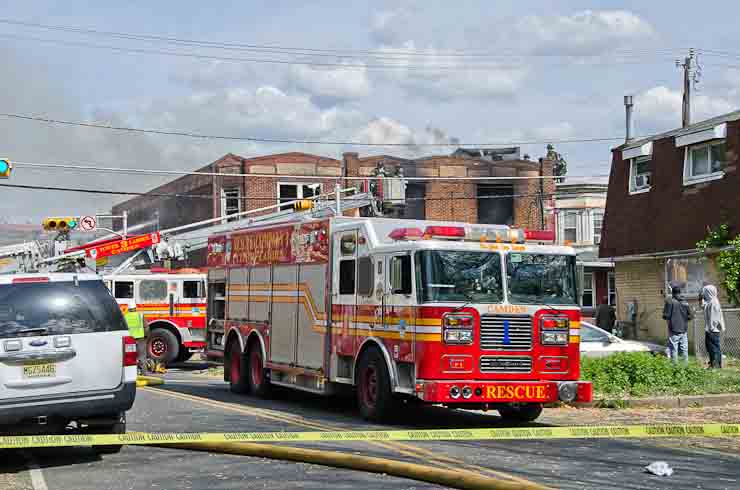 This page and the other pages in this series are the successors to the series of web-page about the Camden Fire Department that began with the page Camden Fire Department: The Fires of the Summer of 2011. On this and other pages in the series you will find pictures and information regarding different events and aspects of the fire service in Camden, New Jersey. This is the third of three pages covering the fire at BDF Industrial Fasteners, 1026-1030 South 10th Street, Camden NJ on April 24, 2012. There are links here and below to return to the first page or return to the second page. I had stopped by Liberty Station when around 2:20 PM a call came for Rescue Company 1 to go to a car accident on Admiral Wilson Boulevard. We were on Newton Avenue between South 7th and South 8th Streets when we were diverted to a report of a fire at South 9th Street and Atlantic Avenue. We turned right onto Mt Ephraim Avenue and smelled smoke almost as soon as we crossed Mechanic Street, a good two blocks away from the fire. This fire went to 2 alarms with companies from Gloucester City, Collingswood, Pennsauken, and Cherry Hill assisting. It took about an hour to bring under control, and there were no injuries. The photos and videos on this page are presented in the order in which they were taken. This page begins at 2:54 PM and ends when my battery ran out. Lesson learned… don't leave the spare battery at home! As stated above, this is the third of three pages, covering this fire. There are five video clips, each running about 24 seconds each. One is on this page. The videos have been uploaded to YOUTUBE. They are all MOV files and you can also download them by right-clicking on the links provided and saving them. All photos are also downloadable, click on each to get a larger and higher resolution version, then right-click and save. . . As with the web page covering other Camden Fire Department events, if you can identify anyone that I've missed, please comment at the bottom of the page. (I'm terrible at at names and faces). May 9, 2012 |