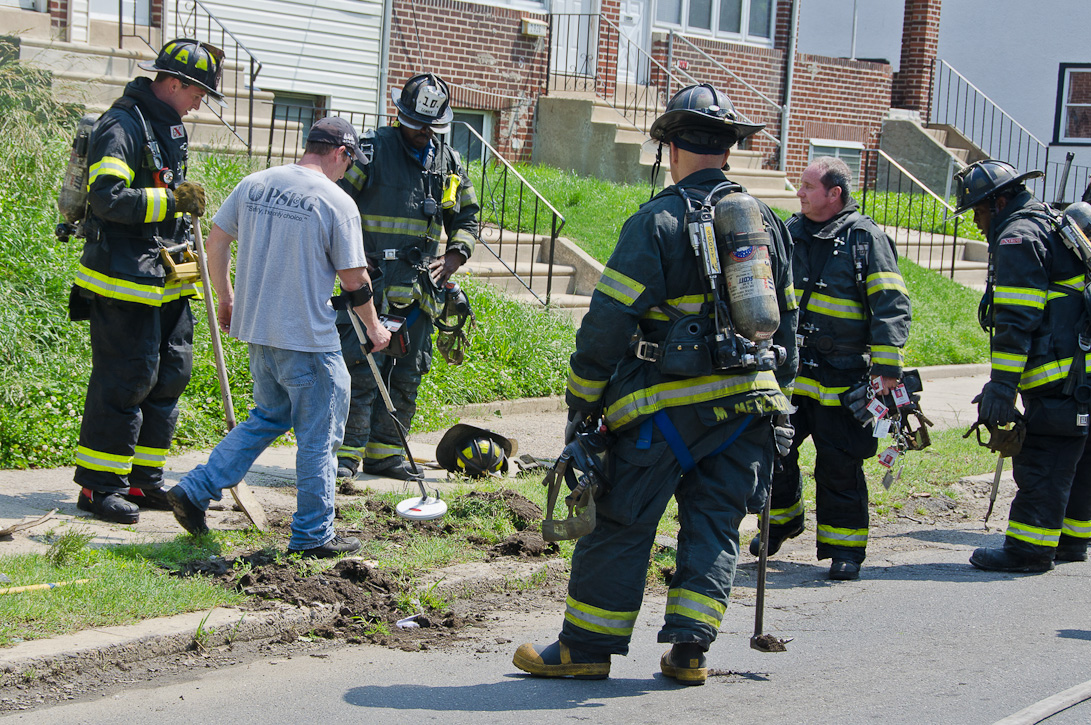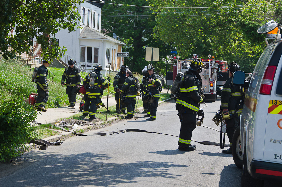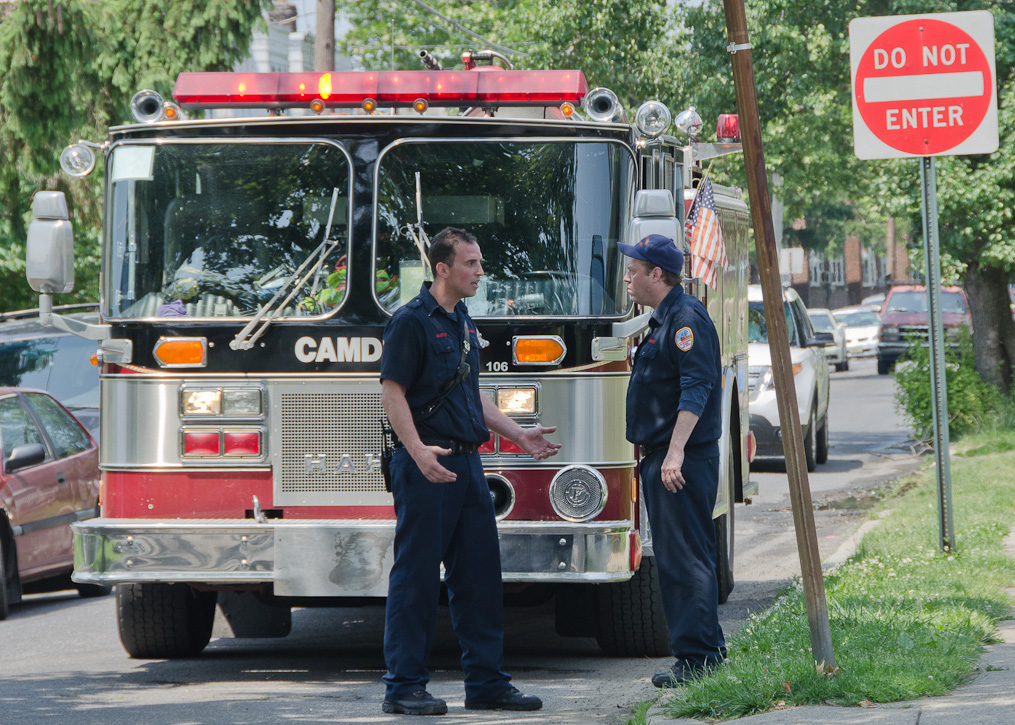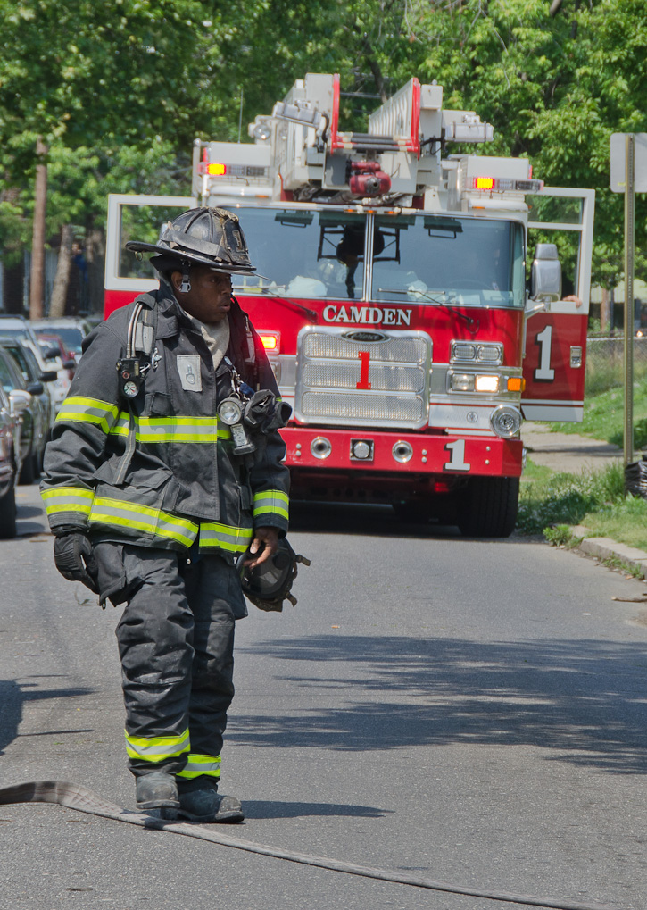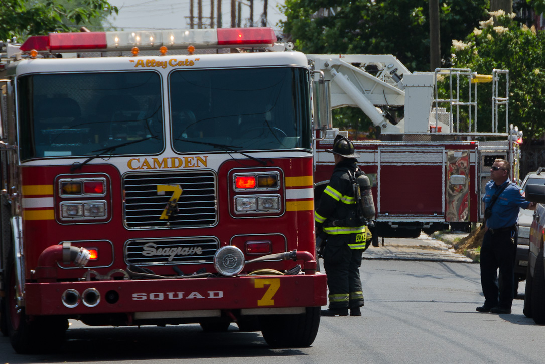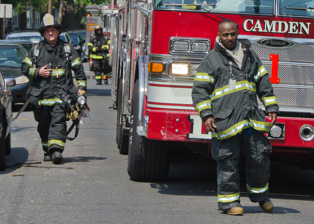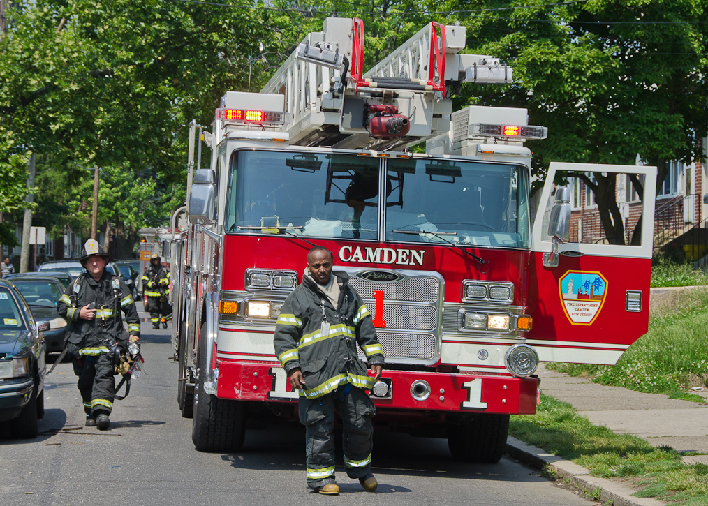 This page and the other pages in this series are the successors to the series of web-page about the Camden Fire Department that began with the page Camden Fire Department: The Fires of the Summer of 2011. On this and other pages in the series you will find pictures and information regarding different events and aspects of the fire service in Camden, New Jersey. A few hours after the fire at the Gramercy Park Apartments at 2800 Hull Road in Fairview was extinguished, a gas leak was reported around the corner on North Congress Road. The gas was emanating from an unoccupied two-story middle-of-the row dwelling at 2820 North Congress Road. As per practice, multiple companies were dispatched as a precaution until Public Service Gas & Electric Company personnel could get to the address and secure the utilities. This leak may have been caused by the theft of pipes in the home by vandals. I was in South Camden and was riding with Rescue Company 1 that morning. We actually were on our way over to inspect the damage at the apartments when this call came in. As with the web page covering other Camden Fire Department events, if you can identify anyone that I've missed, please comment at the bottom of the page. (I'm terrible at at names and faces). July 13, 2012 |