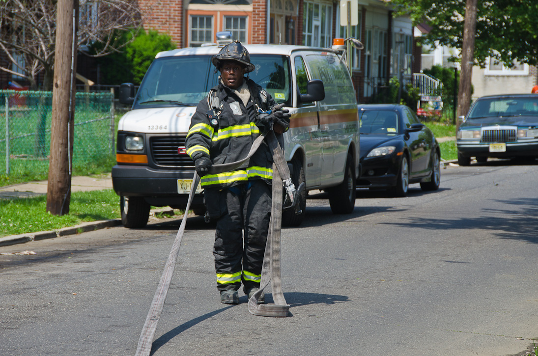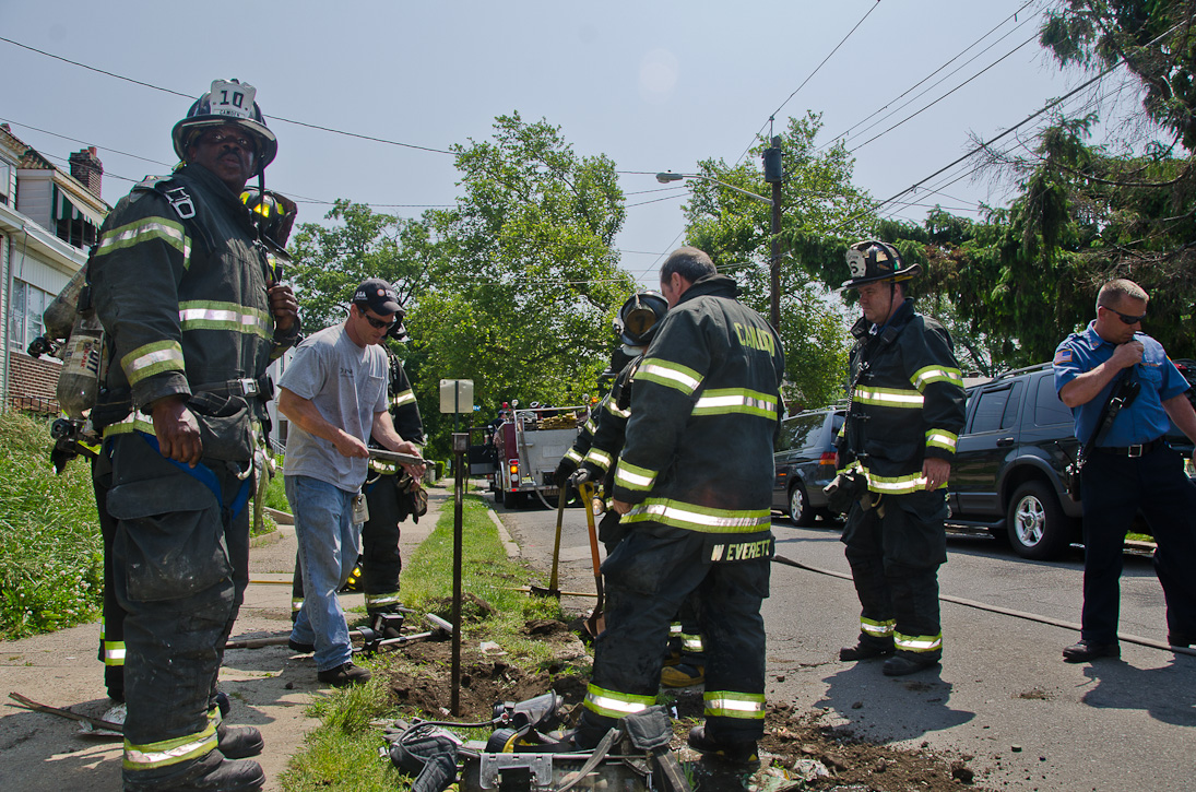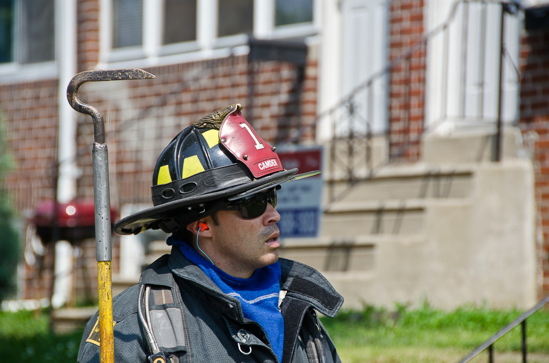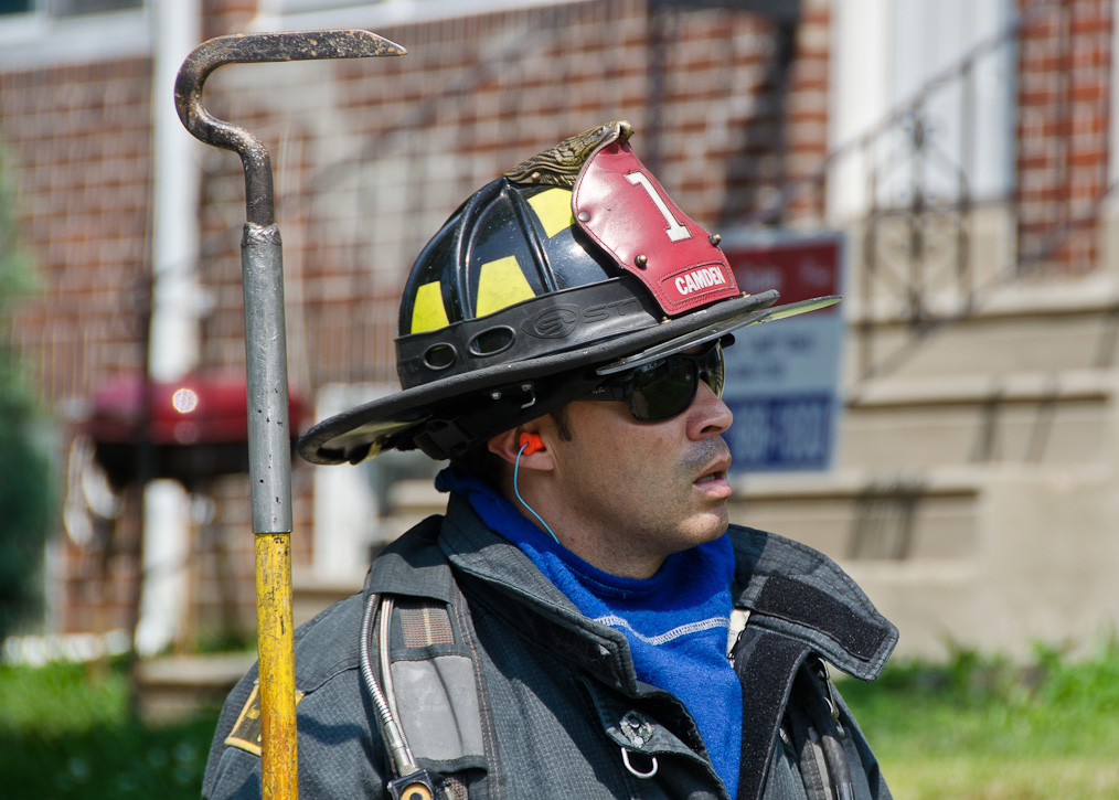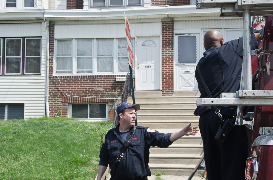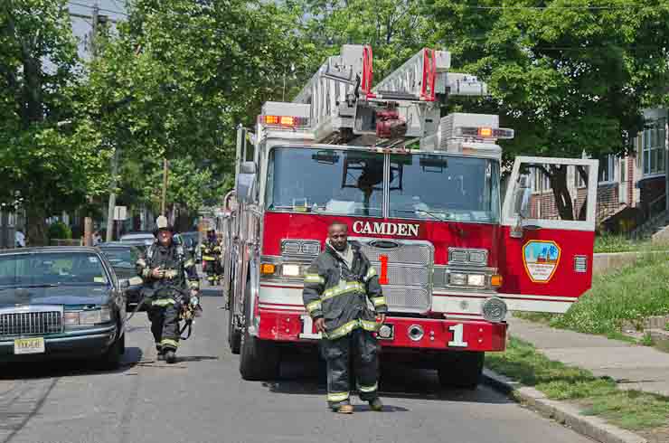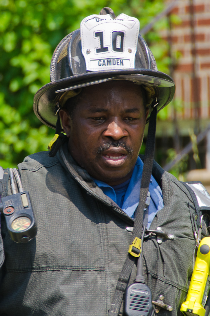 This page and the other pages in this series are the successors to the series of web-page about the Camden Fire Department that began with the page Camden Fire Department: The Fires of the Summer of 2011. On this and other pages in the series you will find pictures and information regarding different events and aspects of the fire service in Camden, New Jersey. A few hours after the fire at the Gramercy Park Apartments at 2800 Hull Road in Fairview was extinguished, a gas leak was reported around the corner on North Congress Road. The gas was emanating from an unoccupied two-story middle-of-the row dwelling at 2820 North Congress Road. As per practice, multiple companies were dispatched as a precaution until Public Service Gas & Electric Company personnel could get to the address and secure the utilities. This leak may have been caused by the theft of pipes in the home by vandals. I was in South Camden and was riding with Rescue Company 1 that morning. We actually were on our way over to inspect the damage at the apartments when this call came in. As with the web page covering other Camden Fire Department events, if you can identify anyone that I've missed, please comment at the bottom of the page. (I'm terrible at at names and faces). July 13, 2012 |