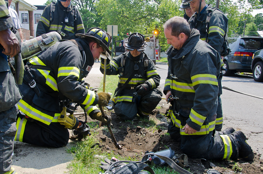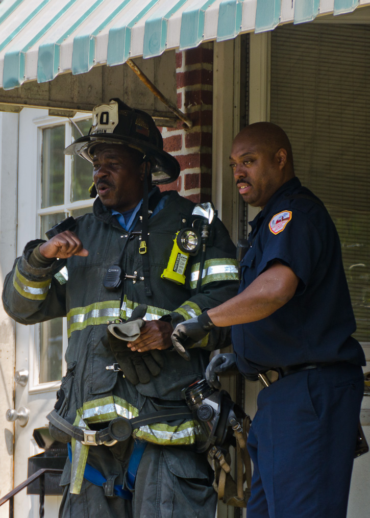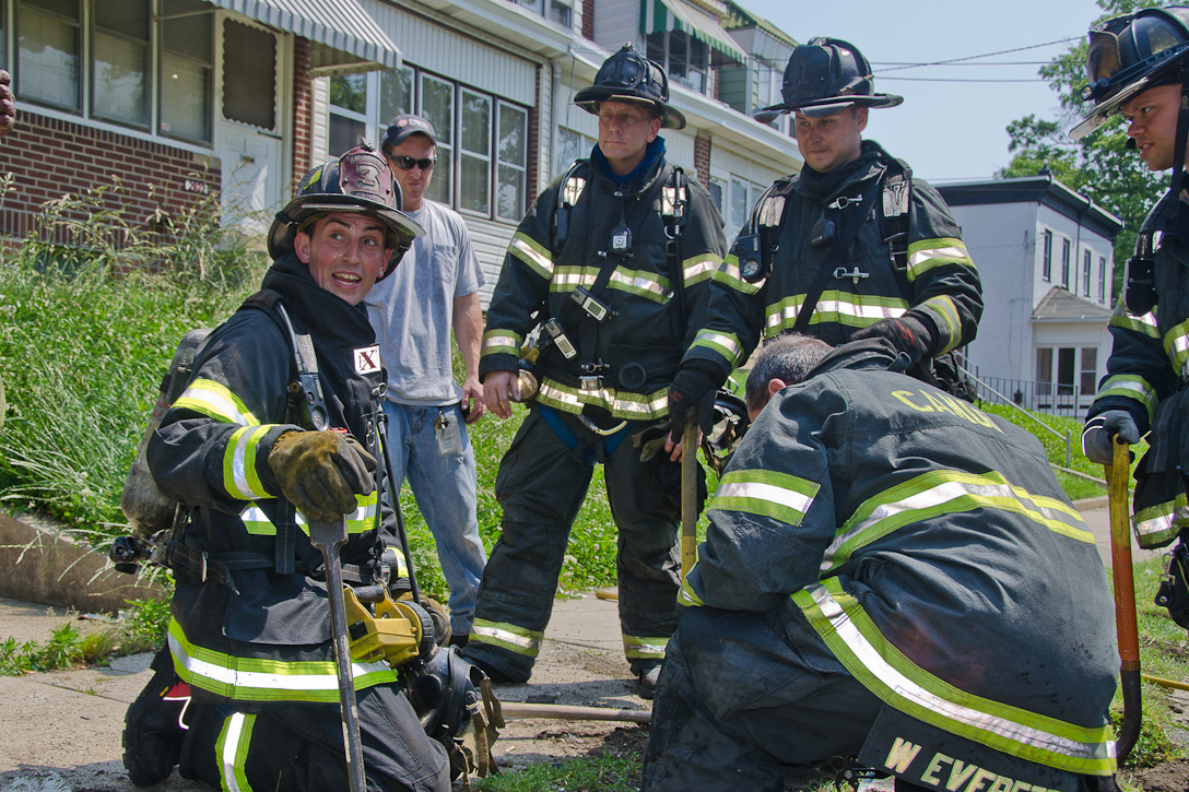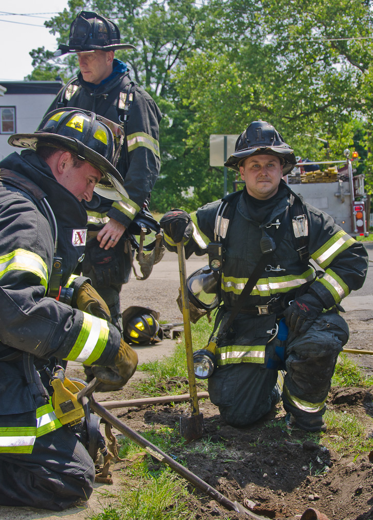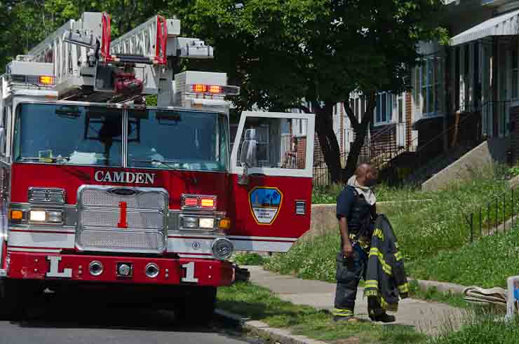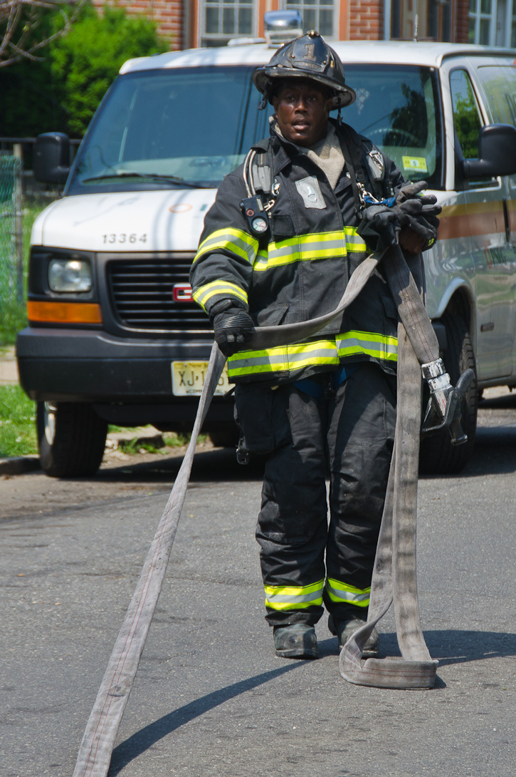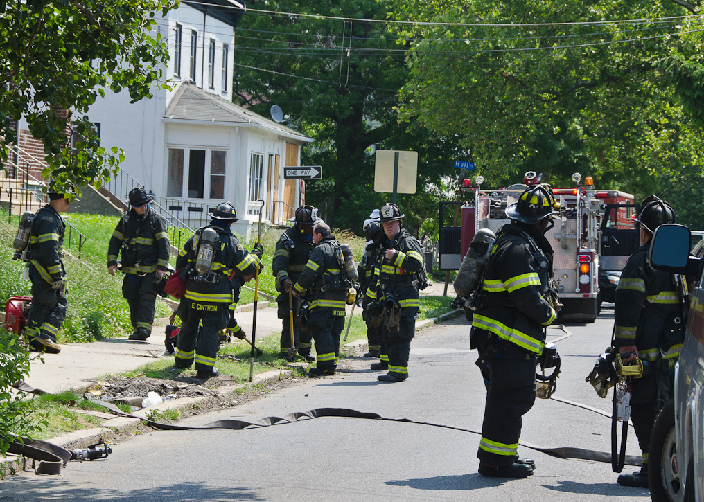 This page and the other pages in this series are the successors to the series of web-page about the Camden Fire Department that began with the page Camden Fire Department: The Fires of the Summer of 2011. On this and other pages in the series you will find pictures and information regarding different events and aspects of the fire service in Camden, New Jersey. A few hours after the fire at the Gramercy Park Apartments at 2800 Hull Road in Fairview was extinguished, a gas leak was reported around the corner on North Congress Road. The gas was emanating from an unoccupied two-story middle-of-the row dwelling at 2820 North Congress Road. As per practice, multiple companies were dispatched as a precaution until Public Service Gas & Electric Company personnel could get to the address and secure the utilities. This leak may have been caused by the theft of pipes in the home by vandals. I was in South Camden and was riding with Rescue Company 1 that morning. We actually were on our way over to inspect the damage at the apartments when this call came in. As with the web page covering other Camden Fire Department events, if you can identify anyone that I've missed, please comment at the bottom of the page. (I'm terrible at at names and faces). July 13, 2012 |