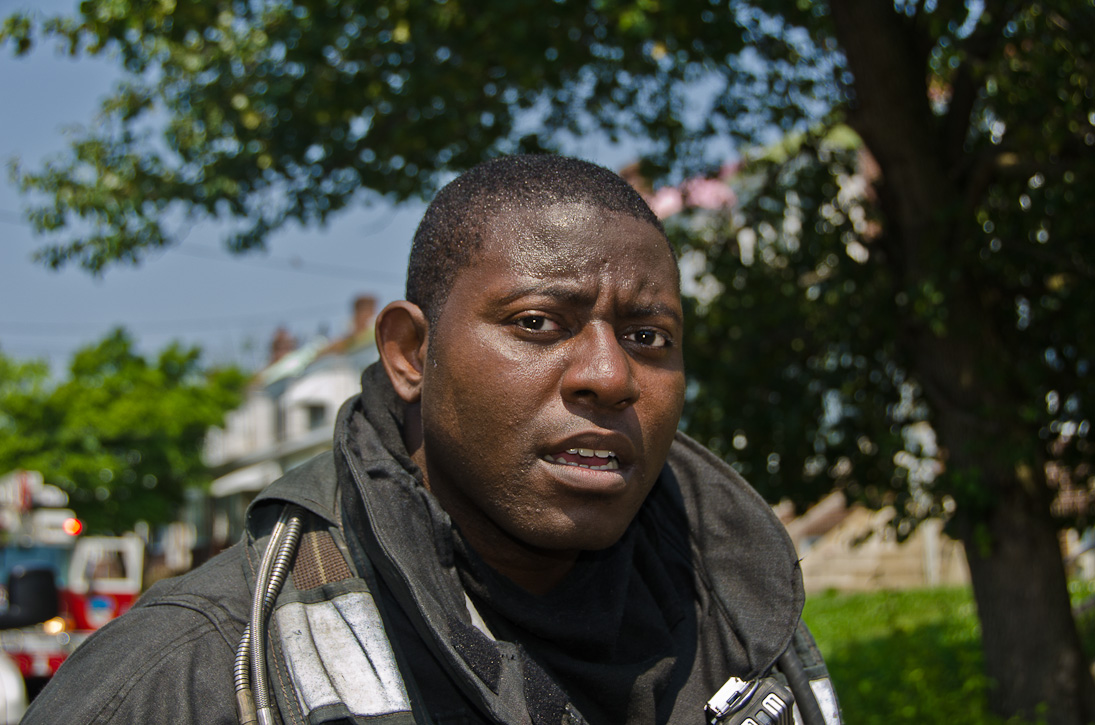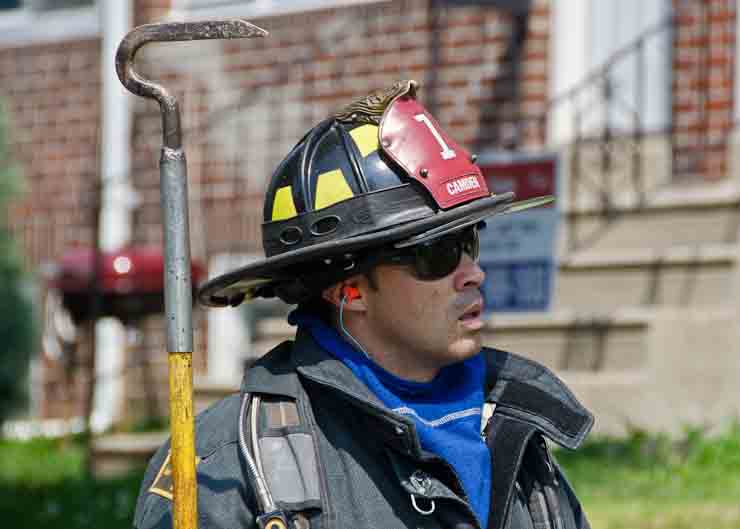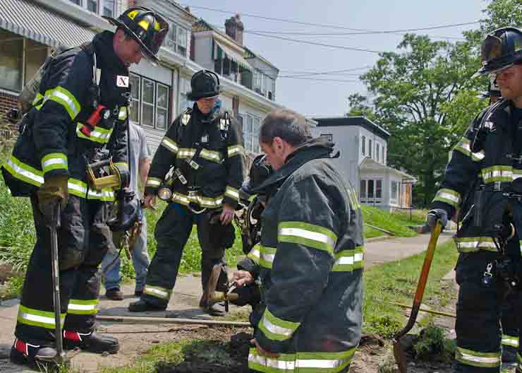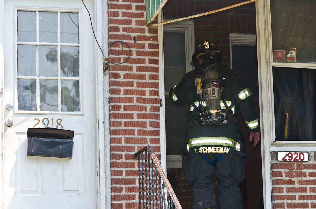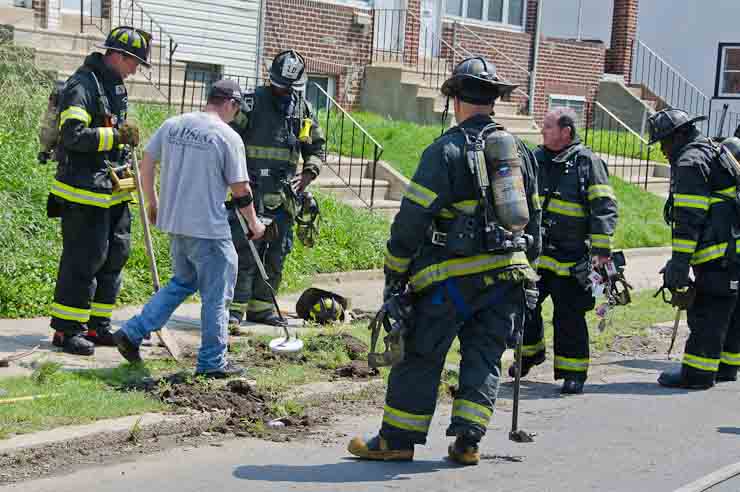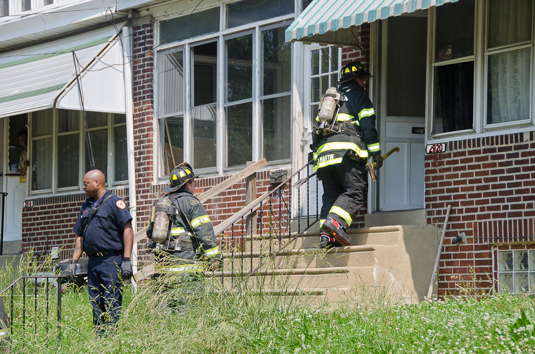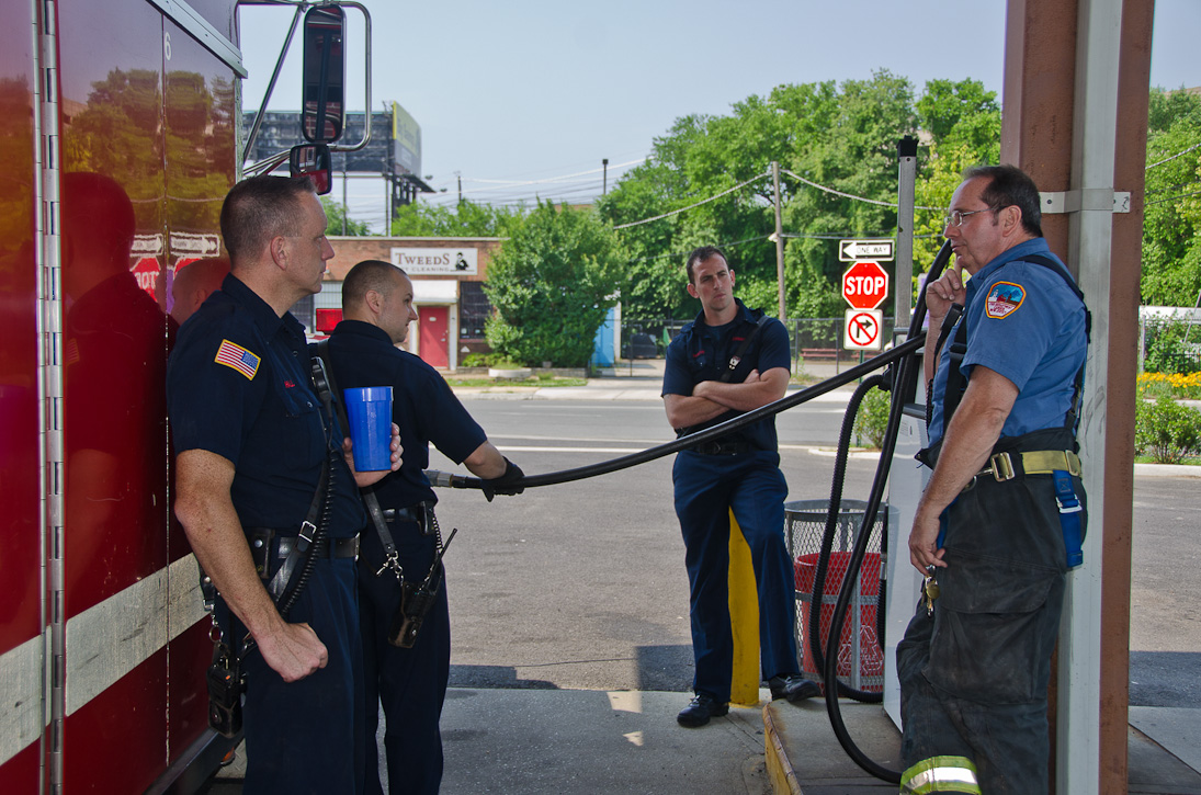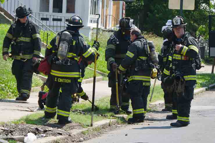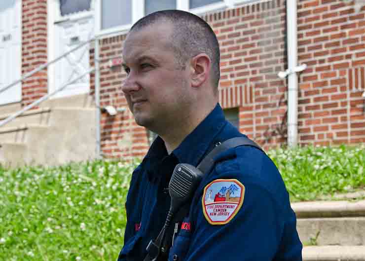 This page and the other pages in this series are the successors to the series of web-page about the Camden Fire Department that began with the page Camden Fire Department: The Fires of the Summer of 2011. On this and other pages in the series you will find pictures and information regarding different events and aspects of the fire service in Camden, New Jersey. A few hours after the fire at the Gramercy Park Apartments at 2800 Hull Road in Fairview was extinguished, a gas leak was reported around the corner on North Congress Road. The gas was emanating from an unoccupied two-story middle-of-the row dwelling at 2820 North Congress Road. As per practice, multiple companies were dispatched as a precaution until Public Service Gas & Electric Company personnel could get to the address and secure the utilities. This leak may have been caused by the theft of pipes in the home by vandals. I was in South Camden and was riding with Rescue Company 1 that morning. We actually were on our way over to inspect the damage at the apartments when this call came in. As with the web page covering other Camden Fire Department events, if you can identify anyone that I've missed, please comment at the bottom of the page. (I'm terrible at at names and faces). July 13, 2012 |