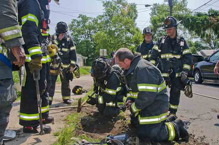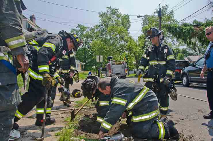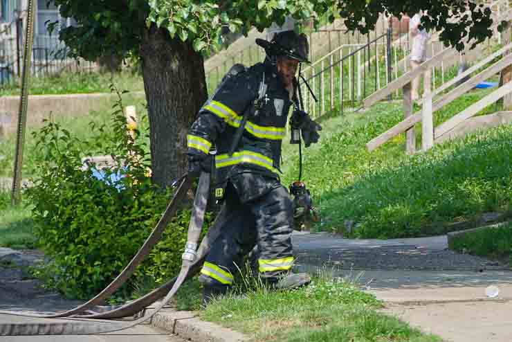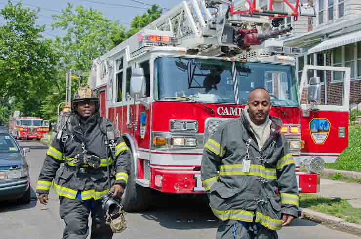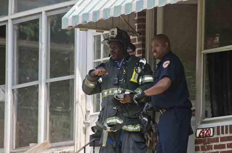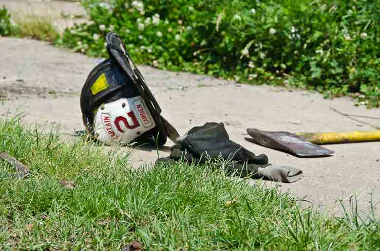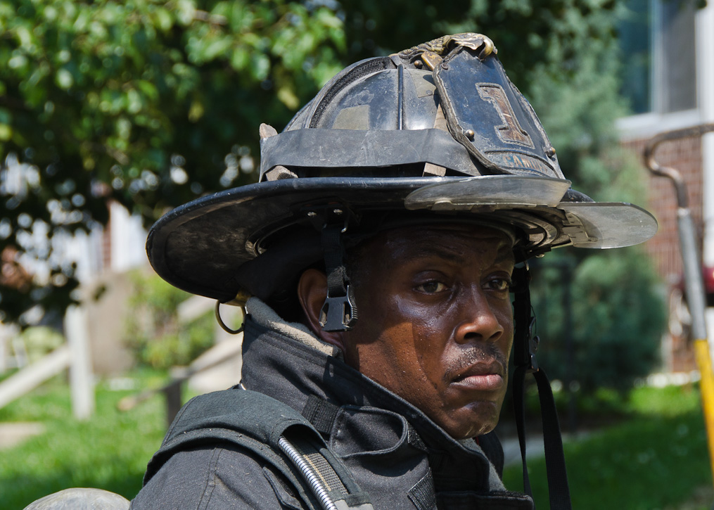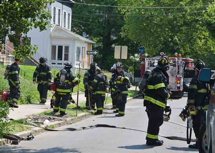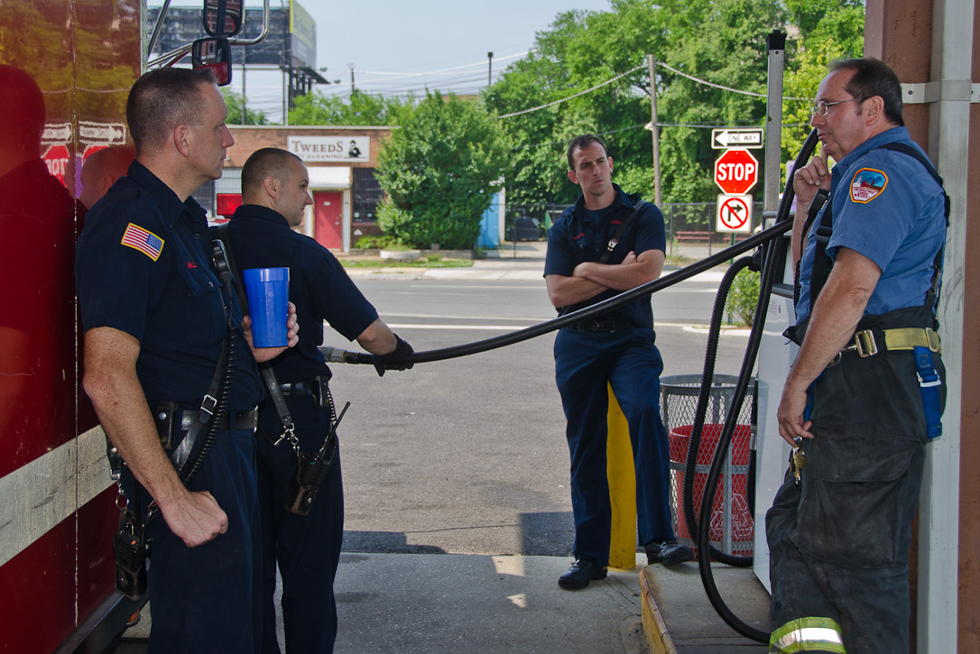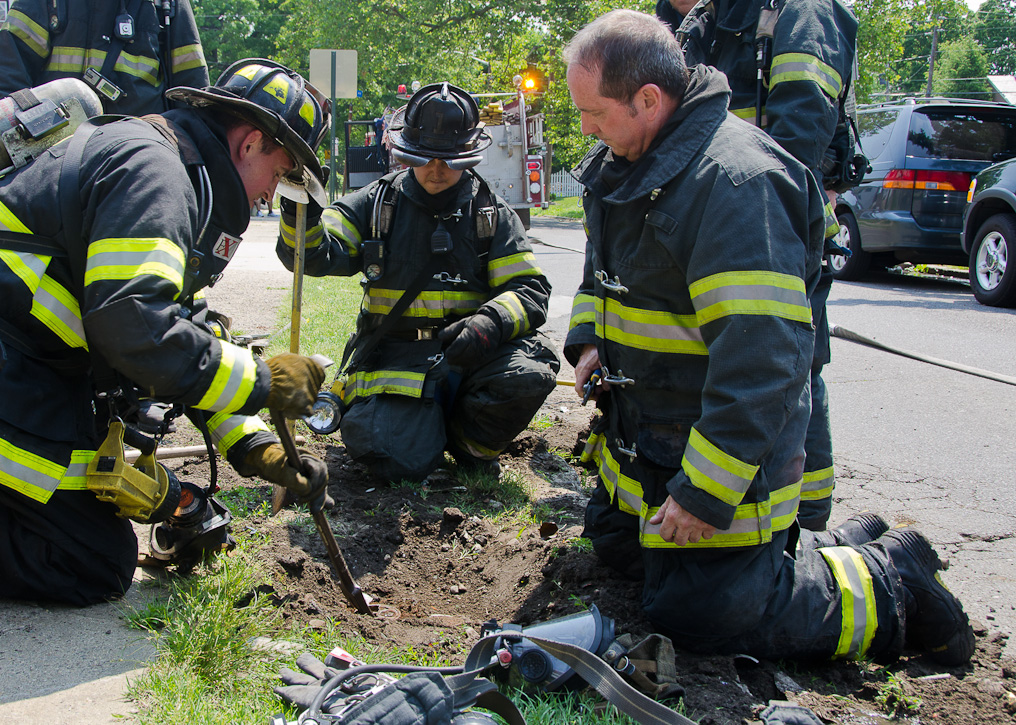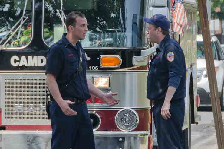 This page and the other pages in this series are the successors to the series of web-page about the Camden Fire Department that began with the page Camden Fire Department: The Fires of the Summer of 2011. On this and other pages in the series you will find pictures and information regarding different events and aspects of the fire service in Camden, New Jersey. A few hours after the fire at the Gramercy Park Apartments at 2800 Hull Road in Fairview was extinguished, a gas leak was reported around the corner on North Congress Road. The gas was emanating from an unoccupied two-story middle-of-the row dwelling at 2820 North Congress Road. As per practice, multiple companies were dispatched as a precaution until Public Service Gas & Electric Company personnel could get to the address and secure the utilities. This leak may have been caused by the theft of pipes in the home by vandals. I was in South Camden and was riding with Rescue Company 1 that morning. We actually were on our way over to inspect the damage at the apartments when this call came in. As with the web page covering other Camden Fire Department events, if you can identify anyone that I've missed, please comment at the bottom of the page. (I'm terrible at at names and faces). July 13, 2012 |
