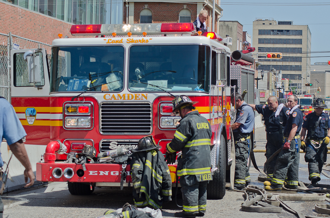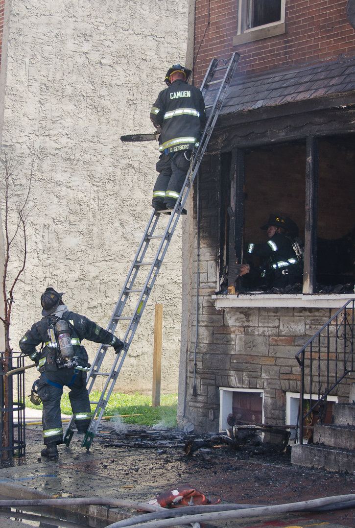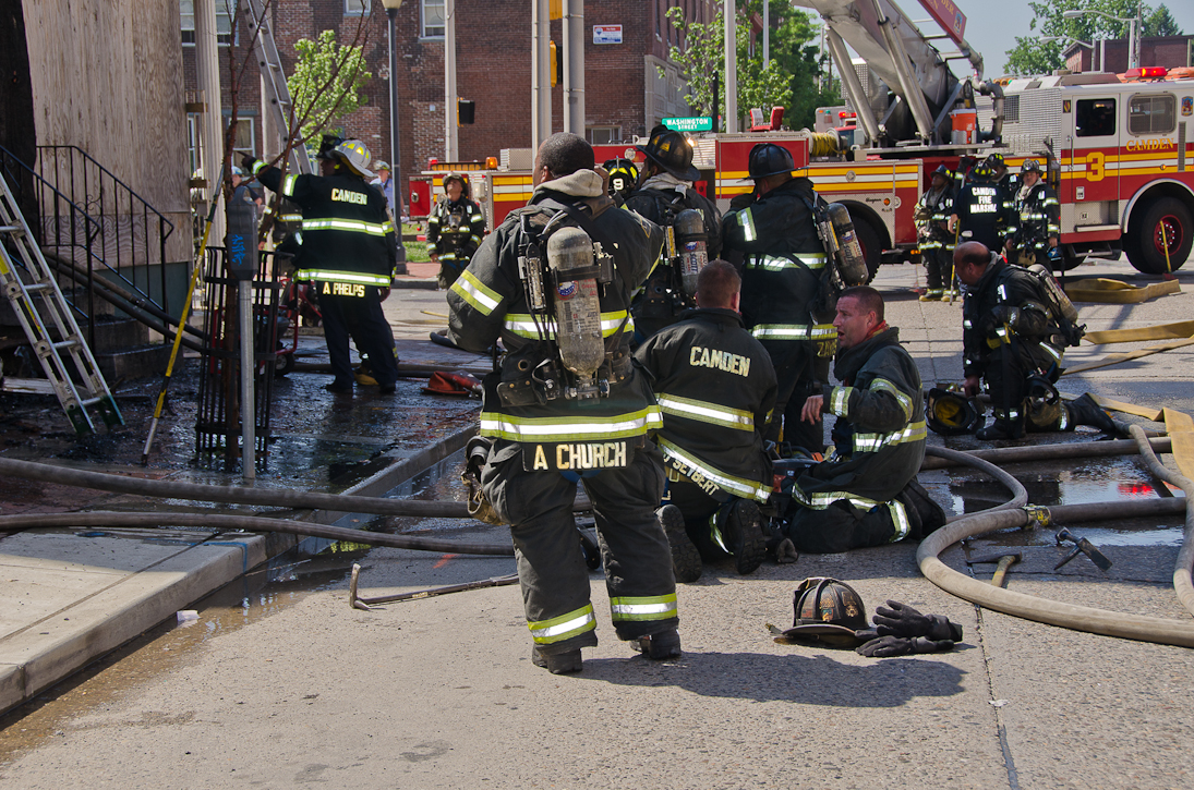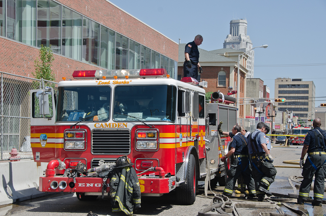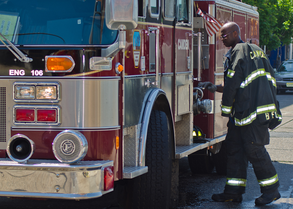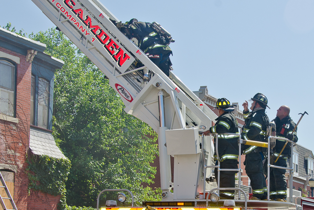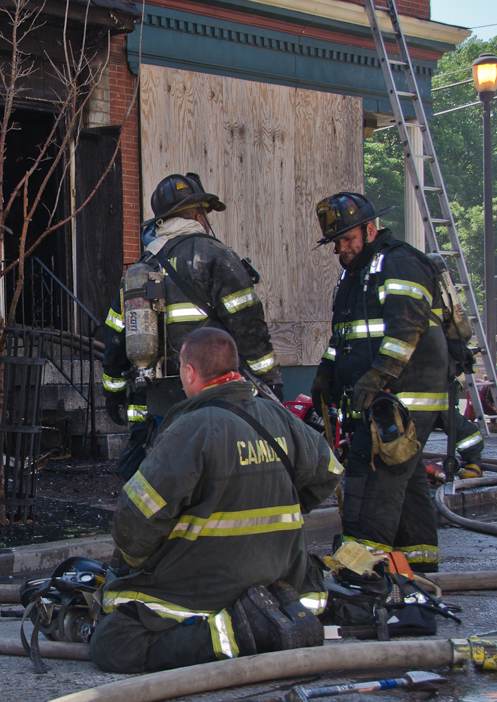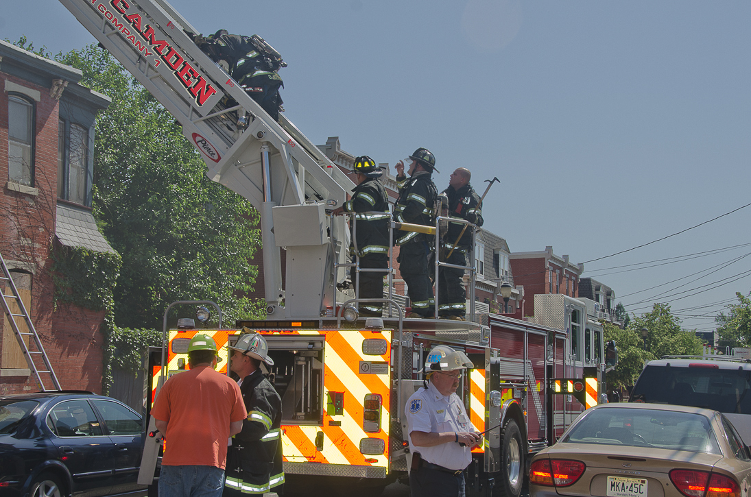 This page and the other pages in this series are the successors to the series of web-page about the Camden Fire Department that began with the page Camden Fire Department: The Fires of the Summer of 2011. On this and other pages in the series you will find pictures and information regarding different events and aspects of the fire service in Camden, New Jersey. On March 23, 2012 the Camden Fire Department put out a fire in a vacant (except for squatters) building at 426 Broadway. On May 31, the Department return to take care of a fire next door, at 424 Broadway, also vacant and also infested by squatters. The Battalion Chief on arrival reported heavy fire showing from the second floor of a three-story dwelling, with a person trapped. Multiple hand lines and two ladders were put into service. A woman was rescued from the second floor and taken to Cooper Trauma Center, firefighters Denis O'Reilly and Victor Torres being the heroes of the day. Besides the photos presented on this page, which I shot, there are many more pictures, taken by Ted Aurig, that can be seen at NewJerseyFireground.com. As with the web page covering other Camden Fire Department events, if you can identify anyone that I've missed, please comment at the bottom of the page. (I'm terrible at at names and faces). June 25, 2012 |