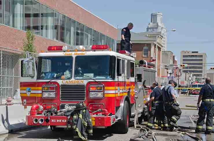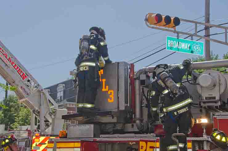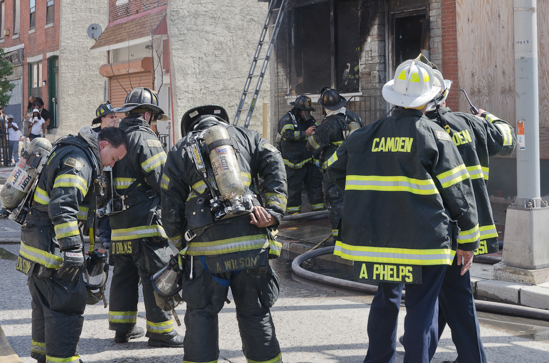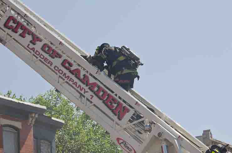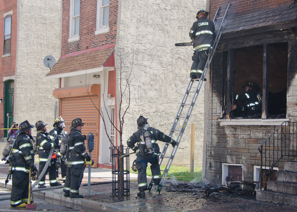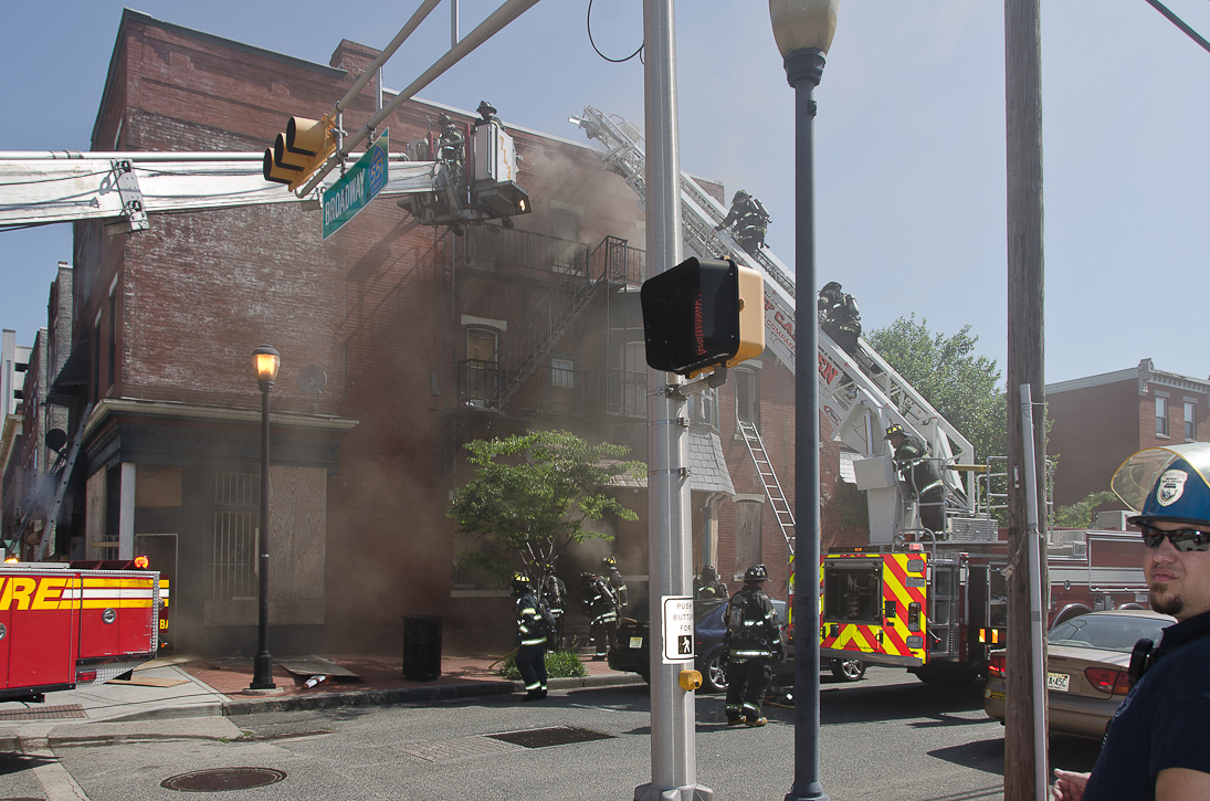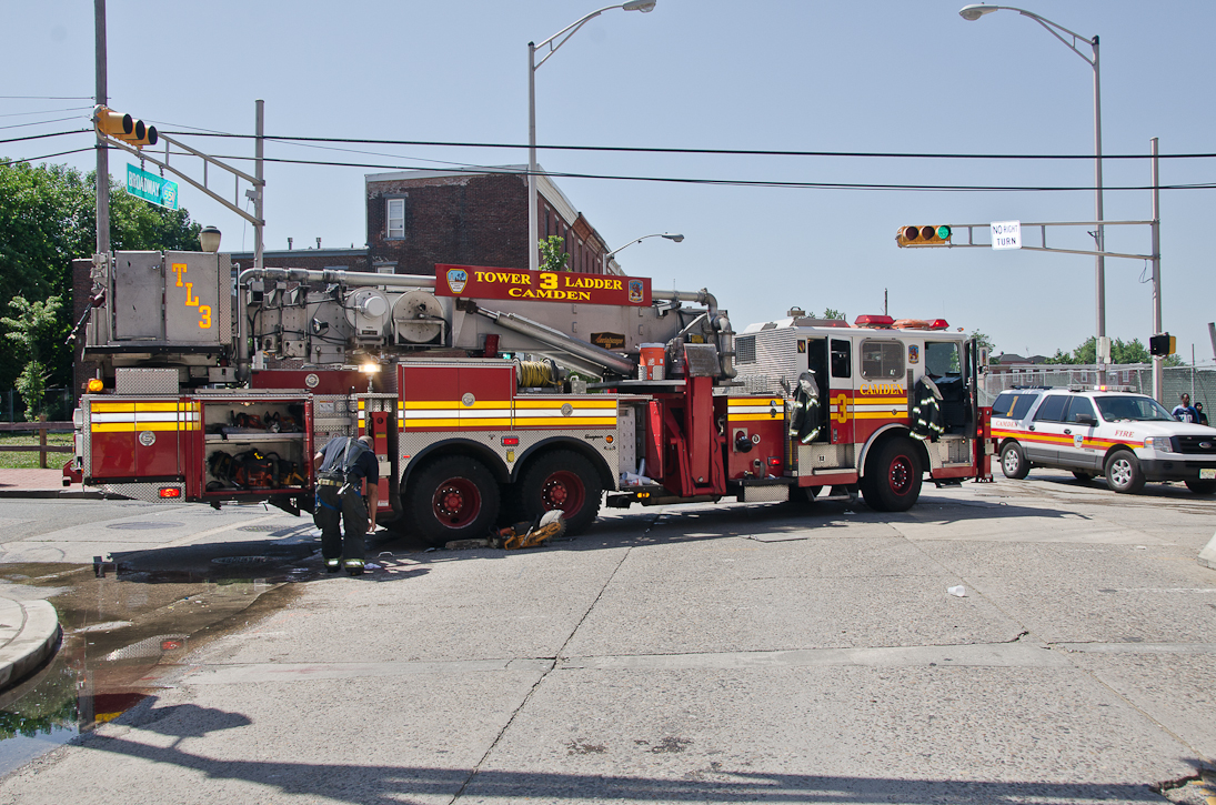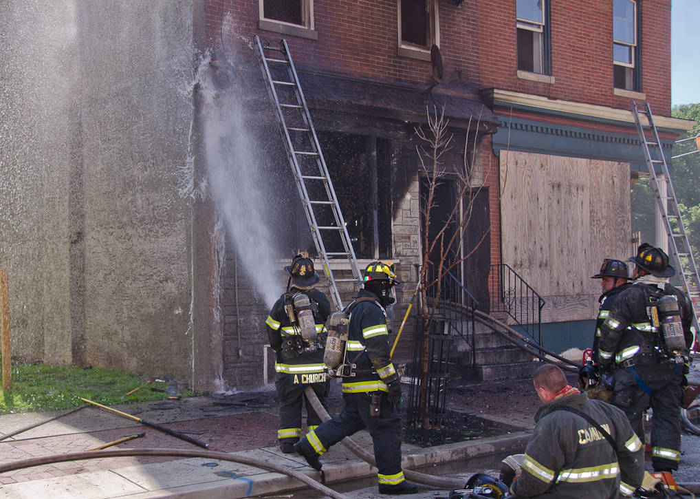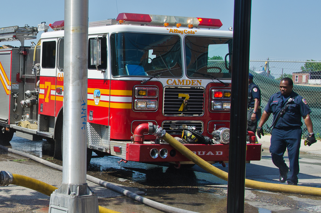 This page and the other pages in this series are the successors to the series of web-page about the Camden Fire Department that began with the page Camden Fire Department: The Fires of the Summer of 2011. On this and other pages in the series you will find pictures and information regarding different events and aspects of the fire service in Camden, New Jersey. On March 23, 2012 the Camden Fire Department put out a fire in a vacant (except for squatters) building at 426 Broadway. On May 31, the Department return to take care of a fire next door, at 424 Broadway, also vacant and also infested by squatters. The Battalion Chief on arrival reported heavy fire showing from the second floor of a three-story dwelling, with a person trapped. Multiple hand lines and two ladders were put into service. A woman was rescued from the second floor and taken to Cooper Trauma Center, firefighters Denis O'Reilly and Victor Torres being the heroes of the day. Besides the photos presented on this page, which I shot, there are many more pictures, taken by Ted Aurig, that can be seen at NewJerseyFireground.com. As with the web page covering other Camden Fire Department events, if you can identify anyone that I've missed, please comment at the bottom of the page. (I'm terrible at at names and faces). June 25, 2012 |