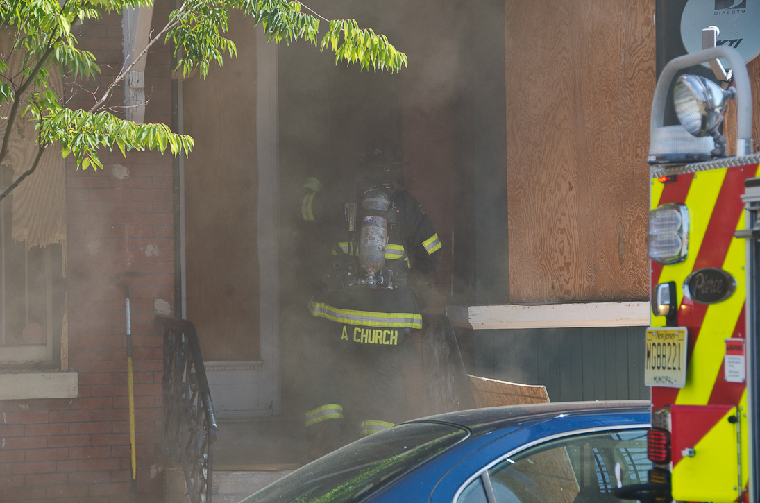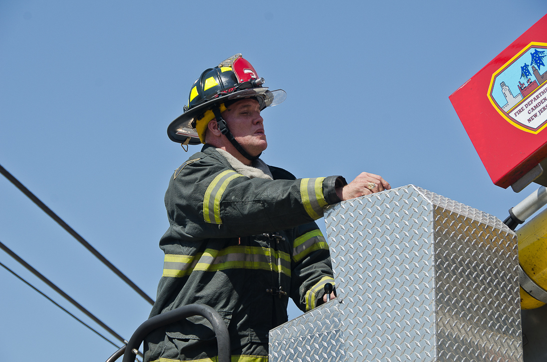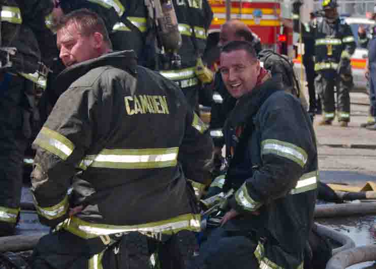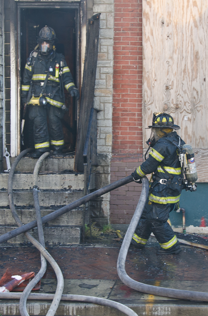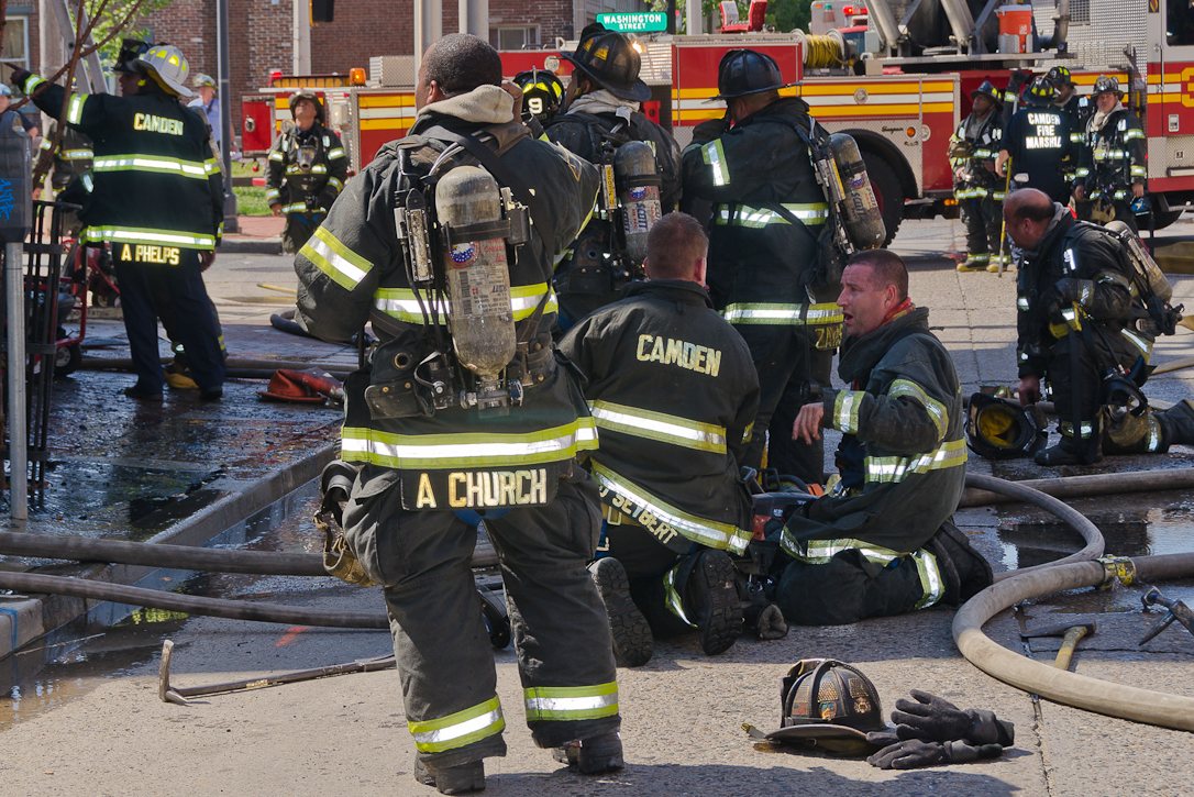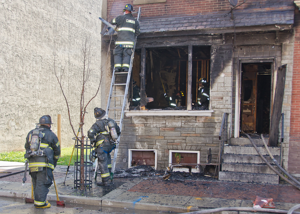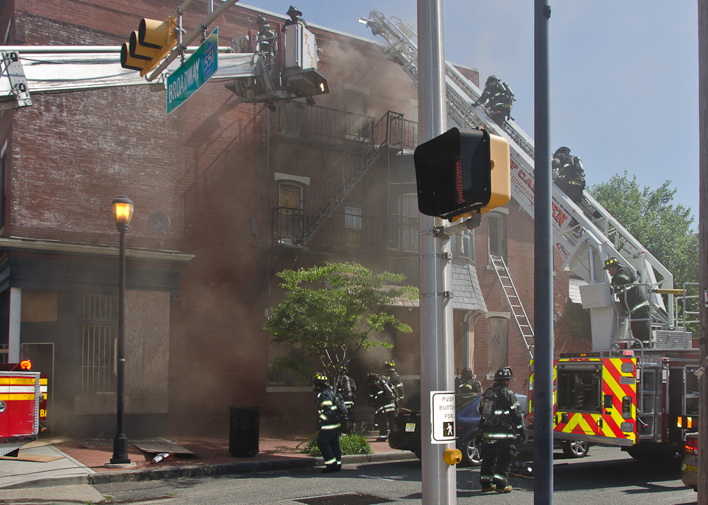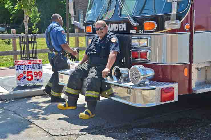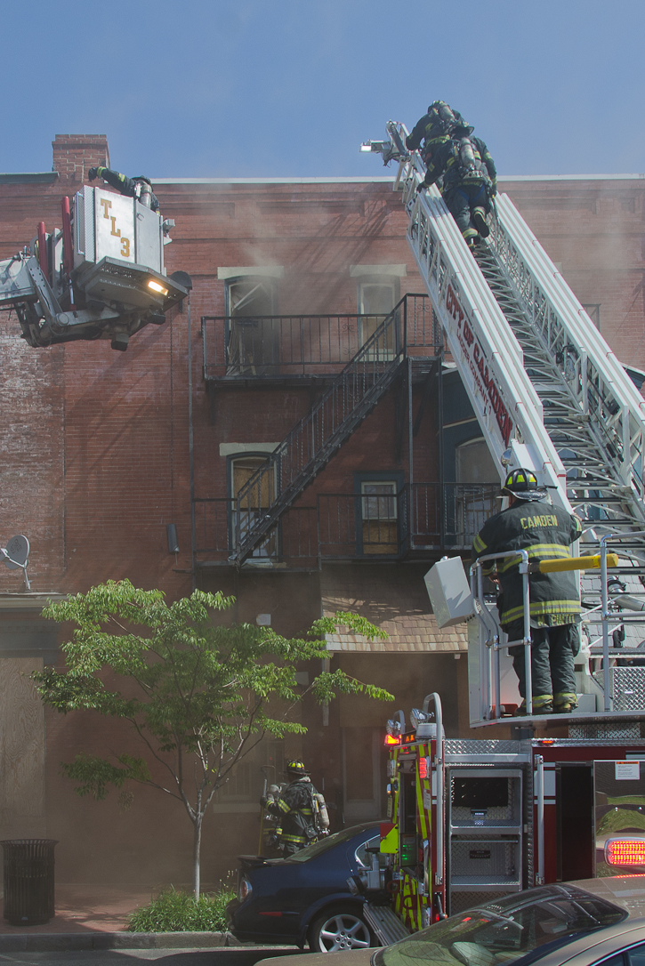 This page and the other pages in this series are the successors to the series of web-page about the Camden Fire Department that began with the page Camden Fire Department: The Fires of the Summer of 2011. On this and other pages in the series you will find pictures and information regarding different events and aspects of the fire service in Camden, New Jersey. On March 23, 2012 the Camden Fire Department put out a fire in a vacant (except for squatters) building at 426 Broadway. On May 31, the Department return to take care of a fire next door, at 424 Broadway, also vacant and also infested by squatters. The Battalion Chief on arrival reported heavy fire showing from the second floor of a three-story dwelling, with a person trapped. Multiple hand lines and two ladders were put into service. A woman was rescued from the second floor and taken to Cooper Trauma Center, firefighters Denis O'Reilly and Victor Torres being the heroes of the day. Besides the photos presented on this page, which I shot, there are many more pictures, taken by Ted Aurig, that can be seen at NewJerseyFireground.com. As with the web page covering other Camden Fire Department events, if you can identify anyone that I've missed, please comment at the bottom of the page. (I'm terrible at at names and faces). June 25, 2012 |