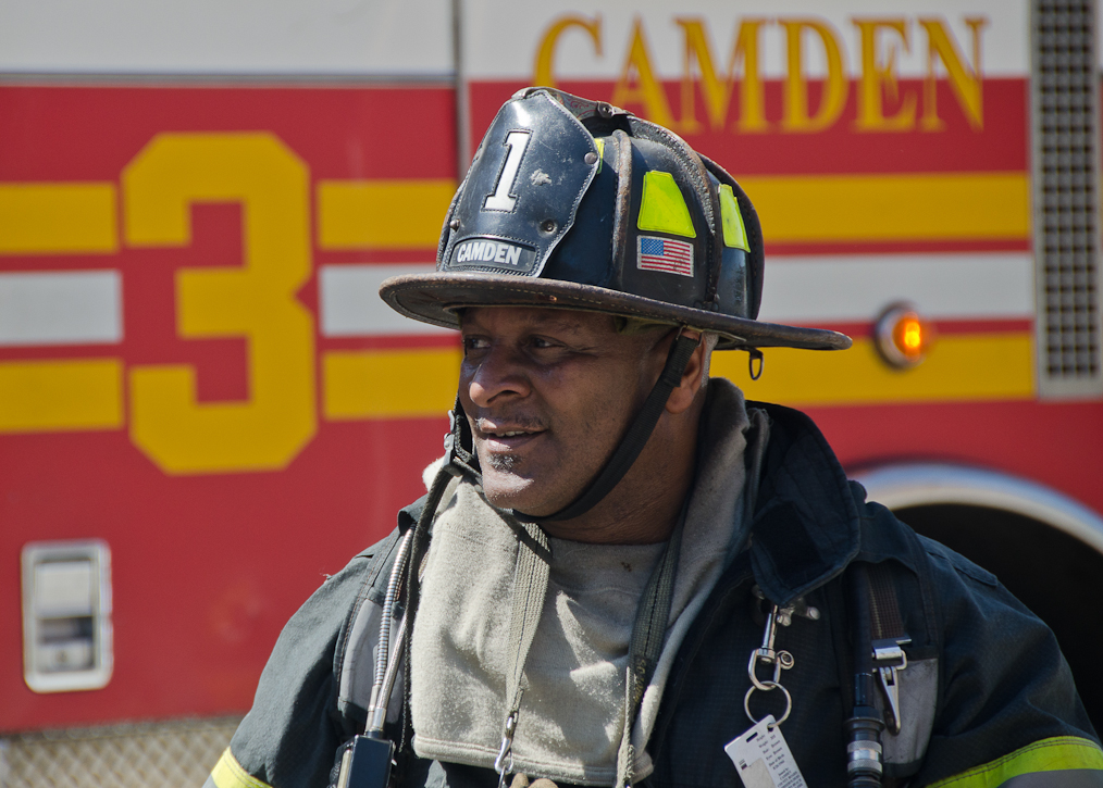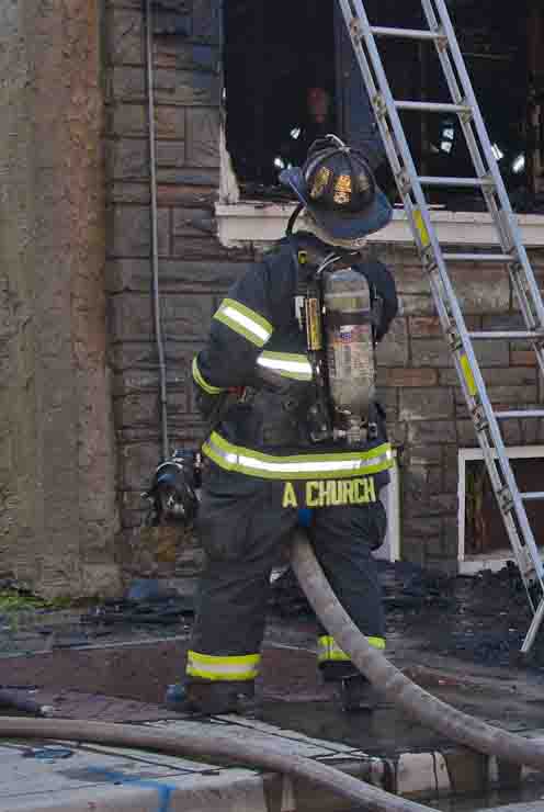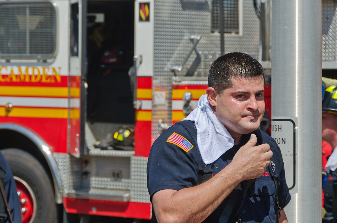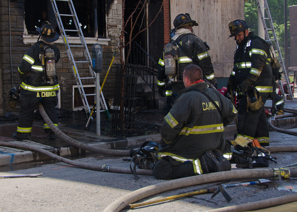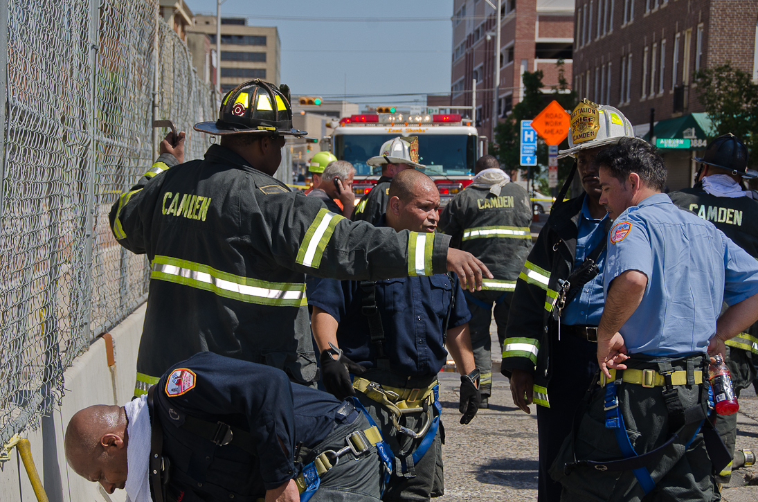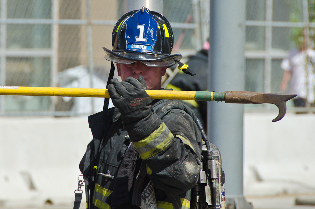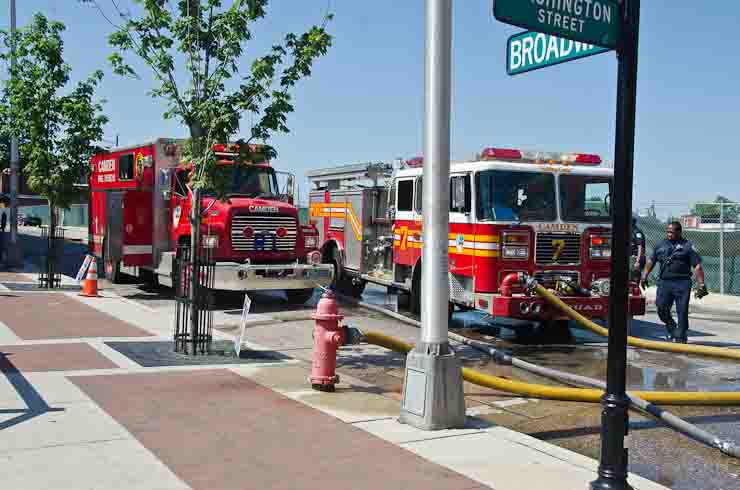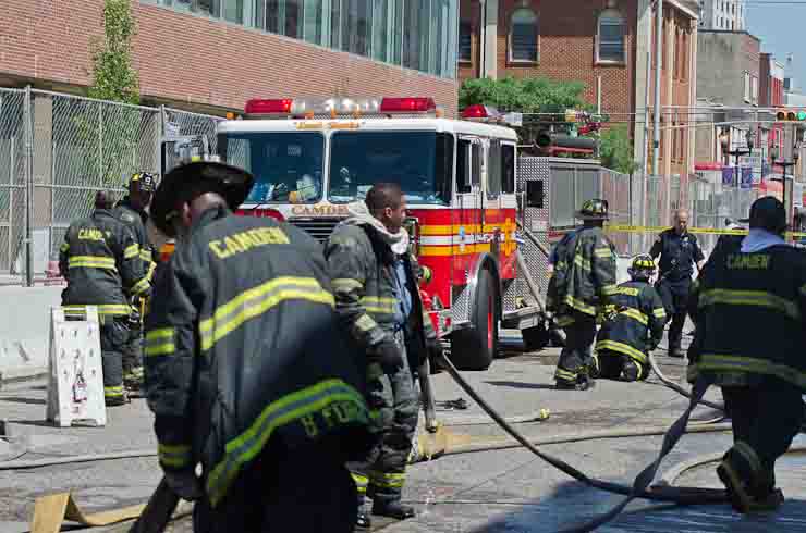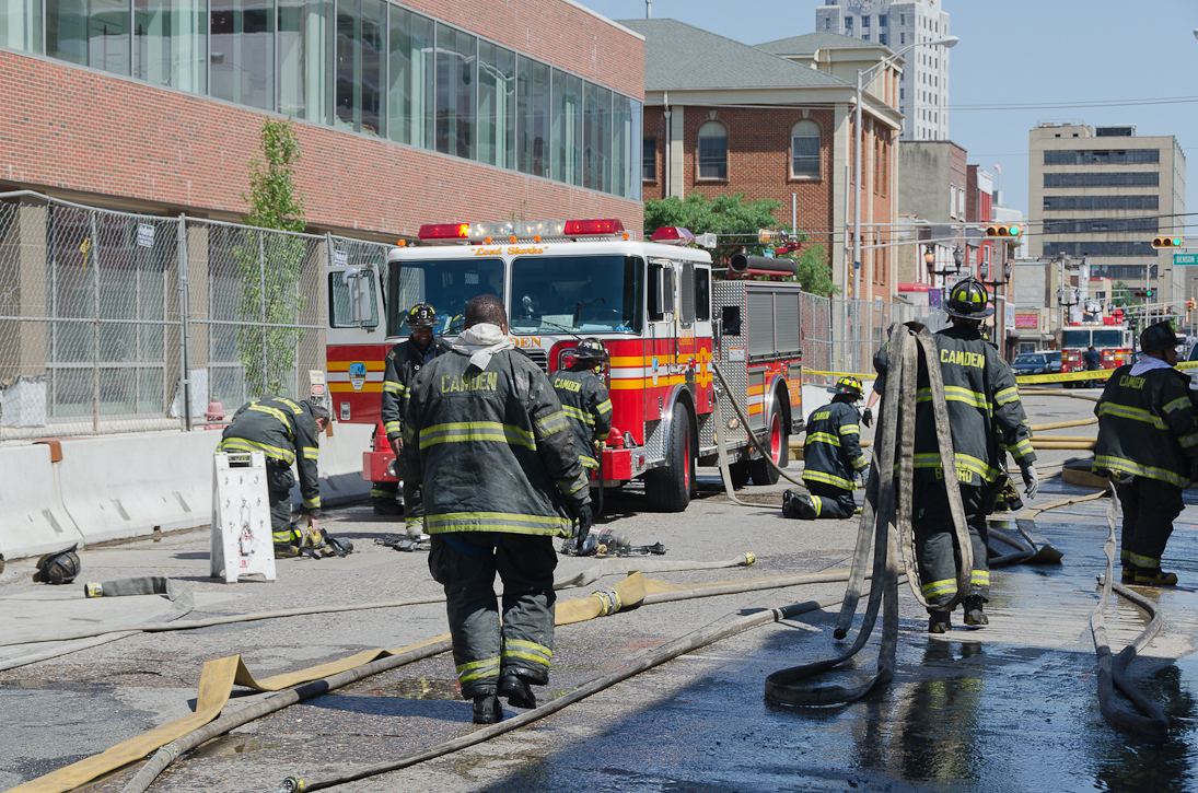 This page and the other pages in this series are the successors to the series of web-page about the Camden Fire Department that began with the page Camden Fire Department: The Fires of the Summer of 2011. On this and other pages in the series you will find pictures and information regarding different events and aspects of the fire service in Camden, New Jersey. On March 23, 2012 the Camden Fire Department put out a fire in a vacant (except for squatters) building at 426 Broadway. On May 31, the Department return to take care of a fire next door, at 424 Broadway, also vacant and also infested by squatters. The Battalion Chief on arrival reported heavy fire showing from the second floor of a three-story dwelling, with a person trapped. Multiple hand lines and two ladders were put into service. A woman was rescued from the second floor and taken to Cooper Trauma Center, firefighters Denis O'Reilly and Victor Torres being the heroes of the day. Besides the photos presented on this page, which I shot, there are many more pictures, taken by Ted Aurig, that can be seen at NewJerseyFireground.com. As with the web page covering other Camden Fire Department events, if you can identify anyone that I've missed, please comment at the bottom of the page. (I'm terrible at at names and faces). June 25, 2012 |