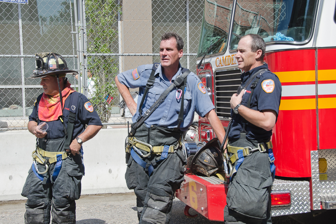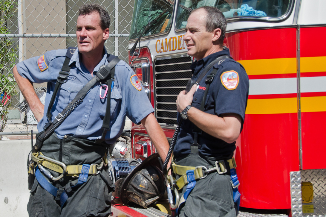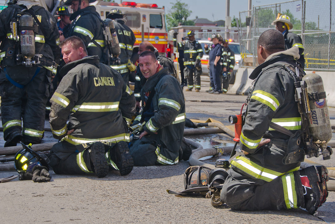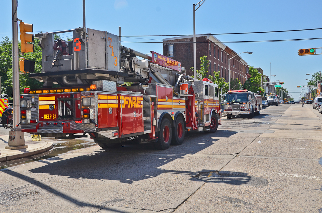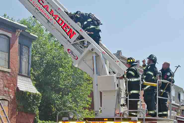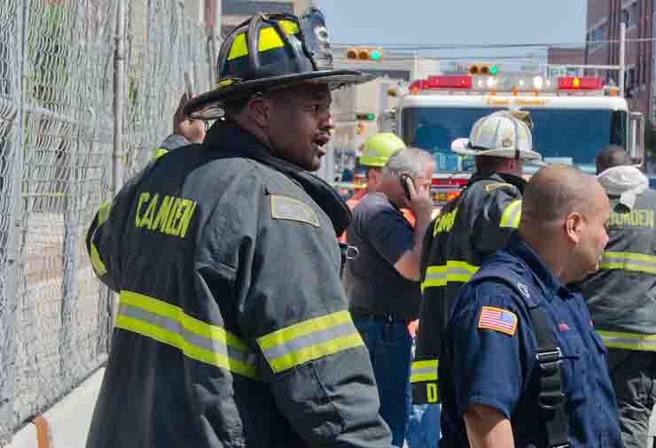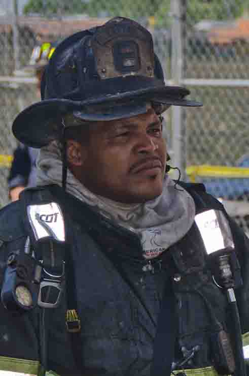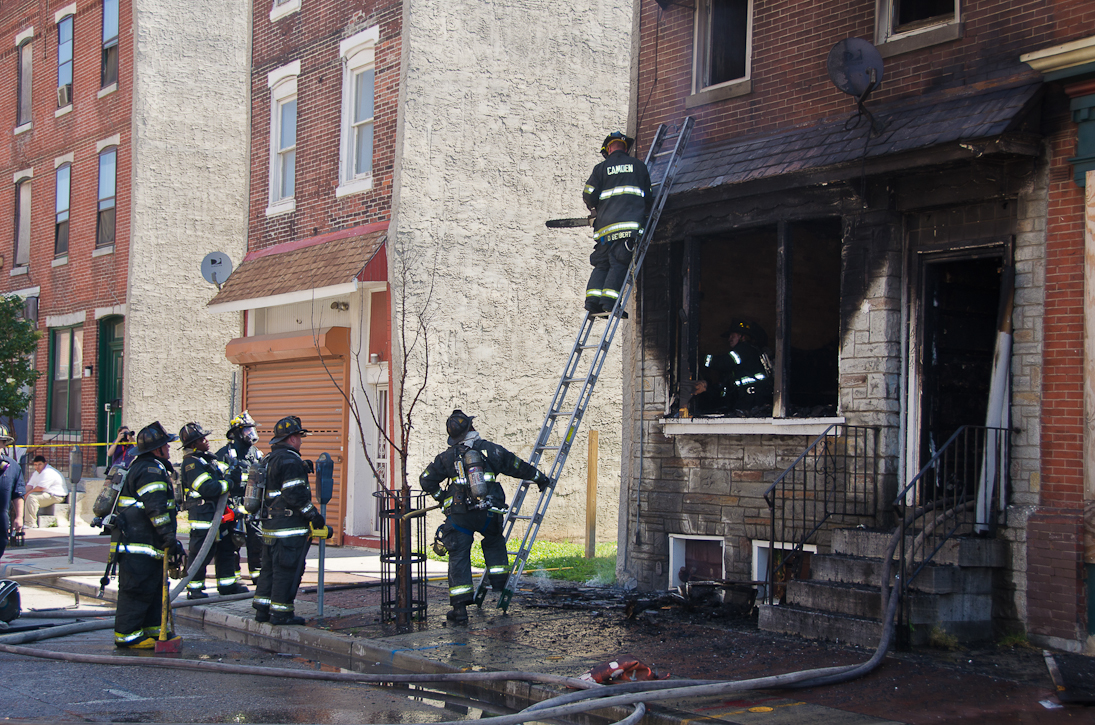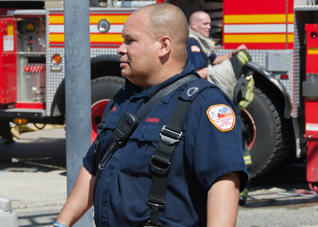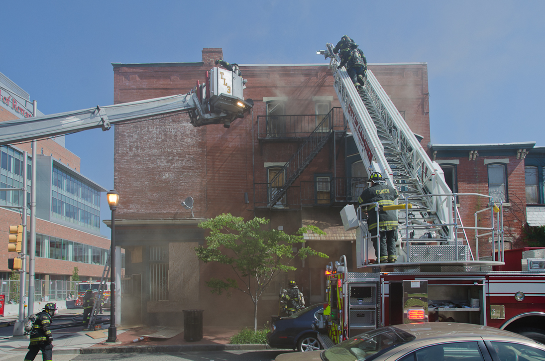 This page and the other pages in this series are the successors to the series of web-page about the Camden Fire Department that began with the page Camden Fire Department: The Fires of the Summer of 2011. On this and other pages in the series you will find pictures and information regarding different events and aspects of the fire service in Camden, New Jersey. On March 23, 2012 the Camden Fire Department put out a fire in a vacant (except for squatters) building at 426 Broadway. On May 31, the Department return to take care of a fire next door, at 424 Broadway, also vacant and also infested by squatters. The Battalion Chief on arrival reported heavy fire showing from the second floor of a three-story dwelling, with a person trapped. Multiple hand lines and two ladders were put into service. A woman was rescued from the second floor and taken to Cooper Trauma Center, firefighters Denis O'Reilly and Victor Torres being the heroes of the day. Besides the photos presented on this page, which I shot, there are many more pictures, taken by Ted Aurig, that can be seen at NewJerseyFireground.com. As with the web page covering other Camden Fire Department events, if you can identify anyone that I've missed, please comment at the bottom of the page. (I'm terrible at at names and faces). June 25, 2012 |