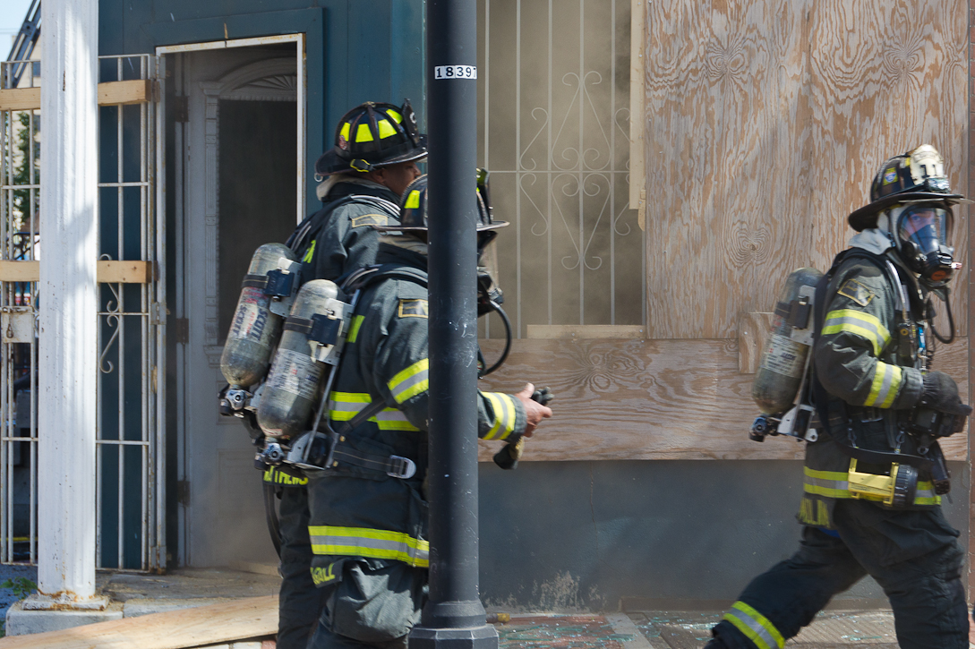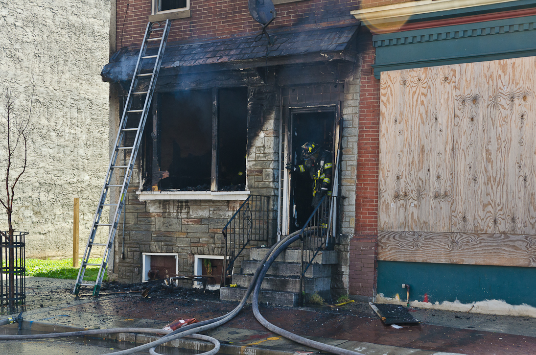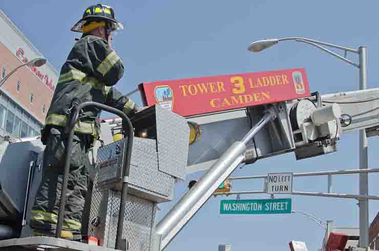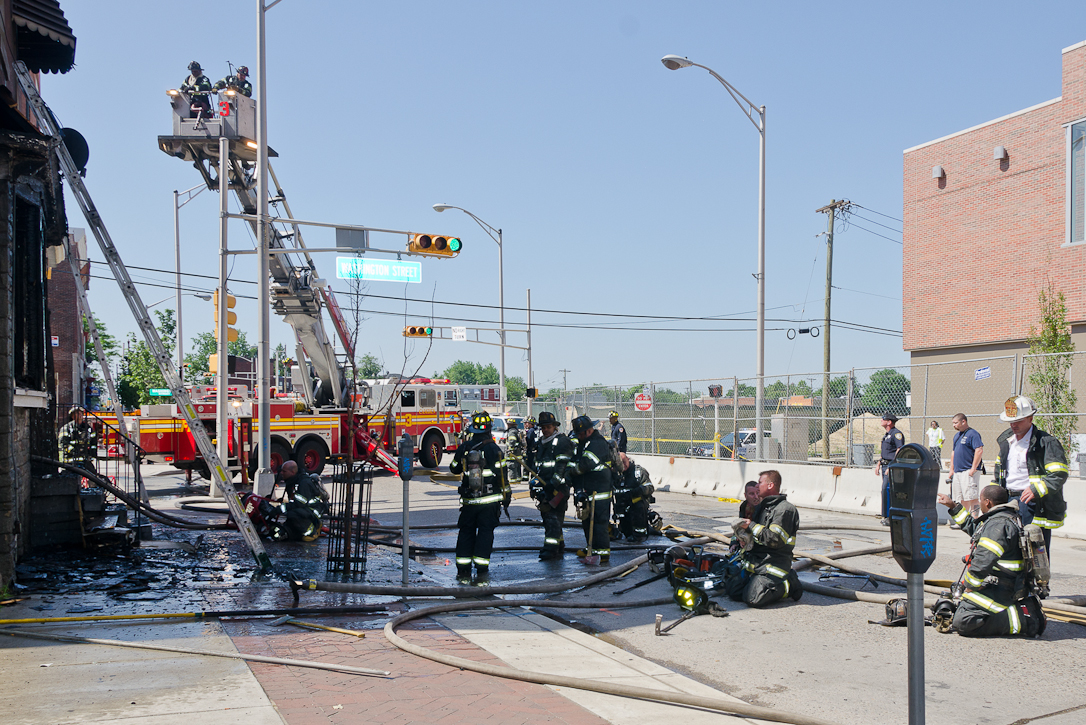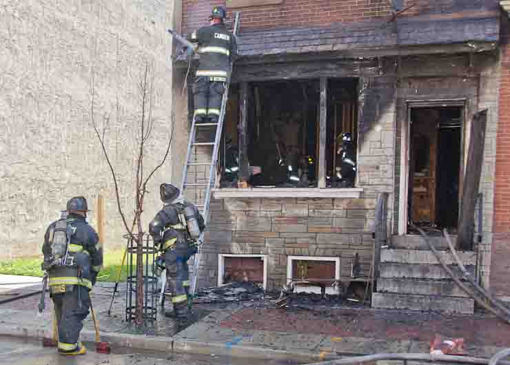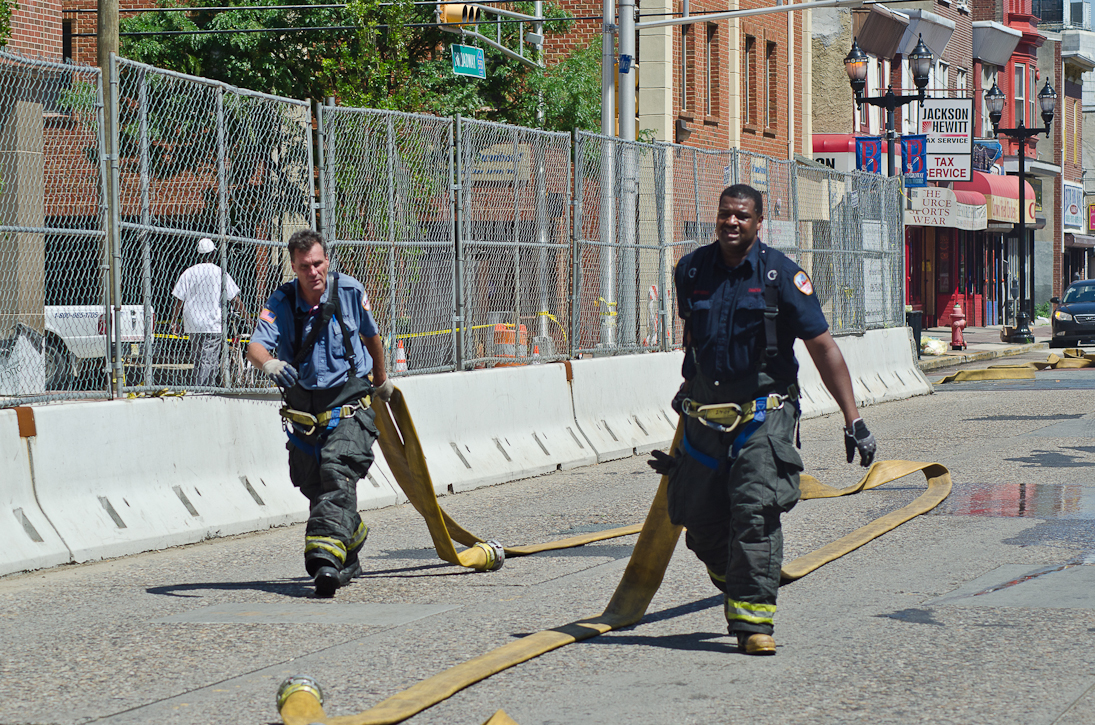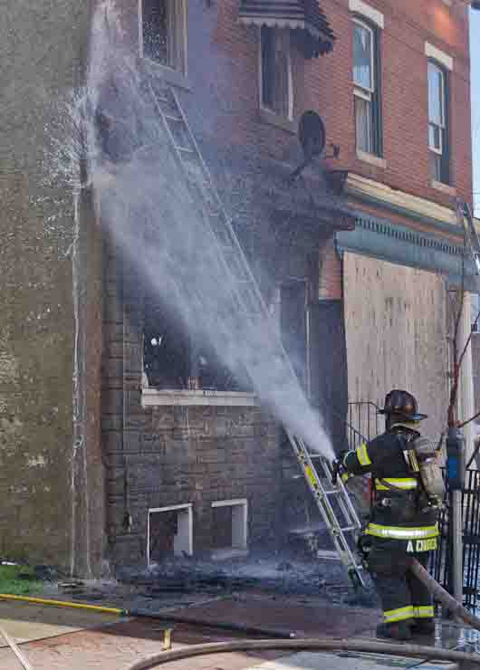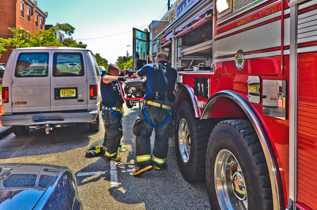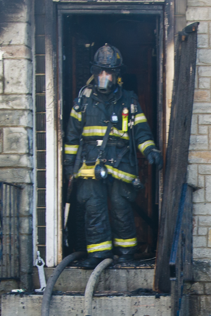 This page and the other pages in this series are the successors to the series of web-page about the Camden Fire Department that began with the page Camden Fire Department: The Fires of the Summer of 2011. On this and other pages in the series you will find pictures and information regarding different events and aspects of the fire service in Camden, New Jersey. On March 23, 2012 the Camden Fire Department put out a fire in a vacant (except for squatters) building at 426 Broadway. On May 31, the Department return to take care of a fire next door, at 424 Broadway, also vacant and also infested by squatters. The Battalion Chief on arrival reported heavy fire showing from the second floor of a three-story dwelling, with a person trapped. Multiple hand lines and two ladders were put into service. A woman was rescued from the second floor and taken to Cooper Trauma Center, firefighters Denis O'Reilly and Victor Torres being the heroes of the day. Besides the photos presented on this page, which I shot, there are many more pictures, taken by Ted Aurig, that can be seen at NewJerseyFireground.com. As with the web page covering other Camden Fire Department events, if you can identify anyone that I've missed, please comment at the bottom of the page. (I'm terrible at at names and faces). June 25, 2012 |