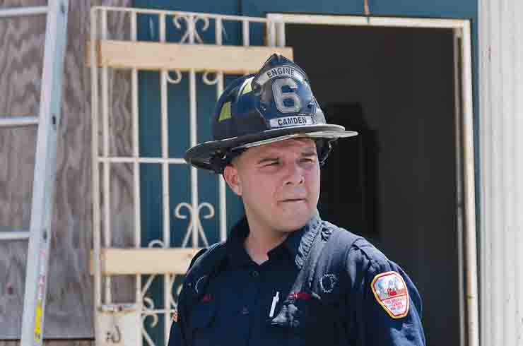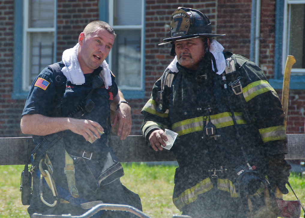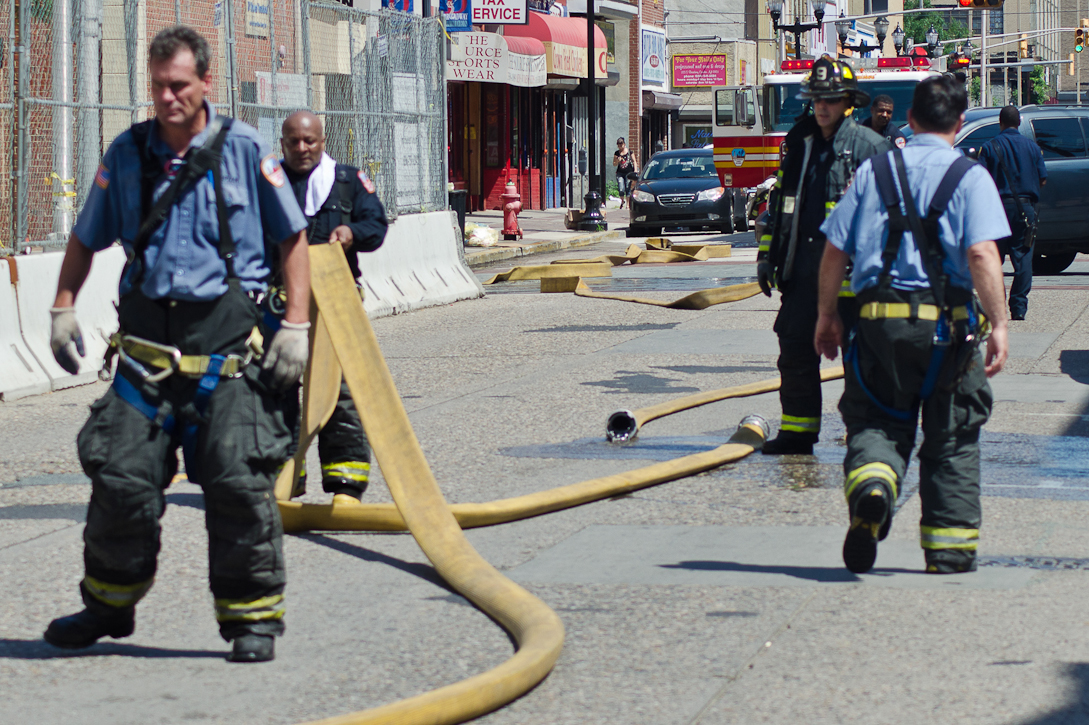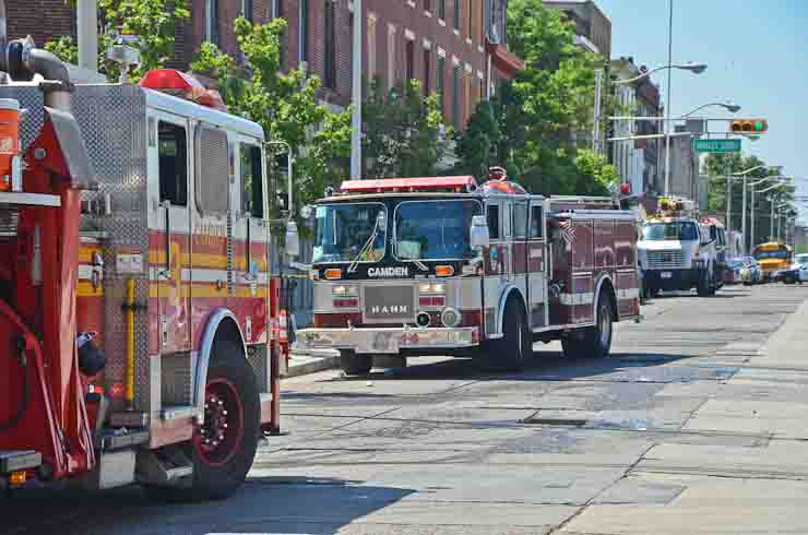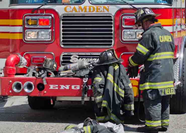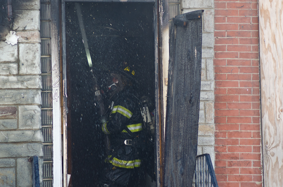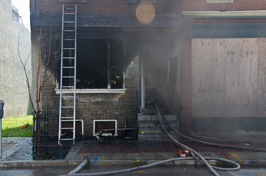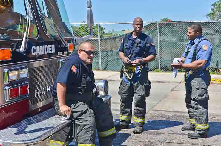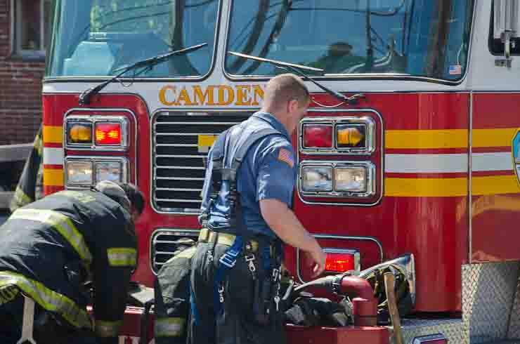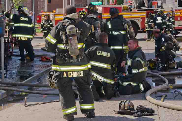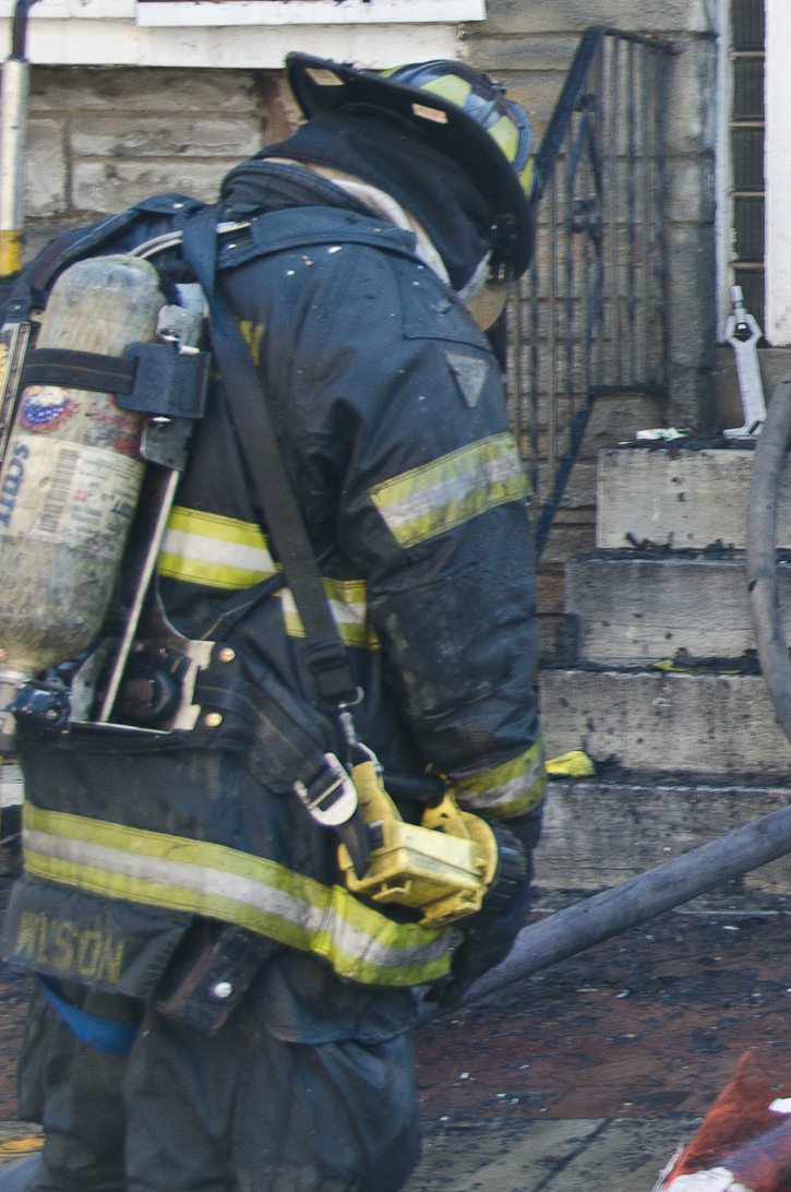 This page and the other pages in this series are the successors to the series of web-page about the Camden Fire Department that began with the page Camden Fire Department: The Fires of the Summer of 2011. On this and other pages in the series you will find pictures and information regarding different events and aspects of the fire service in Camden, New Jersey. On March 23, 2012 the Camden Fire Department put out a fire in a vacant (except for squatters) building at 426 Broadway. On May 31, the Department return to take care of a fire next door, at 424 Broadway, also vacant and also infested by squatters. The Battalion Chief on arrival reported heavy fire showing from the second floor of a three-story dwelling, with a person trapped. Multiple hand lines and two ladders were put into service. A woman was rescued from the second floor and taken to Cooper Trauma Center, firefighters Denis O'Reilly and Victor Torres being the heroes of the day. Besides the photos presented on this page, which I shot, there are many more pictures, taken by Ted Aurig, that can be seen at NewJerseyFireground.com. As with the web page covering other Camden Fire Department events, if you can identify anyone that I've missed, please comment at the bottom of the page. (I'm terrible at at names and faces). June 25, 2012 |