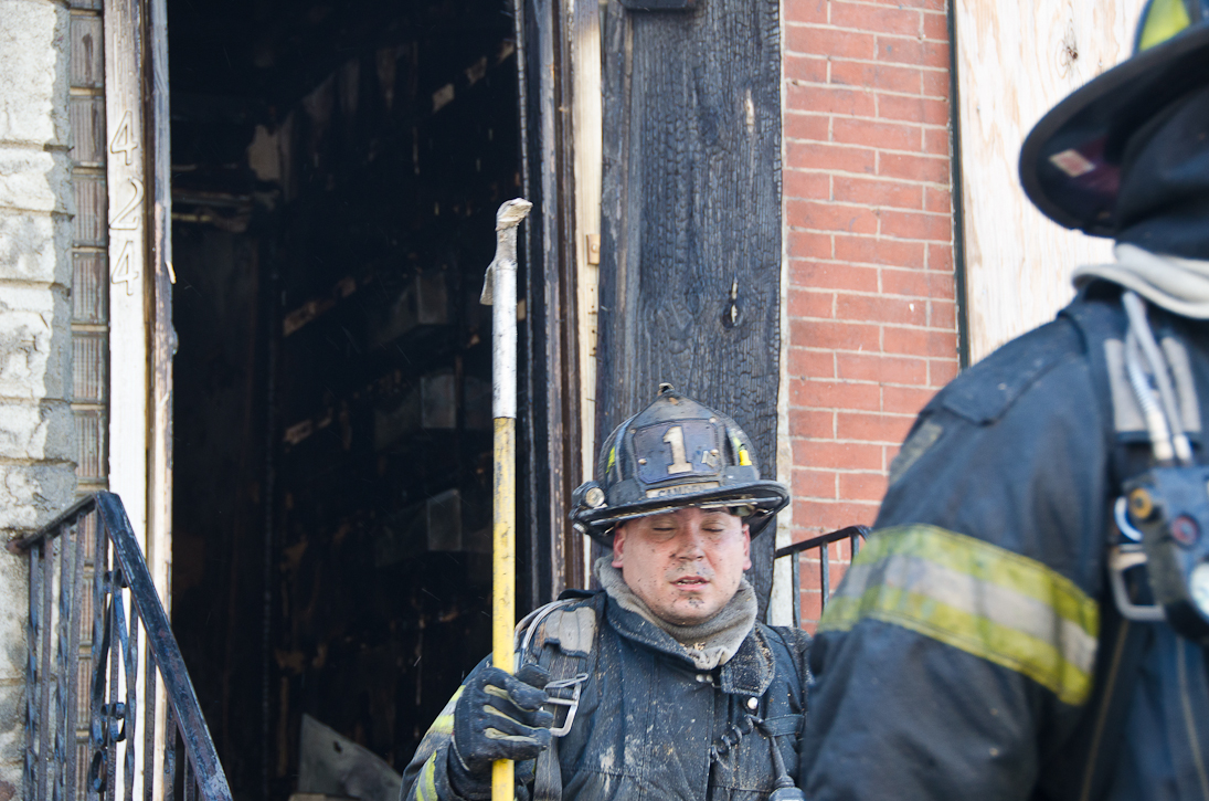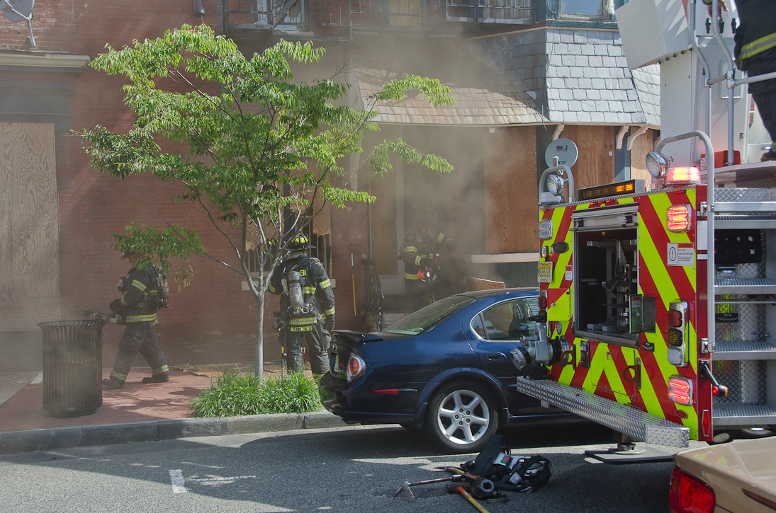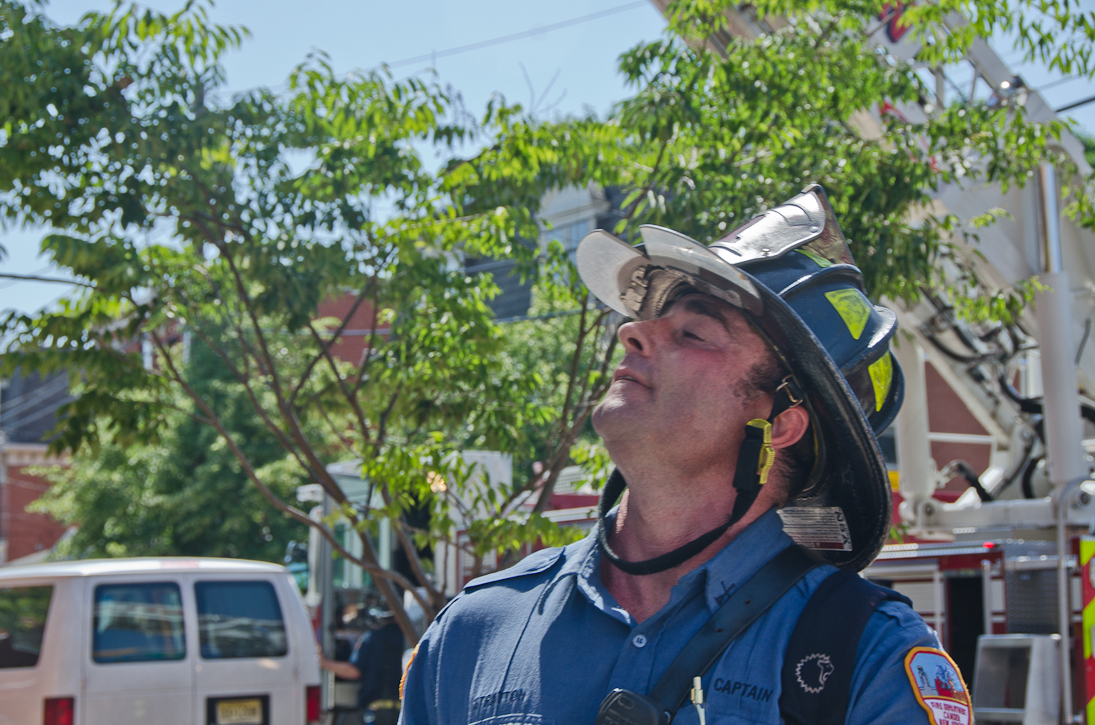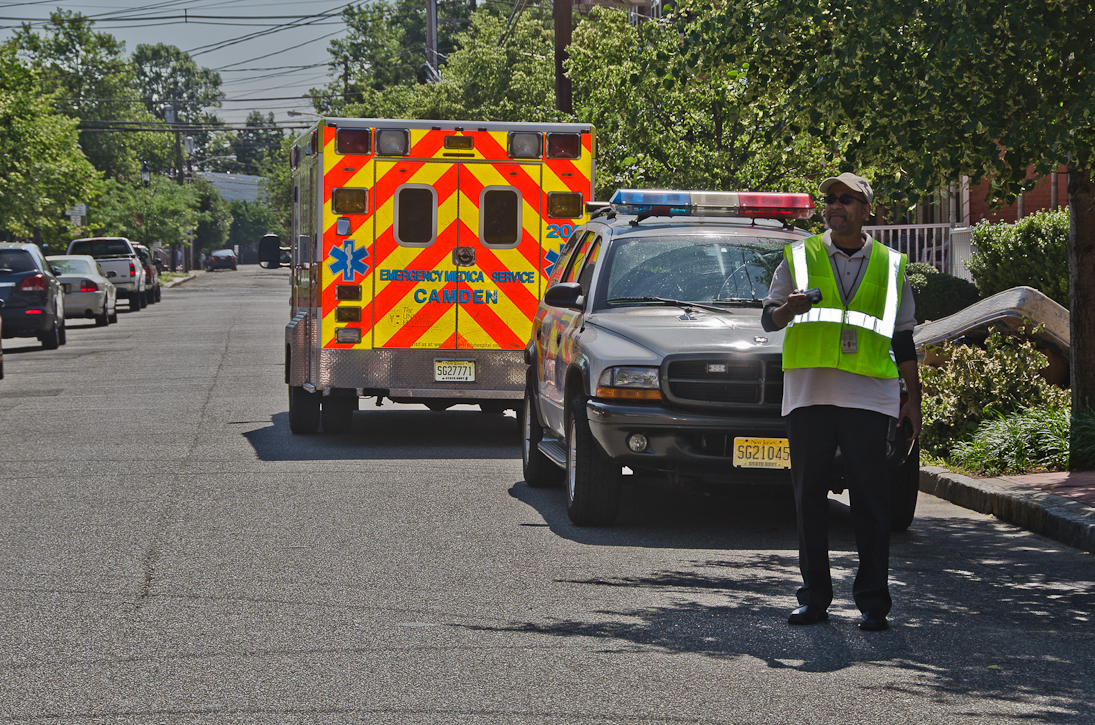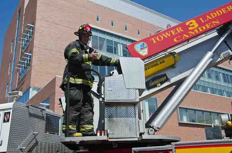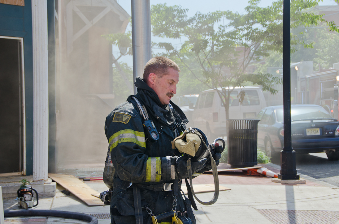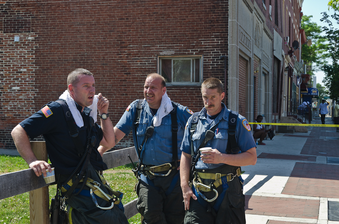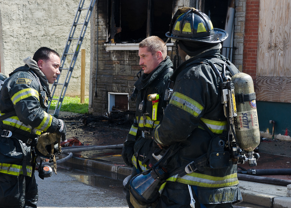 This page and the other pages in this series are the successors to the series of web-page about the Camden Fire Department that began with the page Camden Fire Department: The Fires of the Summer of 2011. On this and other pages in the series you will find pictures and information regarding different events and aspects of the fire service in Camden, New Jersey. On March 23, 2012 the Camden Fire Department put out a fire in a vacant (except for squatters) building at 426 Broadway. On May 31, the Department return to take care of a fire next door, at 424 Broadway, also vacant and also infested by squatters. The Battalion Chief on arrival reported heavy fire showing from the second floor of a three-story dwelling, with a person trapped. Multiple hand lines and two ladders were put into service. A woman was rescued from the second floor and taken to Cooper Trauma Center, firefighters Denis O'Reilly and Victor Torres being the heroes of the day. Besides the photos presented on this page, which I shot, there are many more pictures, taken by Ted Aurig, that can be seen at NewJerseyFireground.com. As with the web page covering other Camden Fire Department events, if you can identify anyone that I've missed, please comment at the bottom of the page. (I'm terrible at at names and faces). June 25, 2012 |