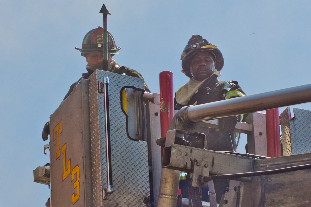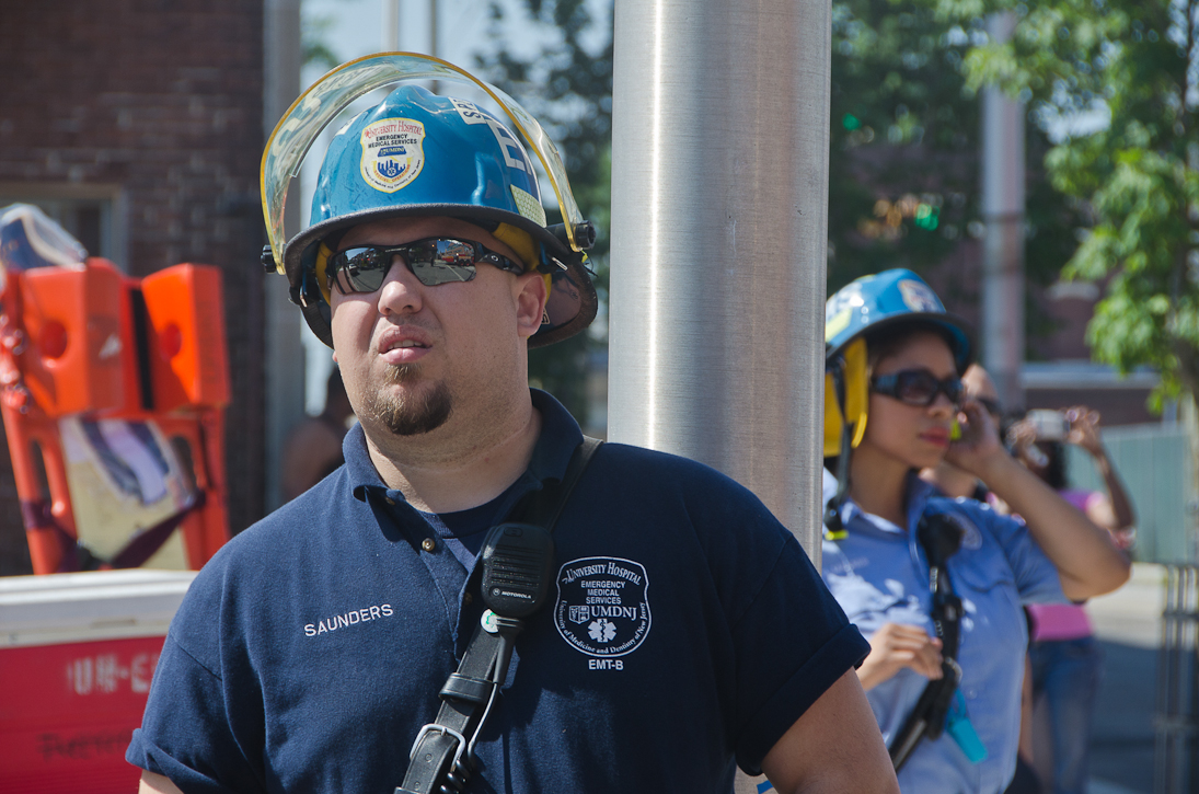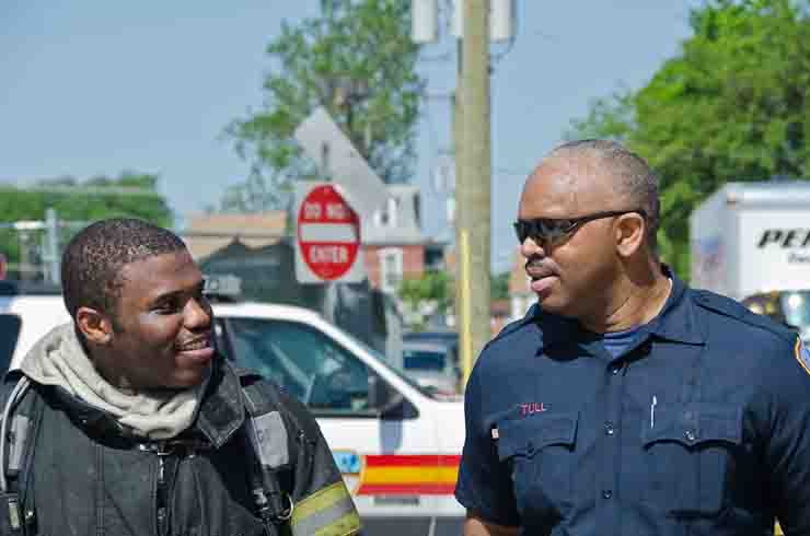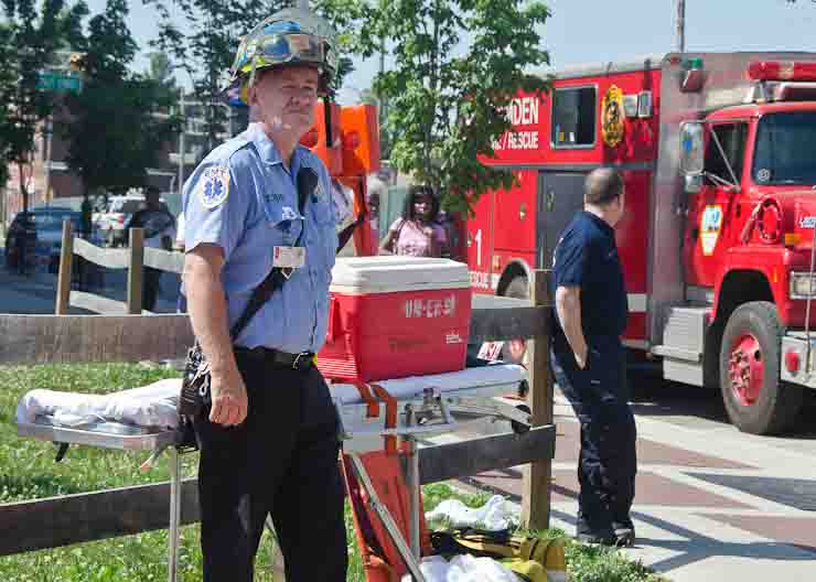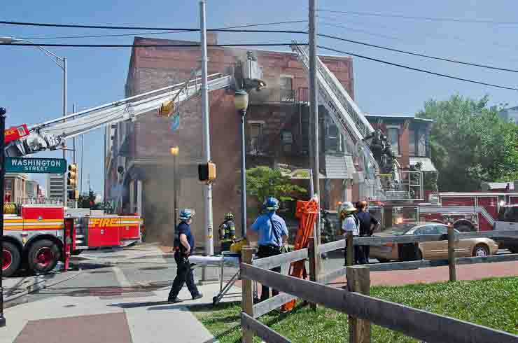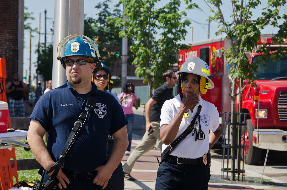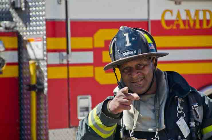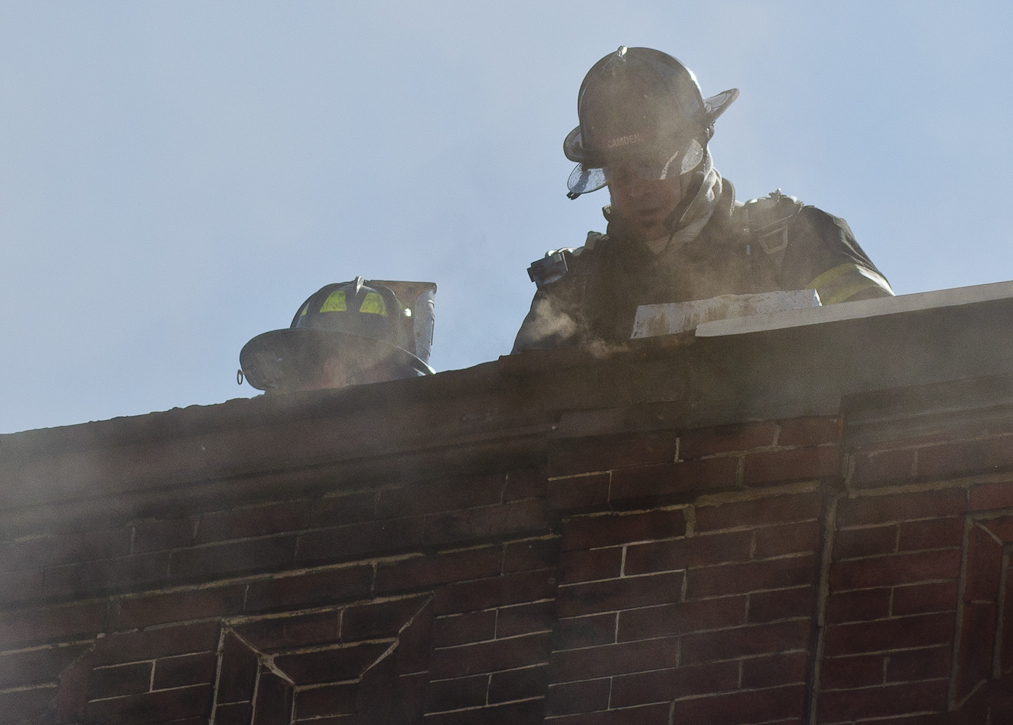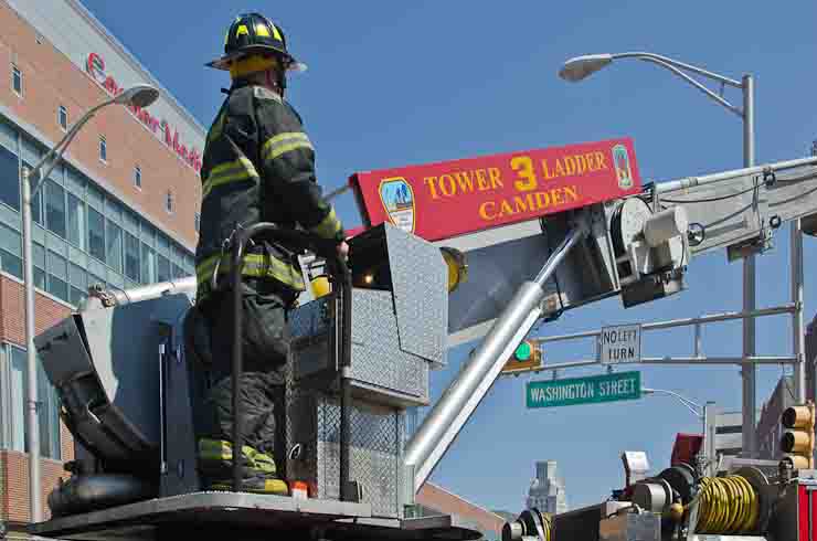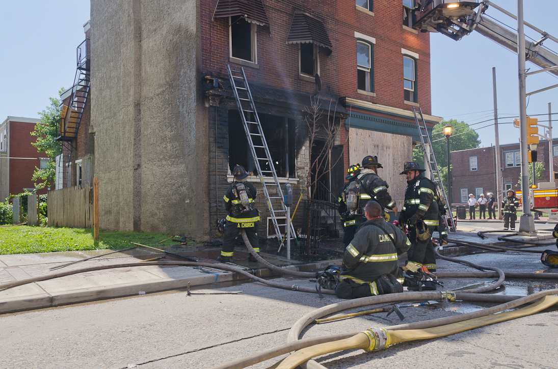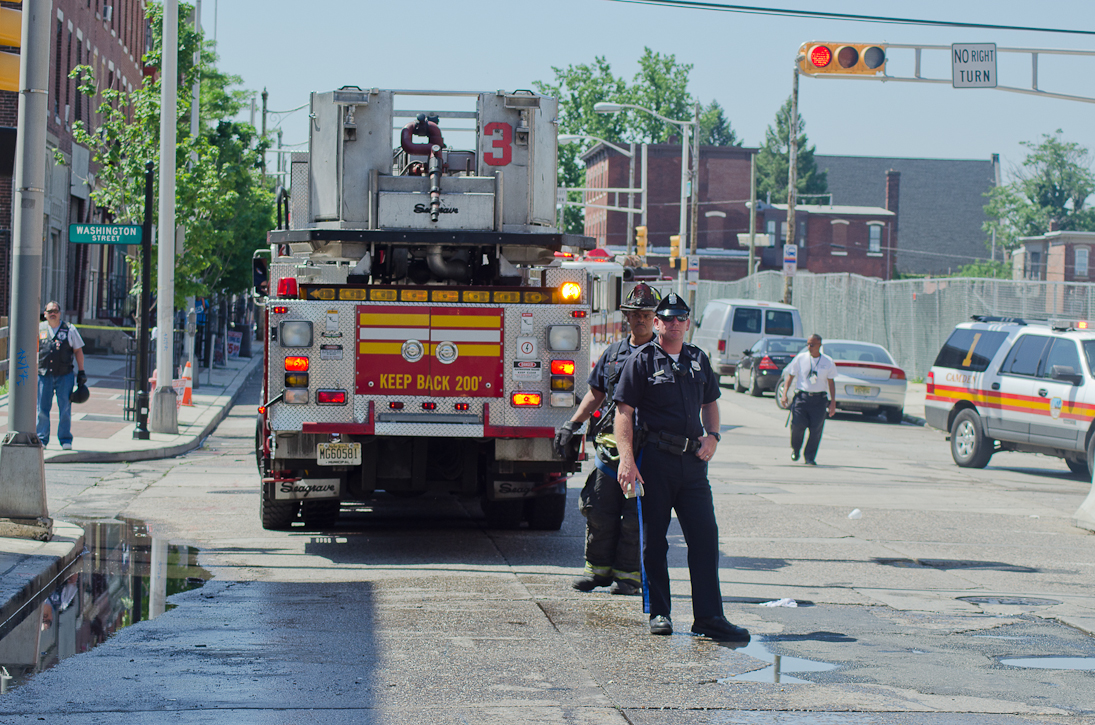 This page and the other pages in this series are the successors to the series of web-page about the Camden Fire Department that began with the page Camden Fire Department: The Fires of the Summer of 2011. On this and other pages in the series you will find pictures and information regarding different events and aspects of the fire service in Camden, New Jersey. On March 23, 2012 the Camden Fire Department put out a fire in a vacant (except for squatters) building at 426 Broadway. On May 31, the Department return to take care of a fire next door, at 424 Broadway, also vacant and also infested by squatters. The Battalion Chief on arrival reported heavy fire showing from the second floor of a three-story dwelling, with a person trapped. Multiple hand lines and two ladders were put into service. A woman was rescued from the second floor and taken to Cooper Trauma Center, firefighters Denis O'Reilly and Victor Torres being the heroes of the day. Besides the photos presented on this page, which I shot, there are many more pictures, taken by Ted Aurig, that can be seen at NewJerseyFireground.com. As with the web page covering other Camden Fire Department events, if you can identify anyone that I've missed, please comment at the bottom of the page. (I'm terrible at at names and faces). June 25, 2012 |