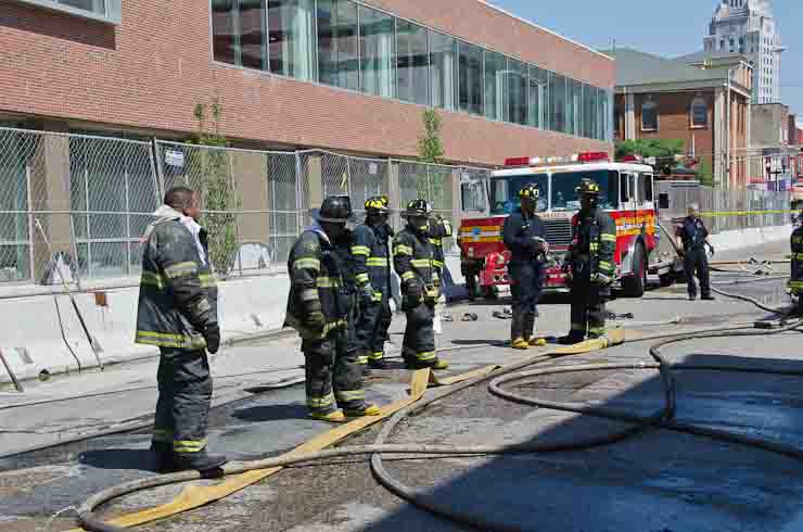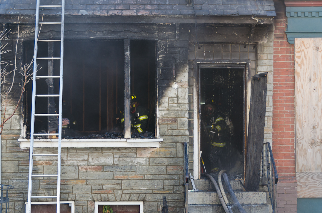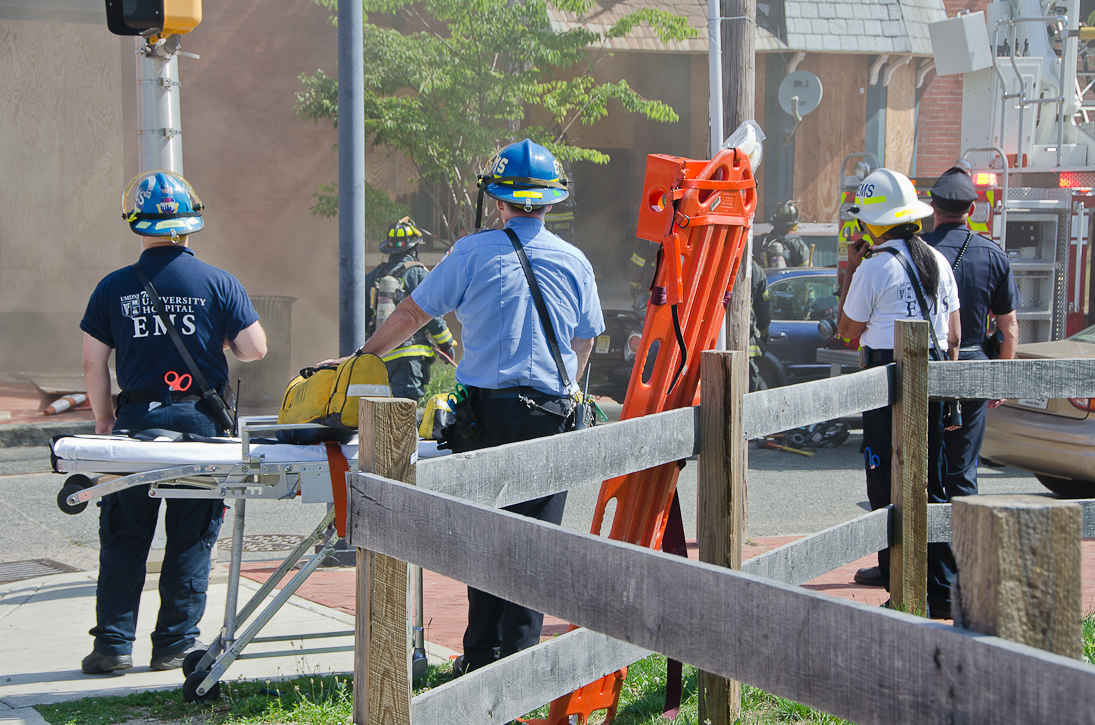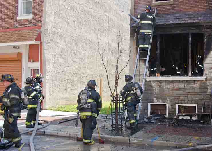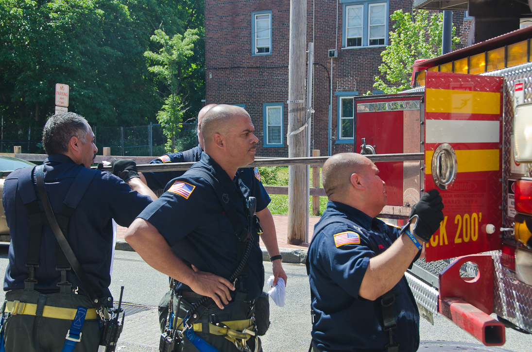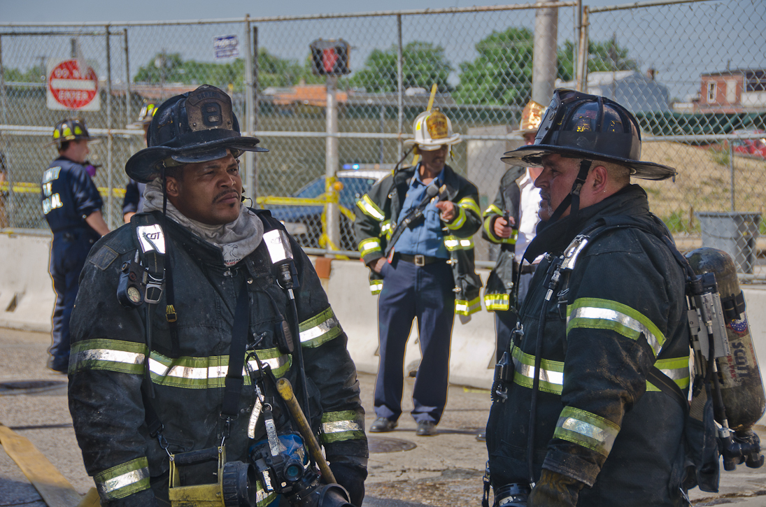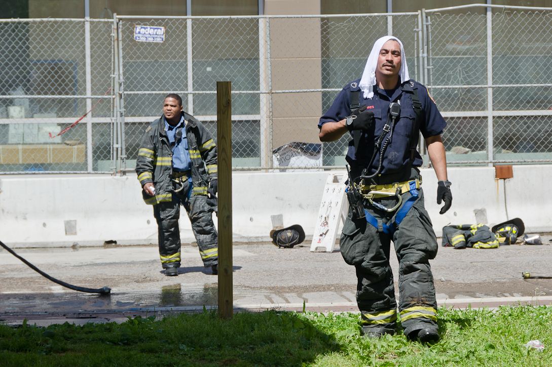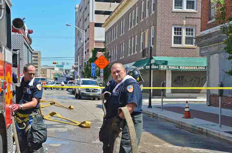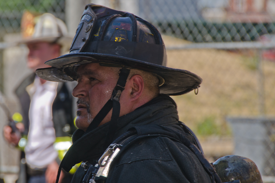 This page and the other pages in this series are the successors to the series of web-page about the Camden Fire Department that began with the page Camden Fire Department: The Fires of the Summer of 2011. On this and other pages in the series you will find pictures and information regarding different events and aspects of the fire service in Camden, New Jersey. On March 23, 2012 the Camden Fire Department put out a fire in a vacant (except for squatters) building at 426 Broadway. On May 31, the Department return to take care of a fire next door, at 424 Broadway, also vacant and also infested by squatters. The Battalion Chief on arrival reported heavy fire showing from the second floor of a three-story dwelling, with a person trapped. Multiple hand lines and two ladders were put into service. A woman was rescued from the second floor and taken to Cooper Trauma Center, firefighters Denis O'Reilly and Victor Torres being the heroes of the day. Besides the photos presented on this page, which I shot, there are many more pictures, taken by Ted Aurig, that can be seen at NewJerseyFireground.com. As with the web page covering other Camden Fire Department events, if you can identify anyone that I've missed, please comment at the bottom of the page. (I'm terrible at at names and faces). June 25, 2012 |