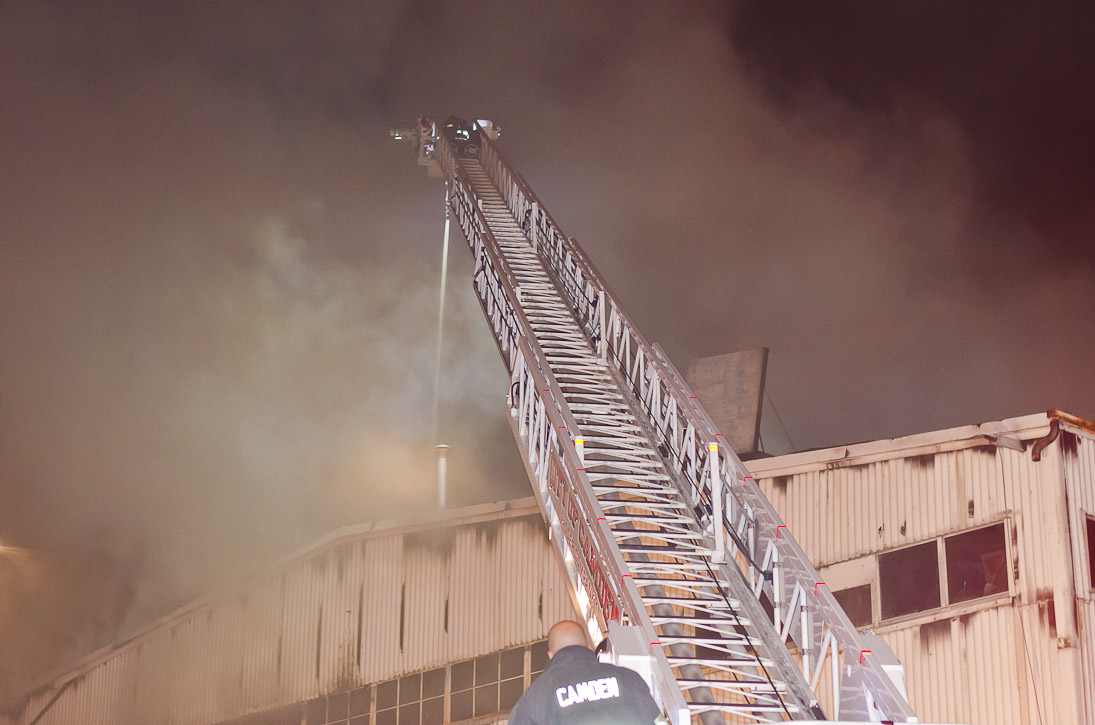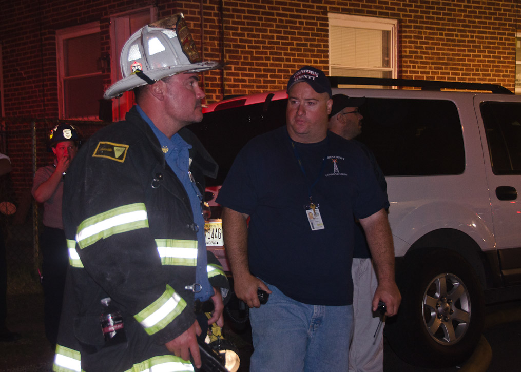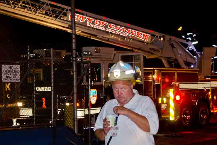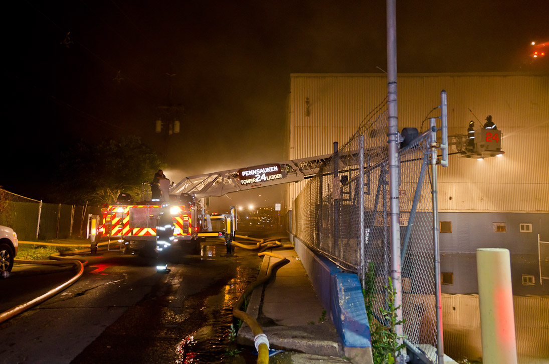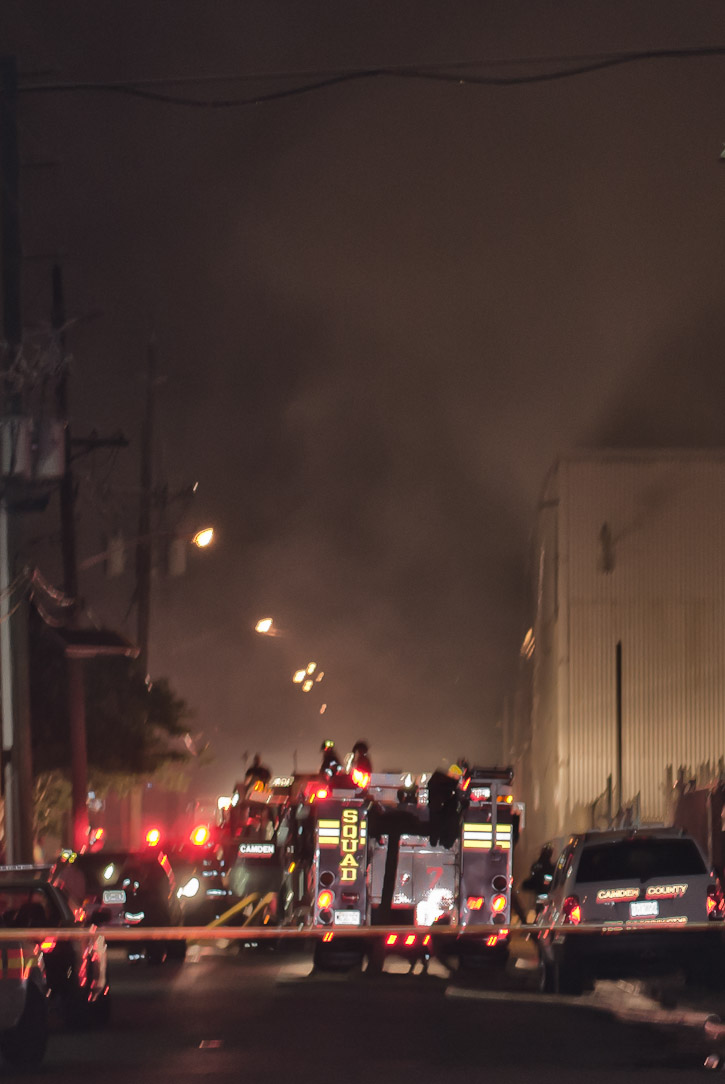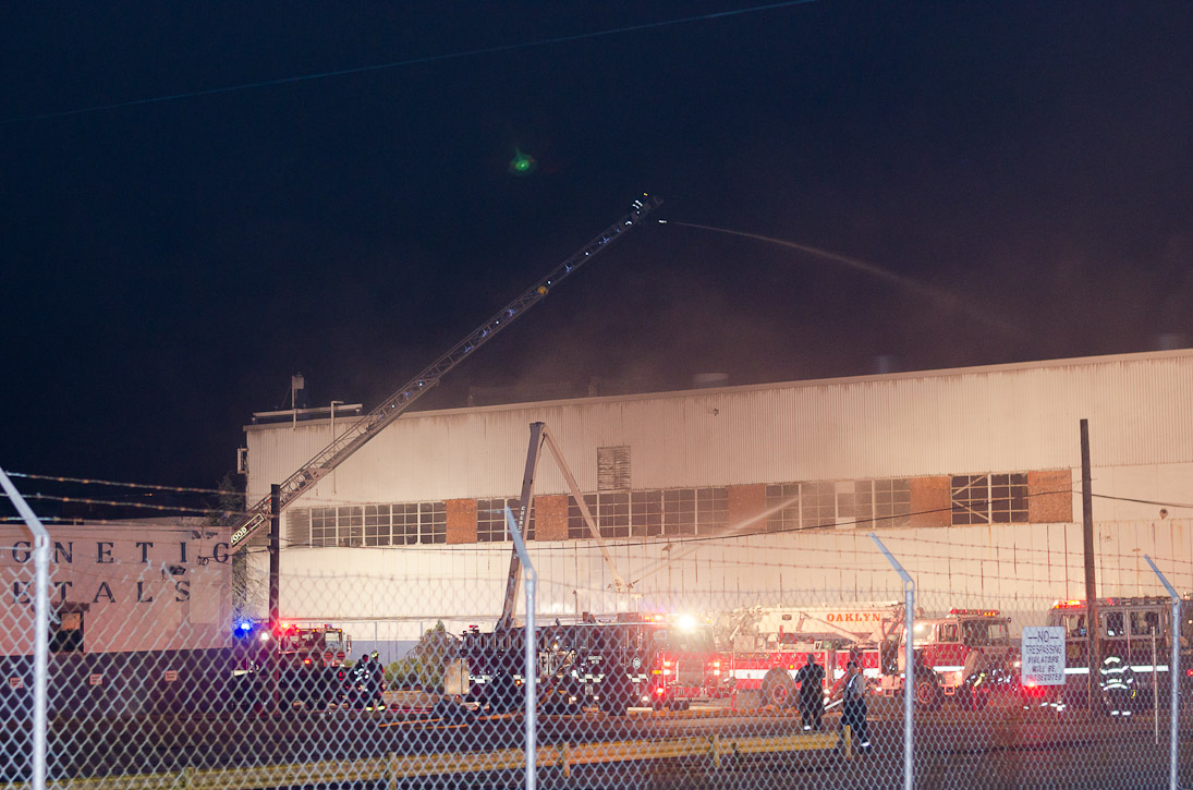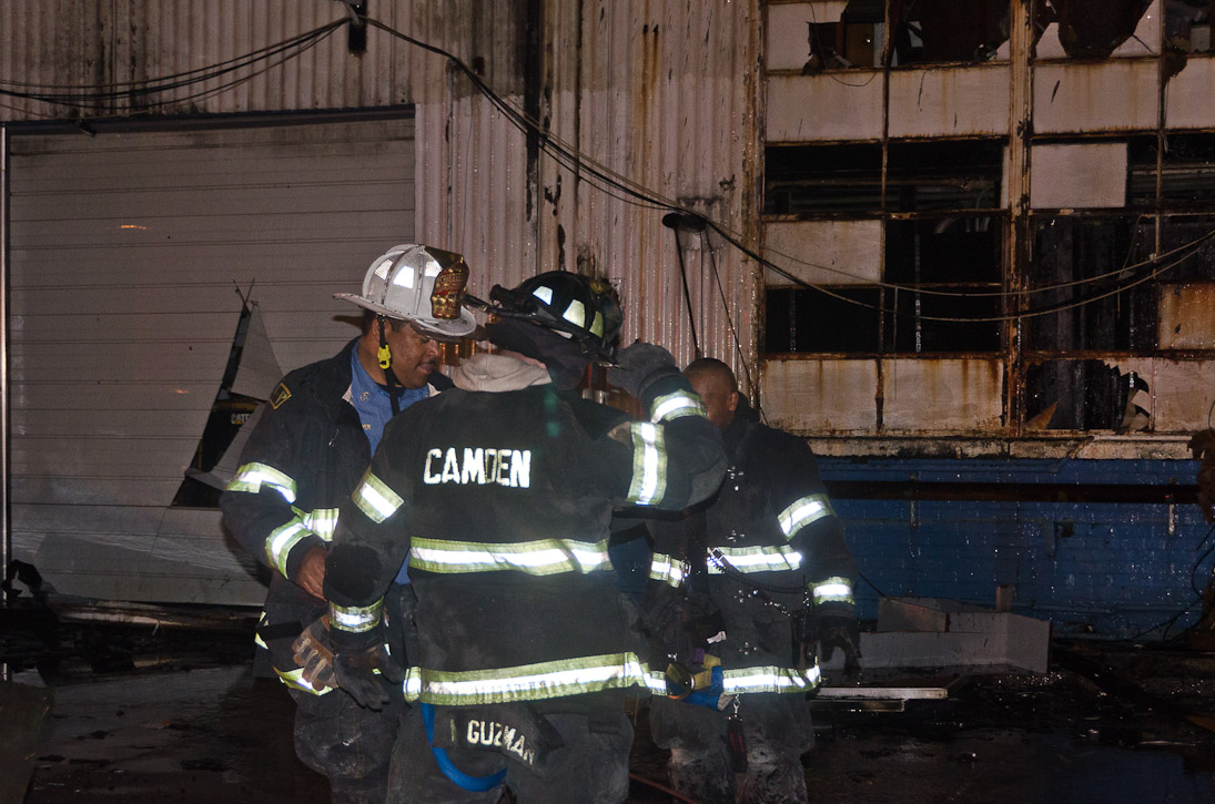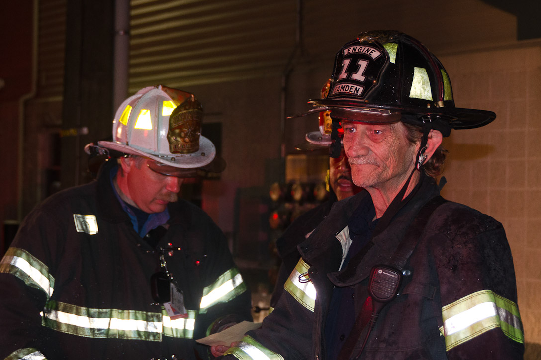 Magnetic Metals Corporation has been in operation on Hayes Avenue in the Cramer Hill section of Camden since 1942, manufacturing high grade nickel alloy laminations. The biggest fire to date in 2012, a building that was in the process of being emptied out caught fire around 11:00 PM on June 18, 2012. The fire went to six alarms before being brought under control. I arrived on scene at about the 13 minute mark, took my first shot at 11:07 AM, and was still there well over five hours later, taking my last shot at 4:45 AM. When I returned a few hours later, Engine 11 was still operating, wetting down hot spots. This is the third of four pages of photos of this fire. Links to continue to the next page, return to the first page, or skip ahead are at the bottom of this page. The photos are for the most part presented in the order in which they were taken… I was using two cameras, some photos taken in the same minute on each camera may be sequenced wrong, but that's small stuff! As with the web page covering other Camden Fire Department events, if you can identify anyone that I've missed, please comment at the bottom of the page. (I'm terrible at at names and faces). June 26, 2012 |